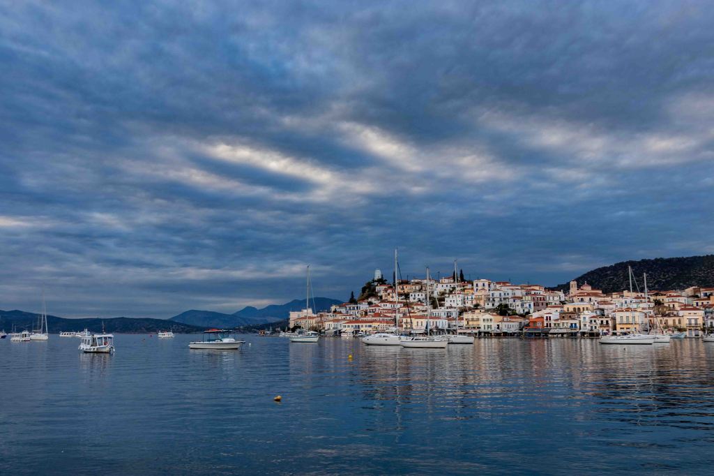 Das Wetter trübt sich etwas ein. Es bleibt zwar frühlingshaft warm, doch ziehen nun dunkle Wolken über den Himmel. So bleiben wir in GALATAS, kaufen bei dem uns schon bekannten Metzger ein, und genießen den Blick auf die idyllische Insel Poros. Auf die Insel fahren wir nicht, haben wir doch vom gegenüberliegenden Ufer, dem Reiseführer zufolge vom häßlichen Entlein aus, den schöneren Blick auf das Städtchen.