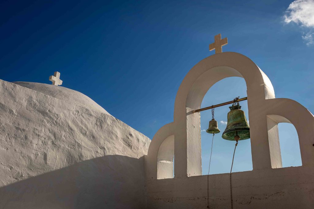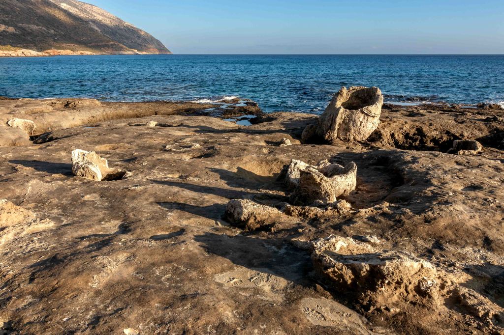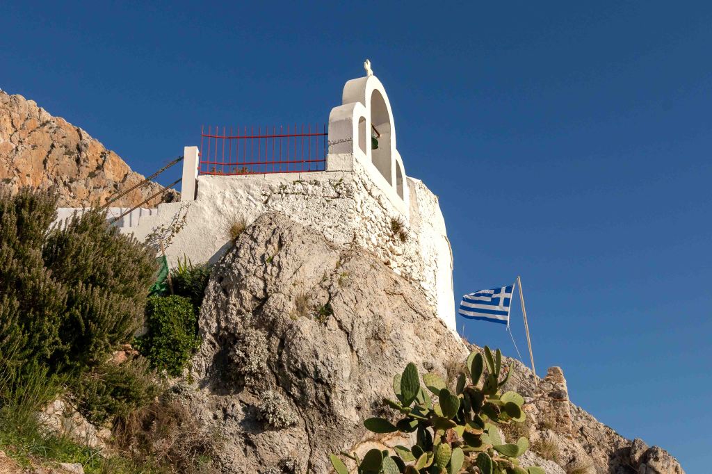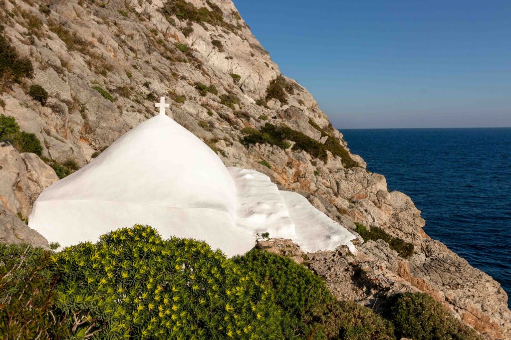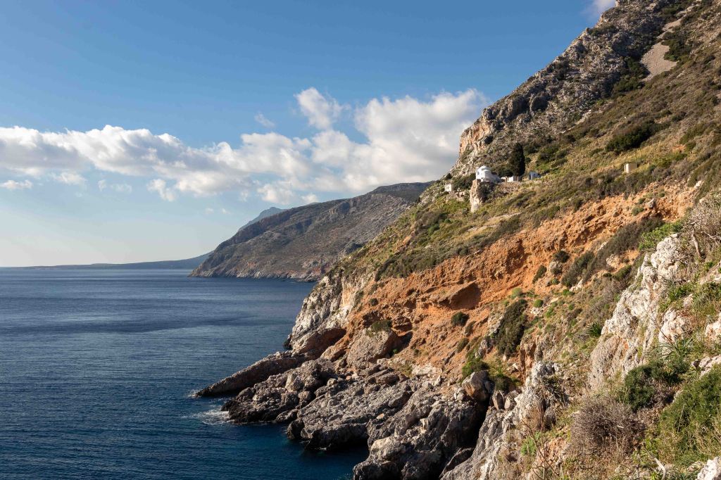 Mittlerweile führt eine neue Teerstraße zum Ausgang einer kleinen Wanderung. Erst geht es bequem auf einer Piste, dann im ständigen bergauf und bergab entlang der Steilküste ans Ende der Welt. Nach gut zwei Stunden erreiche ich das verlassen Kloster Agia Irina. Noch ein paar Meter weiter schmiegen sich die Ruinen des Klosters Agios Georgios an den Felsen. Nur ein paar Meter tiefer plätschern die Wellen an das Kap Meléas. Seit gut vier Wochen weht meist nur ein laues Lüftchen und oft ist das Meer spiegelglatt.