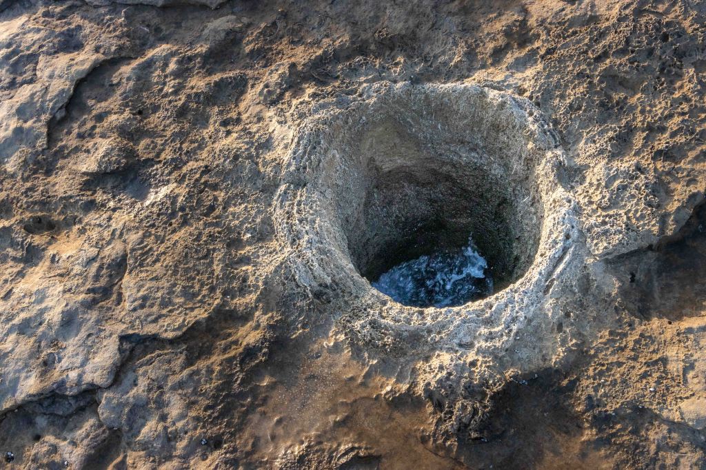 Auf dem Rückweg gibt es noch eine kleine Sehenswürdigkeit zu bestaunen, einen steinernen Wald. Zahlreiche, bis zu einen Meter hohe, versteinerte Baumstümpfe stehen am felsigen Strand. In einigen der hohlen Stämme gluckert das Wasser.