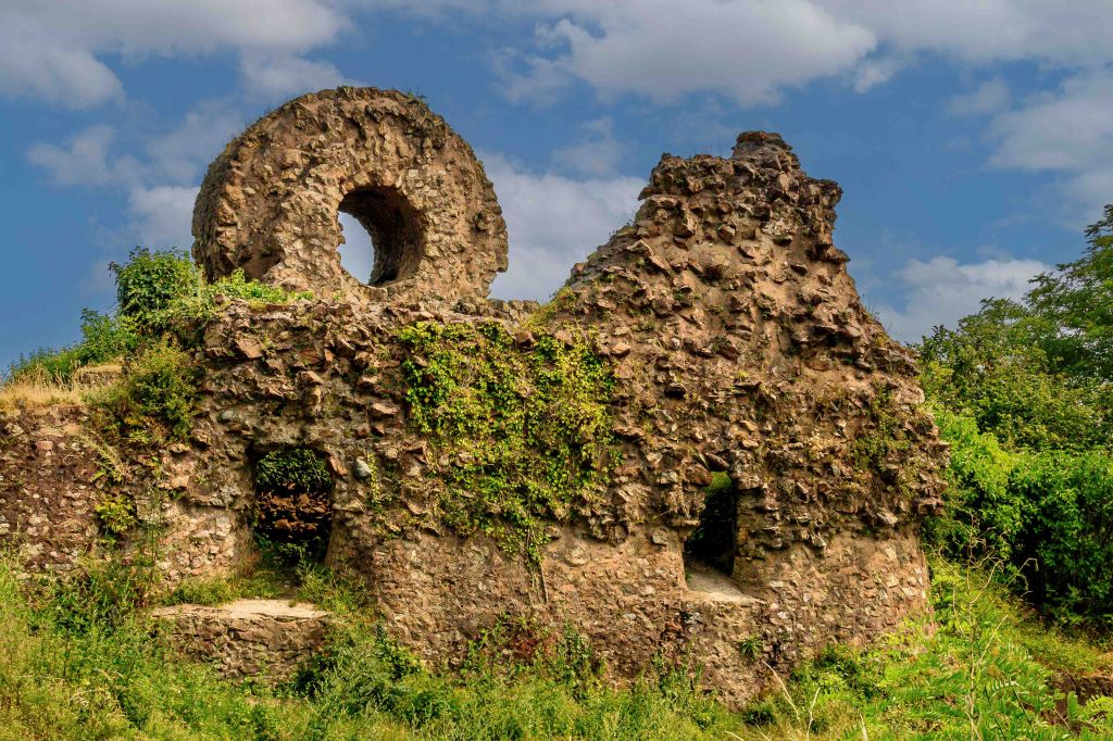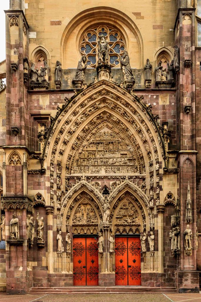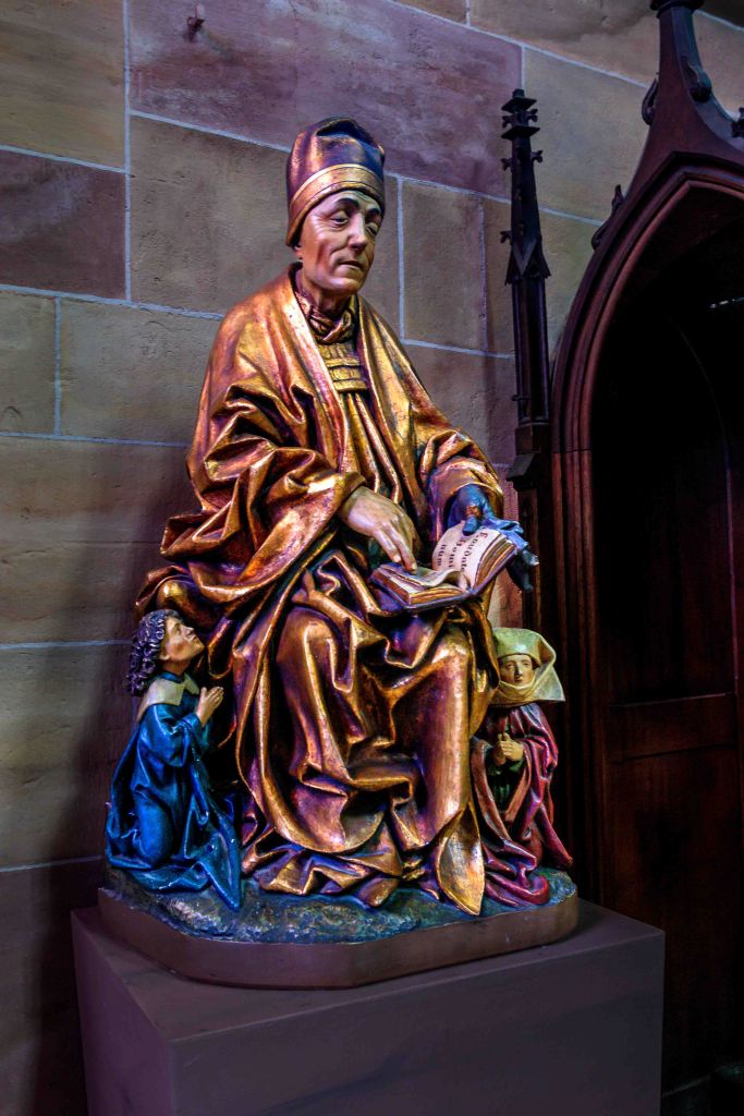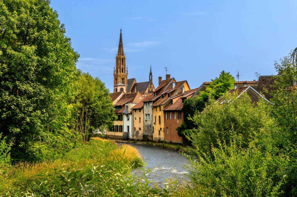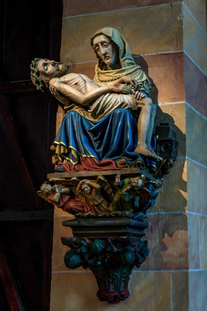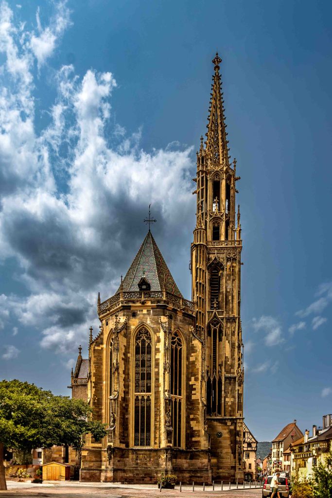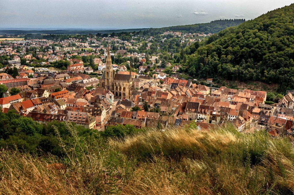 Nach dem Schrecken in der Hagelnacht fahren wir von Grand Ballon hinunter ins Städtchen Thann. Besonders stolz sind die Einwohner auf den Turm der Elise St-Thiébaut, den sie gerne mit denen in Straßburg und Freiburg vergleichen: „Der Straßburger Turm ist der höchste, der Freiburger der mächtigste, aber der von Thann der schönste.“ Das über den Ort liegende Château de l’Engelbourg bewachte einst die wichtige Handelsstraße zwischen Holland und Italien. Nachdem es Truppen Ludwigs XIV. zerstörten, sind heute nur noch die Reste des ehemaligen Bergfrieds zu sehen. Übrig blieb nach einer gewaltigen Explosion das Hexenauge.