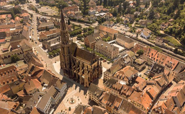 Nach dem Schrecken in der Hagelnacht fahren wir von Grand Ballon hinunter ins Städtchen Thann. Besonders stolz sind die Einwohner auf den Turm der Elise St-Thiébaut, den sie gerne mit denen in Straßburg und Freiburg vergleichen: „Der Straßburger Turm ist der höchste, der Freiburger der mächtigste, aber der von Thann der schönste.“ Das über den Ort liegende Château de l’Engelbourg bewachte einst die wichtige Handelsstraße zwischen Holland und Italien. Nachdem es Truppen Ludwigs XIV. zerstörten, sind heute nur noch die Reste des ehemaligen Bergfrieds zu sehen. Übrig blieb nach einer gewaltigen Explosion das Hexenauge.
