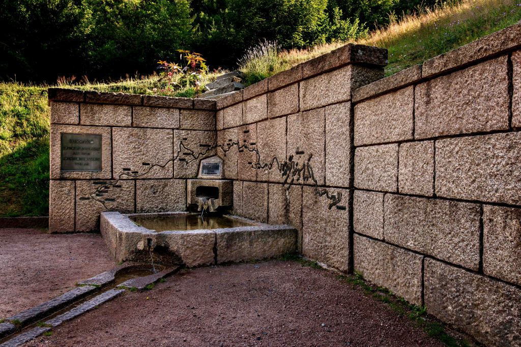 Ein vorletzter Stopp führt uns zur Moselquelle. Das Denkmal ist recht gut gemacht, doch der kleine Rinnsal, der einmal ein großer Nebenfluss des Rheins werden wird, verschwindet hinter einer Hecke in einer Wiese.