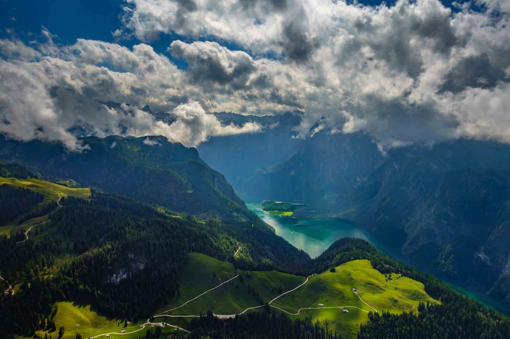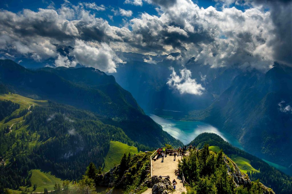 Kurz danach verlassen wir die „Wanderautobahn“ und mühen uns im steilen Zickzack hinauf zum Jenner. Hierhin hat die Seilbahn eine Menge Ausflügler befördert. Alleine sind wir am Gipfel beileibe nicht, doch auch so ist der Blick auf den majestätischen Königsee atemberaubend und lässt die Menschenansammlung vergessen. Der Watzmann samt Frau und Kindern versteckt sich noch in den Wolken der abziehenden Regen- und Gewitterfront. Was haben wir für ein Glück mit dem Wetter, letzte Woche schneite es noch bis auf 1700 m herab.