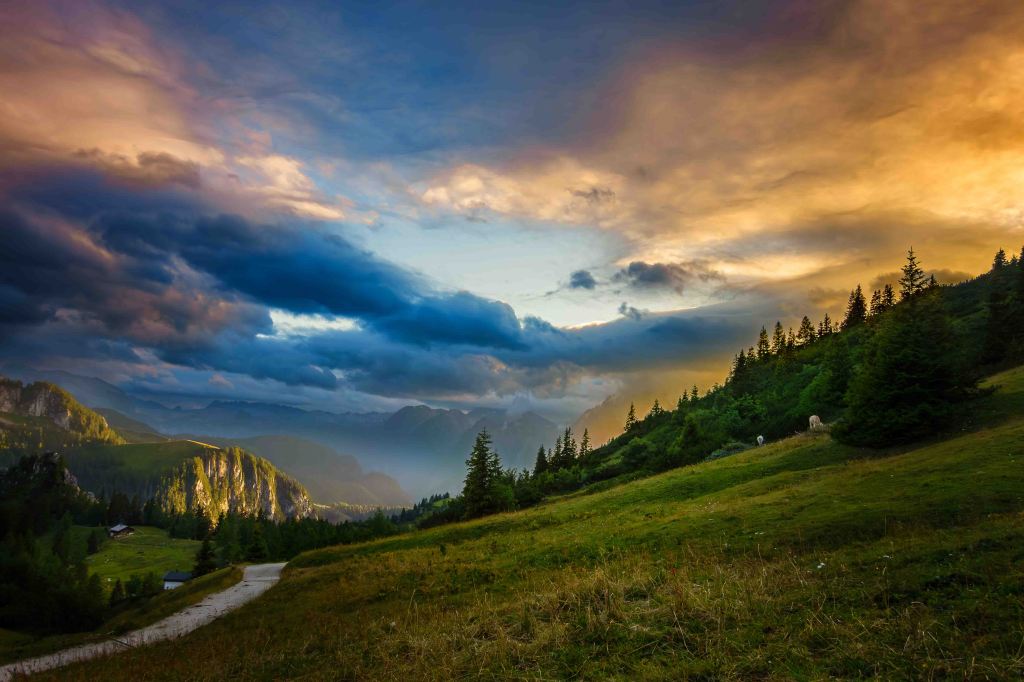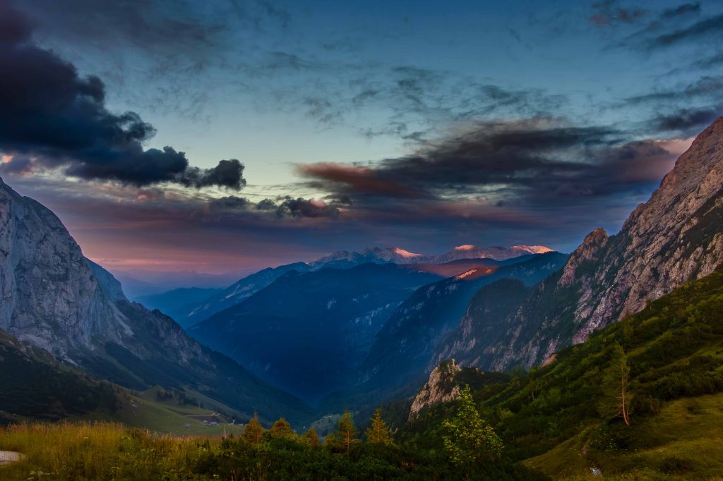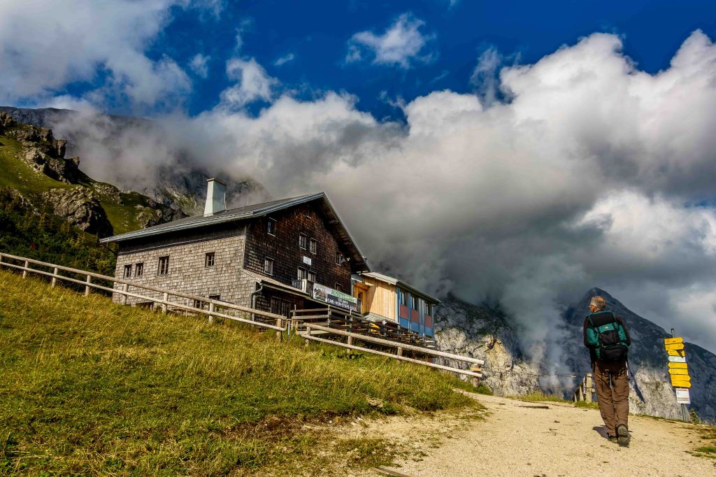 Der weitere Weg zu unserem ersten Etappenziel ist dann recht gemütlich. Das Carl-von-Stahl-Haus liegt malerisch am Torrener Joch, am Fuße des Schneibsteins, der morgen früh auf uns wartet. Vor uns tut sich über dem Tal der Salzach das Dachsteinmassiv auf.