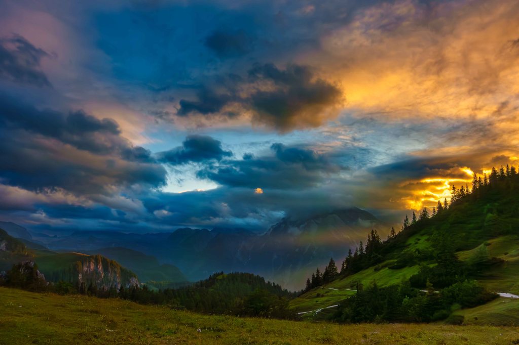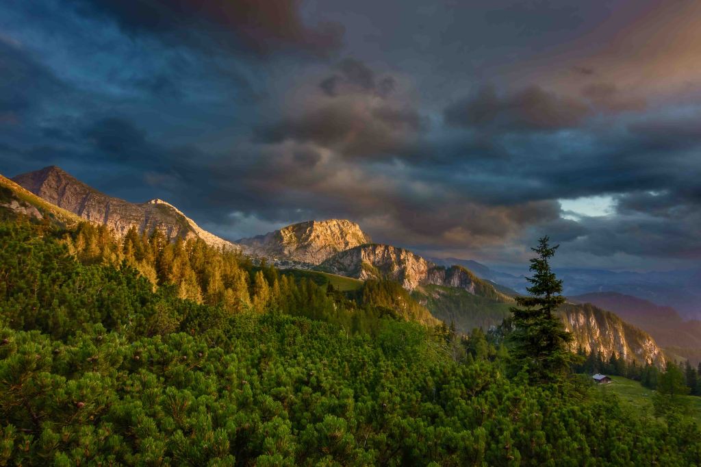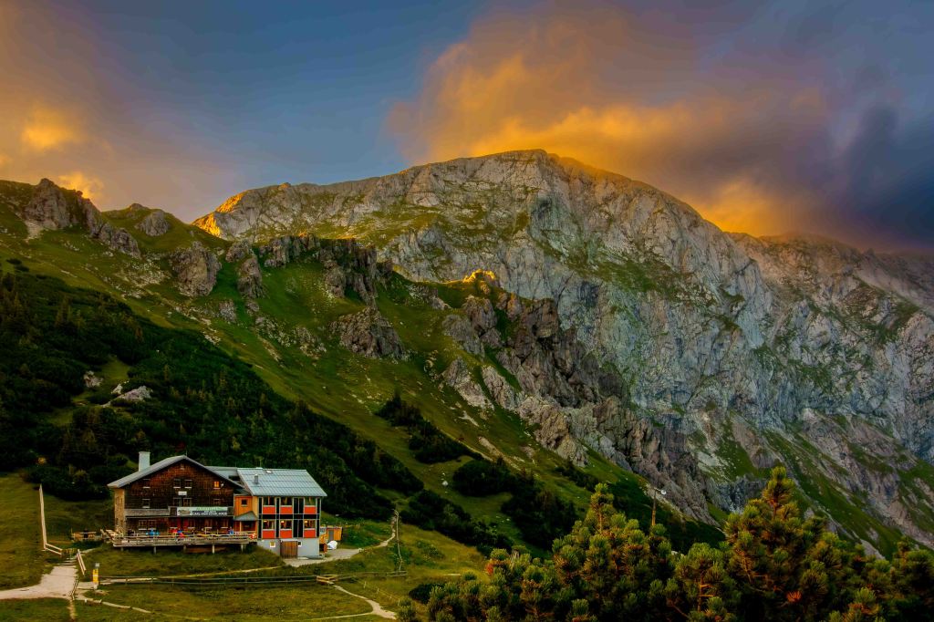 Nach einem sättigenden Hirschgulasch genießen wir einen farbenprächtigen Sonnenuntergang über den sich immer noch versteckenden Watzmann.