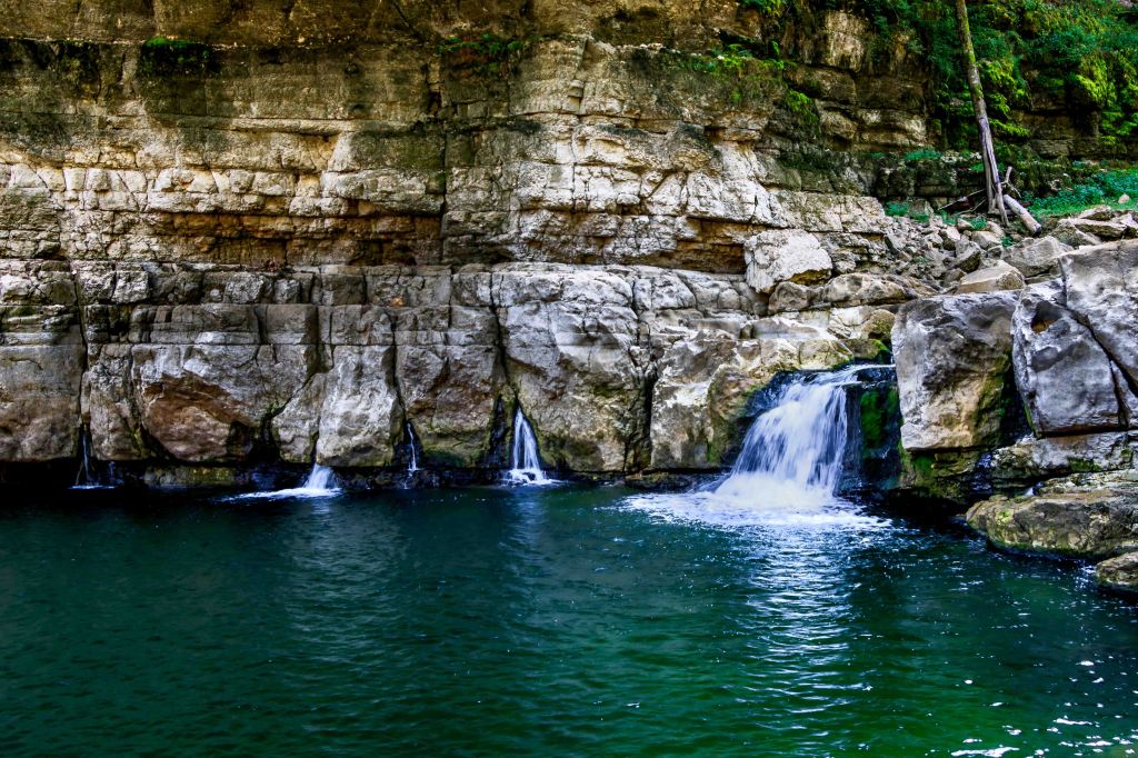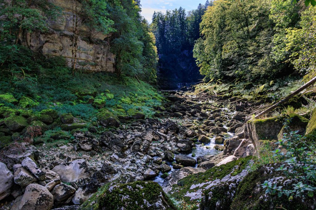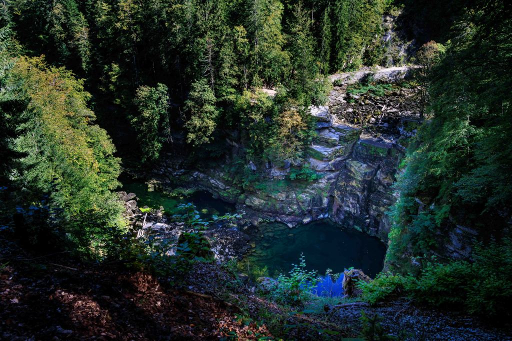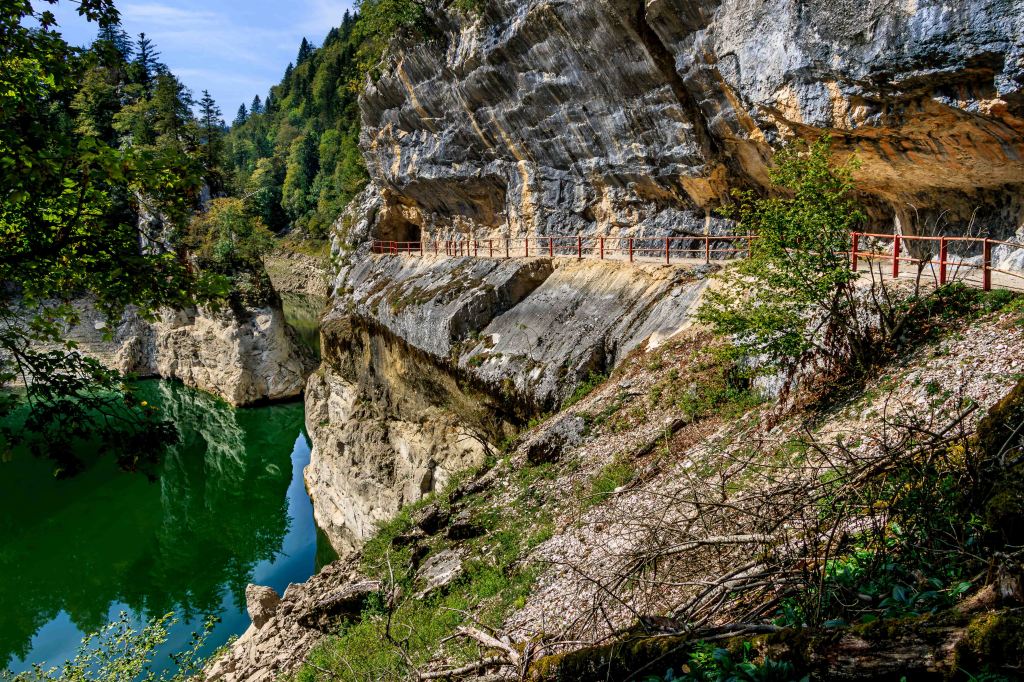 Eines der meist besuchten Sehenswürdigkeiten im Jura, es kommen jedes Jahr 300 000 Besucher, ist der Saut de Doubs, ein 27 m hoher Wasserfall. Doch der Wasserstand der Doubs variiert über das Jahr hinweg sehr stark. Auch verliert er Wasser, wie die Donau, in den porösen Untergrund. So ist es auch jetzt, kein Tropfen stürzt sich über den Abhang. Die Wanderung führt erst am Stausee Lac de Moore entlang, dem geschätzte 15 m Wasser fehlen und ein wunderbares Tal unter sich begraben hat. Oberhalb des Wasserfalls staut ein 15 000 Jahre Bergsturz das Wasser der Doubs zum Lac des Brenets auf. Doch auch hier fehlen viele Meter, um den Wasserfall zu versorgen. So ist die Wanderung leider ein wenig trist. Wir müssen halt auf der Rückfahrt noch einmal vorbei schauen.