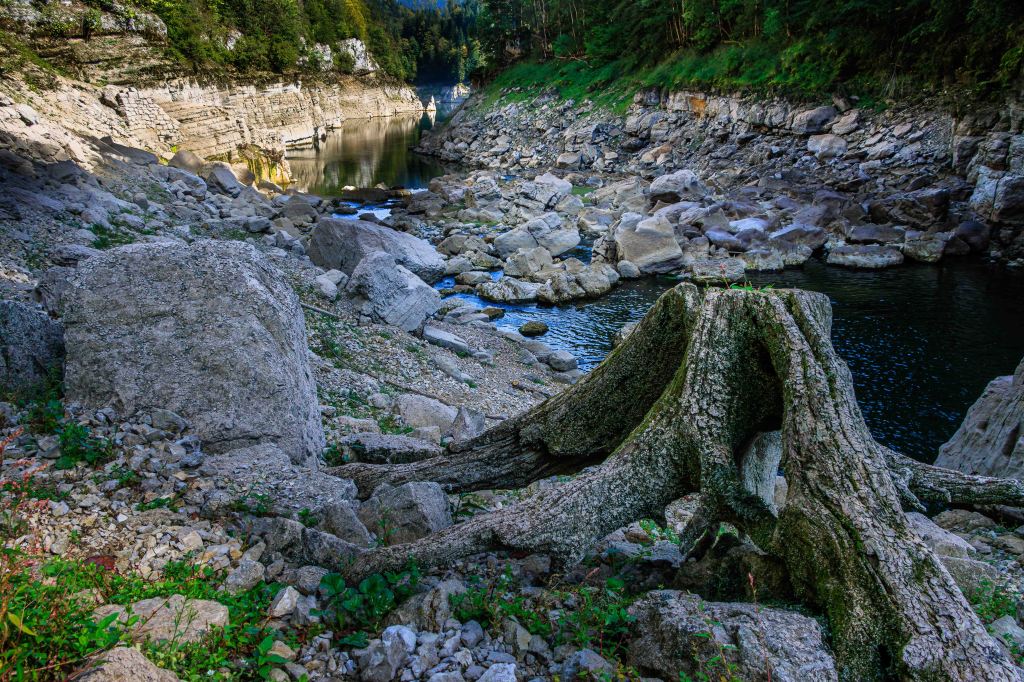Der Doubs (gesprochen „du“, wir sagen aber lieber „die Doubs“) ist ein eigenartiger Fluss: Er ist 453 km lang, die Mündung in die Saône aber nur 90 km von der Quelle entfernt. Erst fließt er in den Norden, als wolle er über den Rhein in die Nordsee, besinnt sich dann jedoch und fließt in den Süden und ins Mittelmeer. Caesar erwähnt den Doubs in seinen Commentarii de bello Gallico und nennt ihn Dubis, was „ungewiss“ und „zweifelhaft“ bedeutet. Eigentlich ganz zutreffend, für dessenUnentschlossenheit. Doch der Name ist keltischen Ursprungs und bedeutet schwarz.