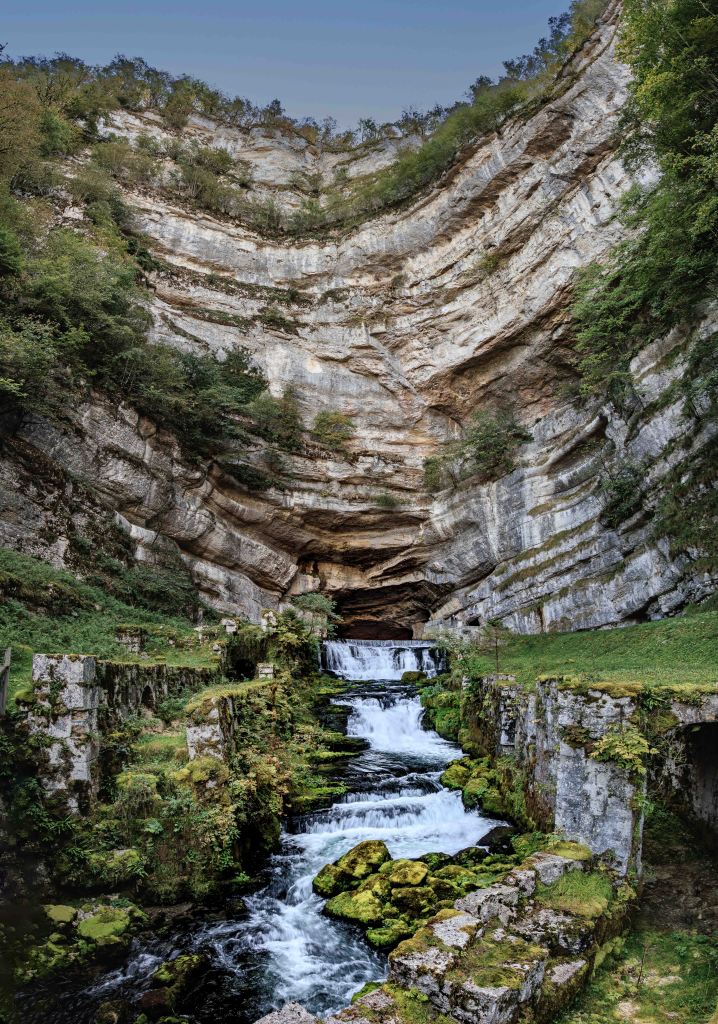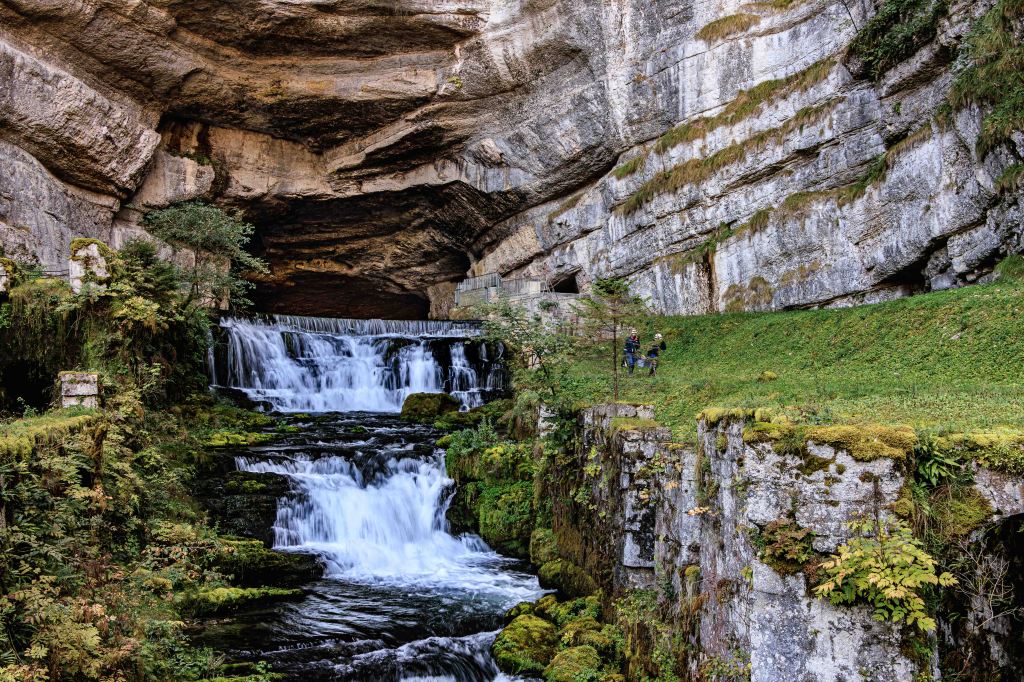 Im letzten Jahr, auf dem Rückweg aus der Auvergne, waren wir schon einmal an der Source de la Loue. Weil die Quelle so beeindruckend ist, besuchen wir sie auch in diesem Jahr. Wir parken aussichtsreich am großen Wanderparkplatz Point die vue Moine mit Blick auf das gegenüberliegende Dorf Mouthier-Haute-Pierre und dem Tal der Loue. Von hier führt ein wunderbarer Steig immer entlang der Felsabrüche durch niederen Wald und entlang von Weiden. Von der 400 m tiefer fließenden Loue ist nur das Rauschen zu hören, zu sehen ist sie nicht. Dann tut sich die mächtige Felswand auf, aus deren Fuß die Loue entspringt. Und welche Freude, sie sprudelt trotz der fortgeschrittenen Jahreszeit kräftig, obwohl hier direkt noch Wasser in ein Kraftwerk abgezweigt wird. Die Dimensionen der Quelle und der dahinter liegenden Wand lassen sich an den zwei Mitarbeitern des Elektrizitätswerks erahnen.