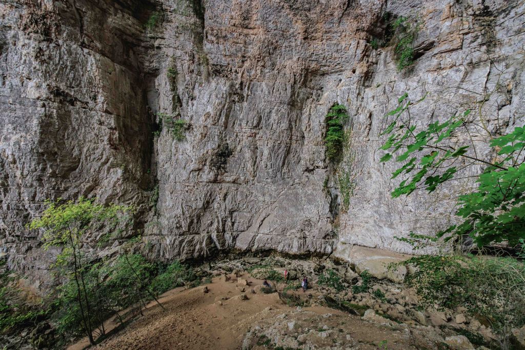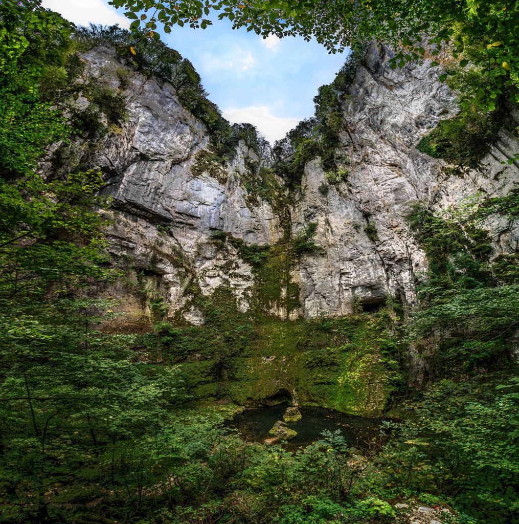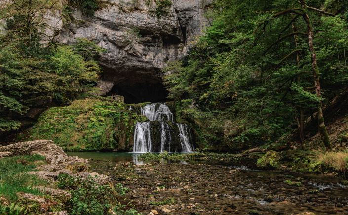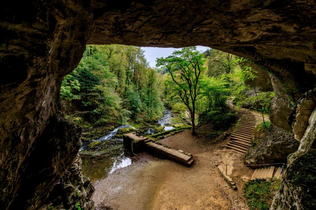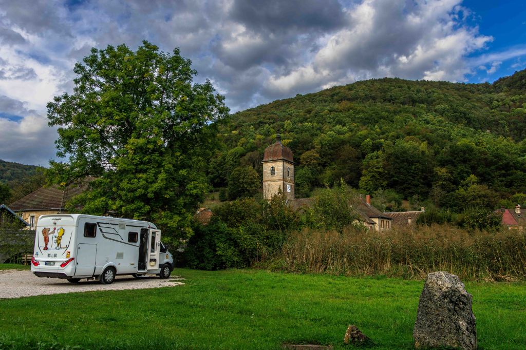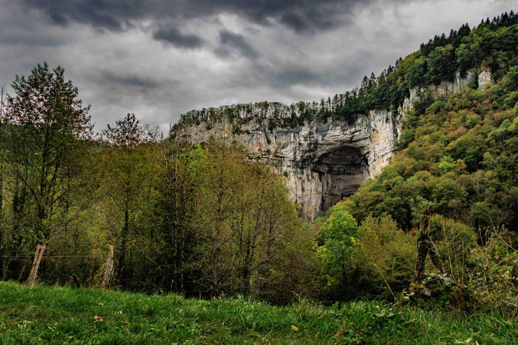 Wir folgen dem wunderschönen Tal der Loue durch eine abwechslungsreiche Landschaft. Nur wenige Weiler liegen auf dem Weg durch die Weidelandschaft. In Nans-sous-Saint-Anne können wir am Bach Le Verneau auf dem offiziellem Stellplatz der Gemeinde stehen. Nachmittags soll für ein paar Stunden ein Gewitter durchziehen. Peter nimmt Anorak und Regenschirm und spaziert in den Talschluss, aus deren Felswand die Source du Lison sprudelt. Darüber stürzt sich zeitweise der jetzt trockene Wasserfall Creux Billard über eine 80 m hohe Wand. Gewaltig ist die Grotte Sarrazine: Auf dem Bild sind die Menschen klein wie Zwerge. 30 m dick ist die Decke, die sich 90 m über mir wölbt, der Abfluss ist über mannshoch. Alle drei Naturschauspiele sind ein System und miteinander verbunden. Wenn das Fassungsvermögen der Quelle erschöpft ist, dann übernimmt den Rest die Grotte.