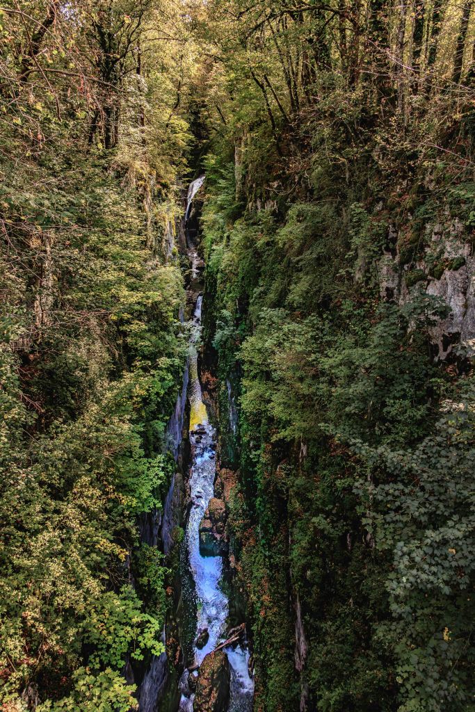 Bei dem Dorf Les Planches-en-Montagne entdecken wir neben unserem gemütlichen Übernachtungsplatz zufälligerweise eine weitere versteckte Sehenswürdigkeit des Jura: die Sorge de la Langouette. Diese kleine Schlucht ist immerhin fast 40 m tief aber nur 4 m breit. Am oberen Ende ist sie zu einem Wasserfall aufgestaut, um in früheren Zeiten eine Mühle, die jetzt leider eine Ruine ist, zu betreiben.