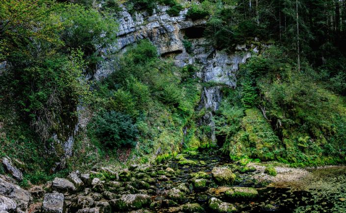 Und natürlich müssen wir dem Doubs, dem wesentlichen Gestalter dieser wunderschönen Landschaft unsere Referenz erweisen: Nahe der Ortschaft Mouthe entspringt er auf 937 m am Fuße einer knapp 1500 hohen Bergkette. Die Quelle schüttet durchschnittlich 1700 Liter pro Sekunde, nur leider jetzt nicht, und ist Ausgang eines komplexen Höhlensystems. Nachdem er munter der Unterwelt entsprungen ist, fließt der Doubs gemächlich über die weite Hochfläche nach Norden.