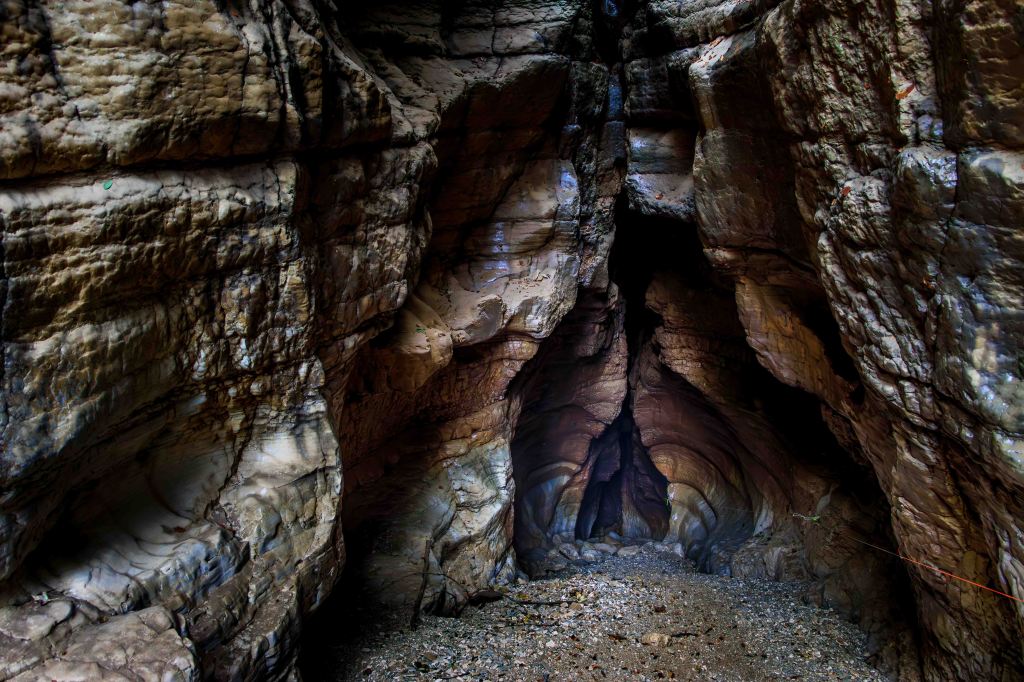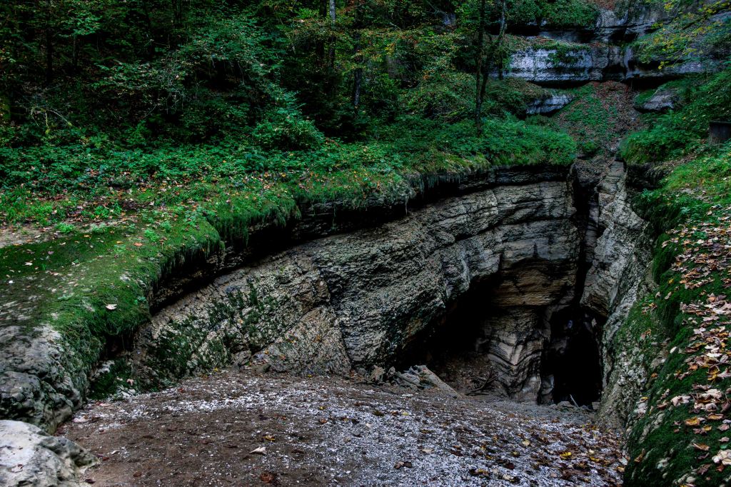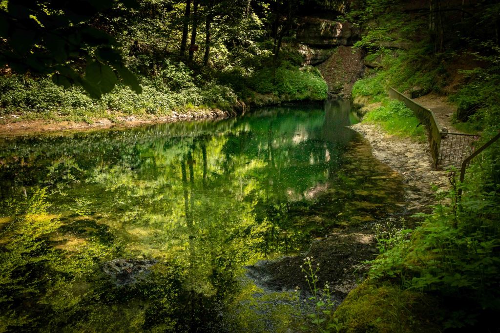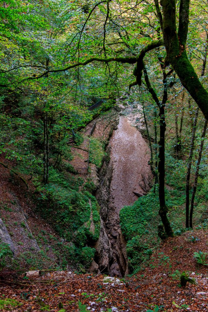 Die Ain führt, anders als beim Besuch im Mai letzten Jahres, leider kein Wasser. Erst bin ich etwas enttäuscht, dann aber überrascht, wie tief der Quelltopf reicht. An einer ausgelegten Schnur könnte man weiter in die Höhle laufen, was mir nicht ganz geheuer ist und ich leichten Herzens darauf verzichte.