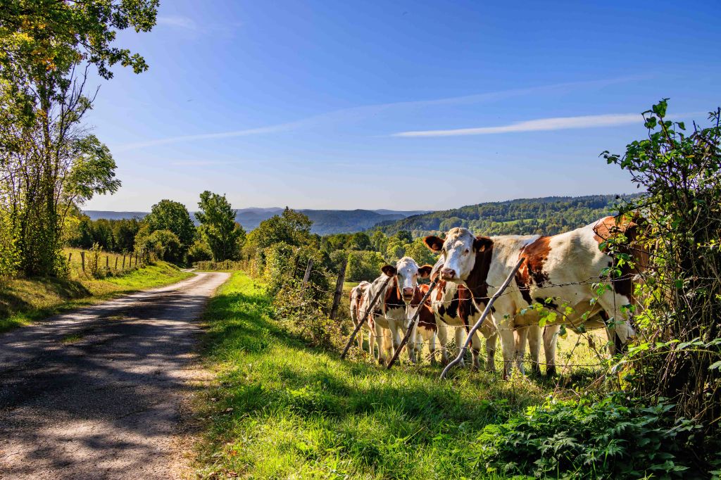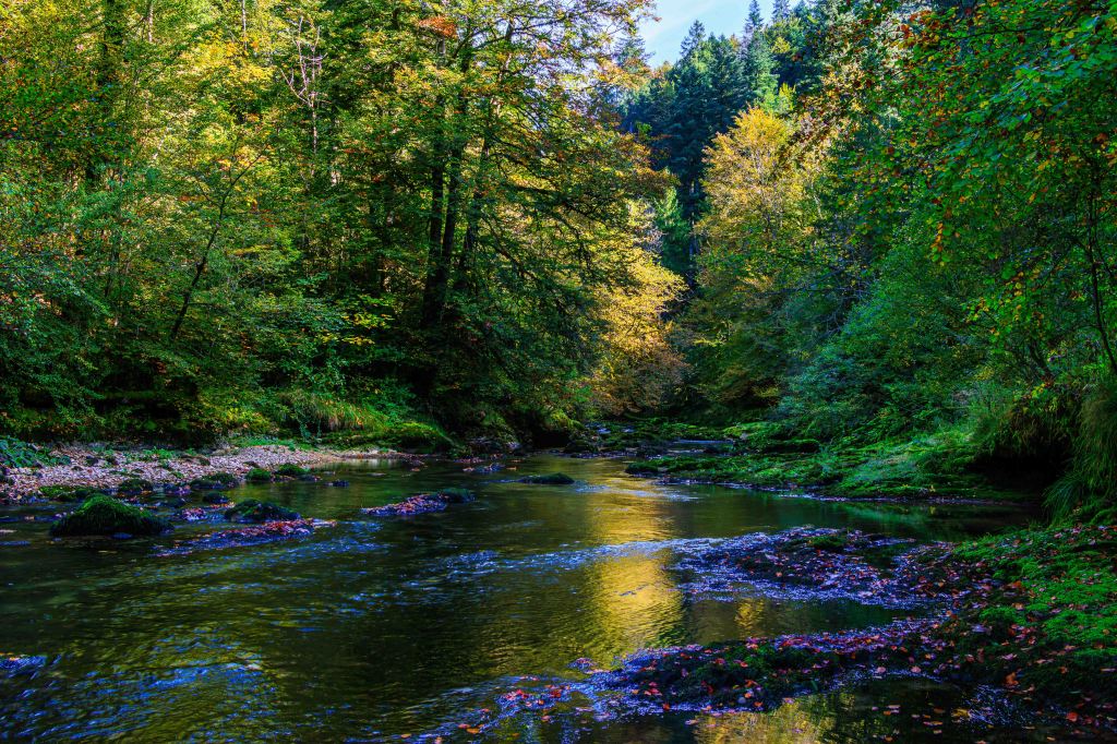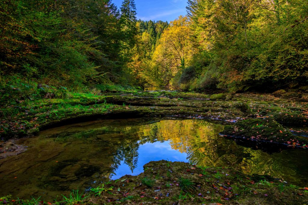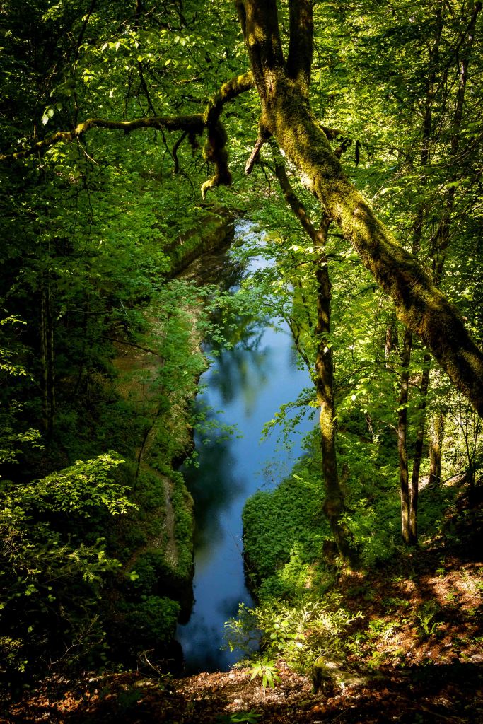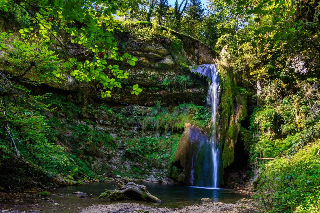 Weiter führt die Wanderung, wieder unter einem verwaschen blauen Himmel, auf den gegenüberliegenden Kamm und durch den Weiler Doye. Vorbei an Viehweiden geht es hinunter zum Flüsschen Ruisseau de Combe-Sandon. Hier überrascht die Cascade du Moulinet, wieder so ein verstecktes landschaftliches Juwel, mit einem wunderbarem Becken. Leider kann ich mich nicht dazu durchringen, ein frisches Bad zu nehmen. Die Cascade du Saut des Maillys kommt mir bekannt vor, erst letztes Jahr im Mai auf der Rückfahrt aus dem Süden Frankreichs waren wir hier. Allerdings parkten wir auf der anderen Seite des Flusses.