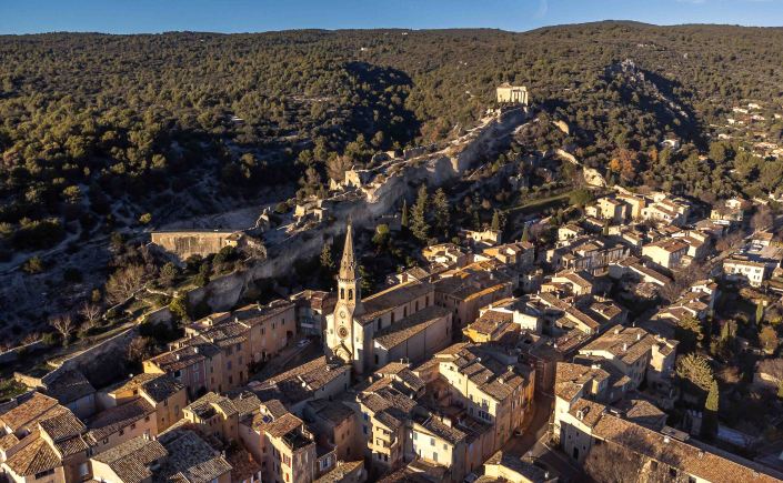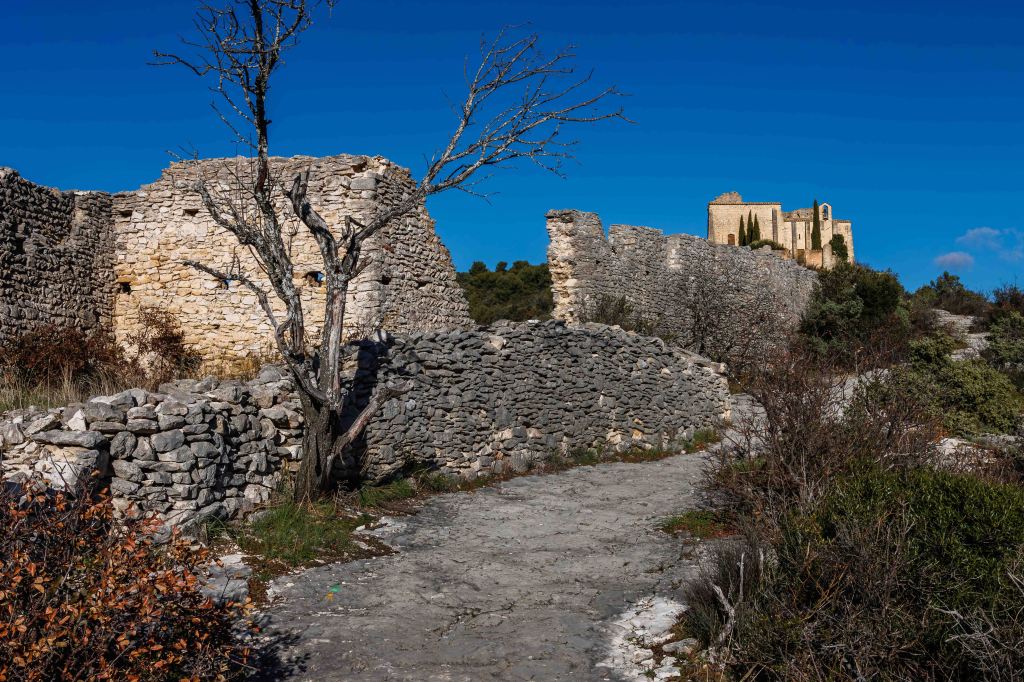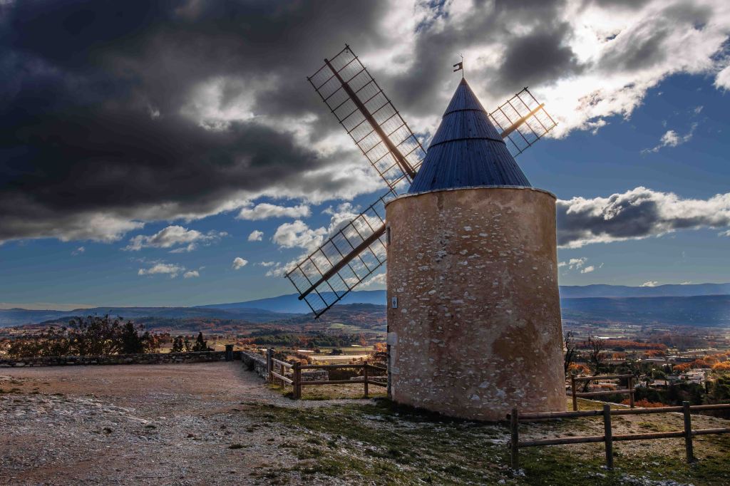 In Saint-Saturnin-lès-Apt können wir ganz offiziell und aussichtsreich neben einer Windmühle stehen. Auf einem langen Felsrücken stand früher ein großes Chateau, eine Kapelle am Ende des Grates ist noch erhalten.