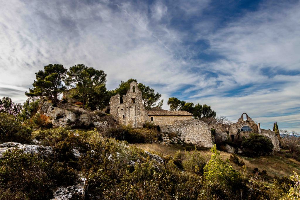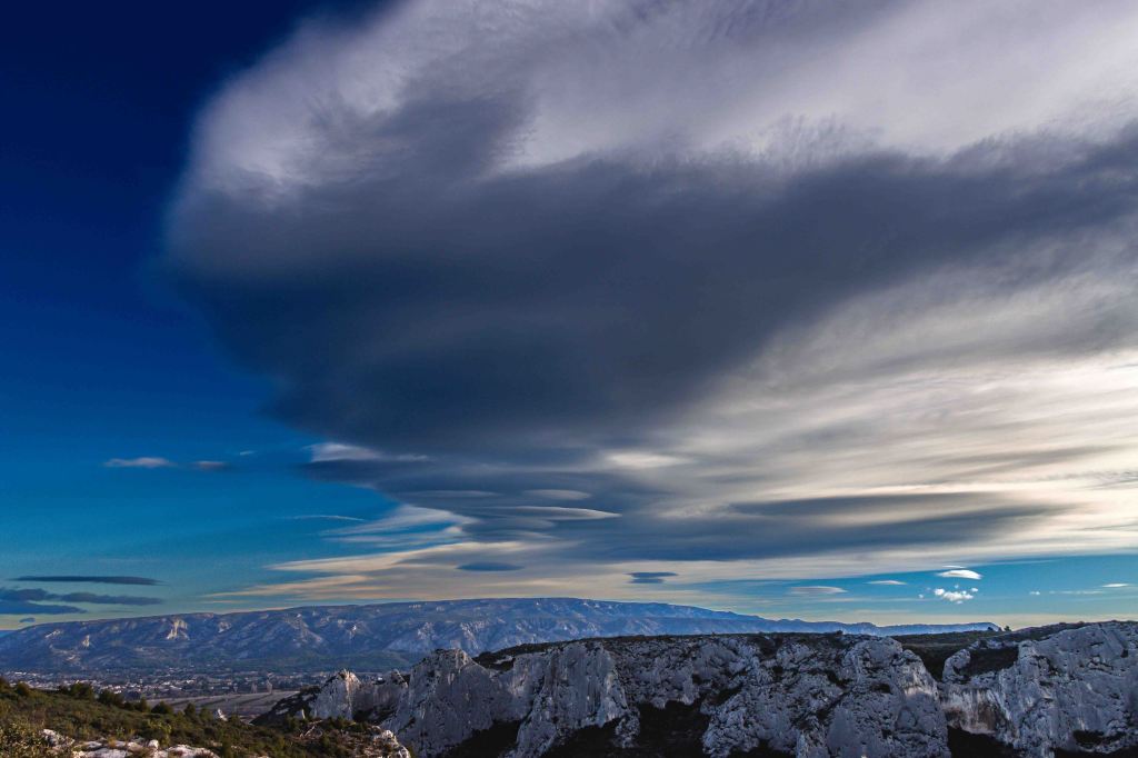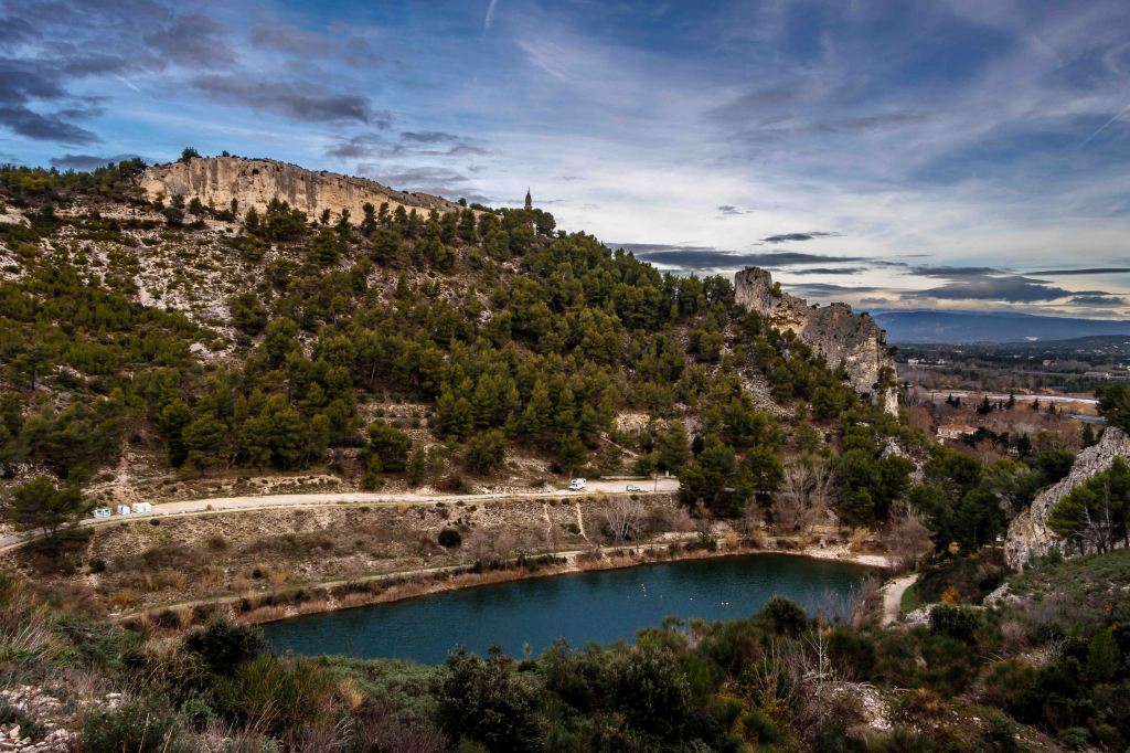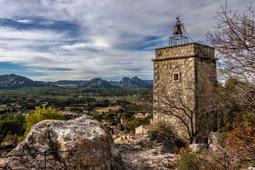 Über dem Luberon stehen dunkle Wolken, über den Alpilles, den kleinen Alpen, scheint die Sonne. Also auf nach Westen. In Orgon parken wir direkt an einem Badeweiher; verbotenerweise, aber es ist ja Nebensaison. Von hier führt eine Runde durch die ersten Ausläufer des kleinen Gebirgszugs. In der Höhe weht der Mistral, riesige Lentis stehen am Himmel. Der einsame Turm war früher ein Teil einer Kommunikationsstation, mit derer über bewegliche Flügel Nachrichten von Paris nach Marseille übermittelt wurden.
