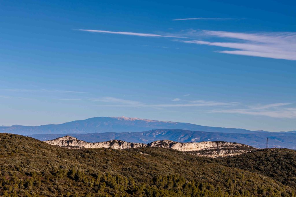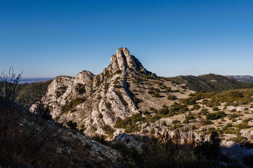 Bei herrlichem Wetter mit einem strahlend blauen Himmel möchte ich den Les Opis, der Berg mit dem Turm, besteigen, der knapp 500 m hoch ist, aber von unten für mich fast unbezwingbar ausschaut. Als wir losfahren, weht ein laues Lüftchen, doch als ich den Grat erreiche, nimmt es mir schier den Atem: der Mistral fegt in der Höhe über den Kamm. Das Gute ist die fantastische Fernsicht: der schneefreie Mont Ventoux, das Mittelmeer und der in der Sonne glitzernde Etang de Berre. Nach gut einer Stunde kehre ich um. Der Berg will einfach, dass ich wiederkomme.