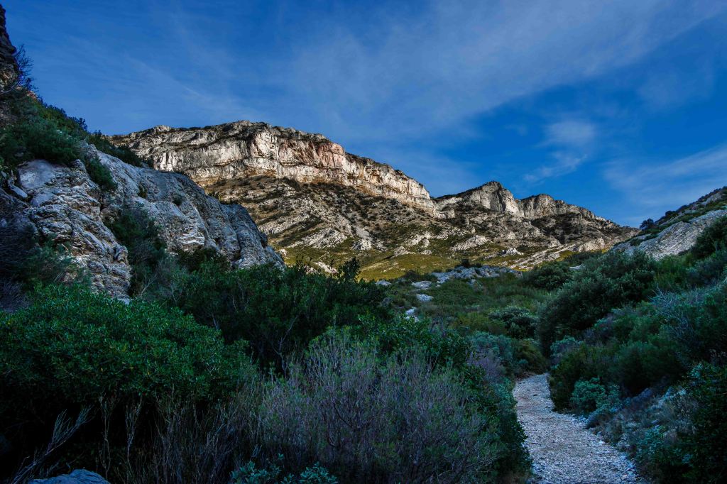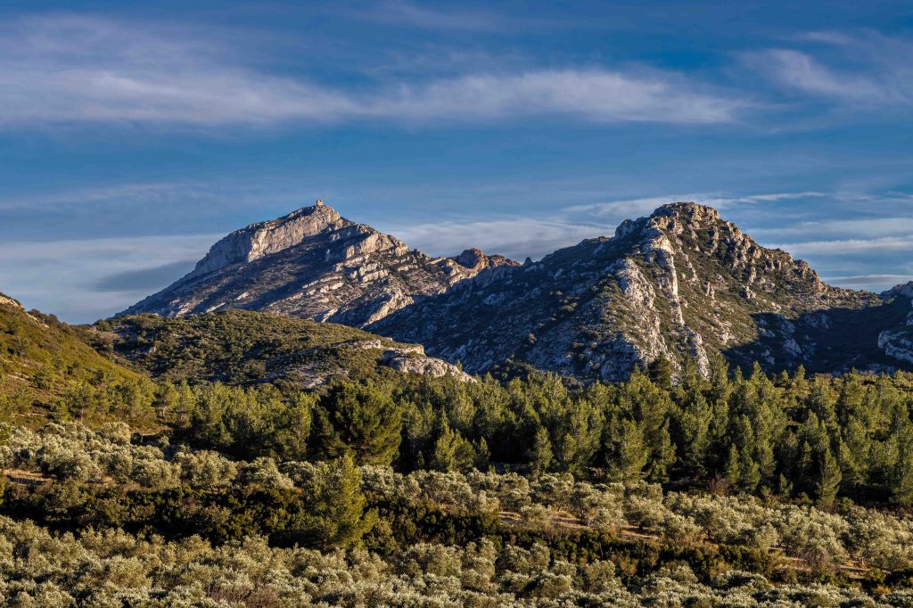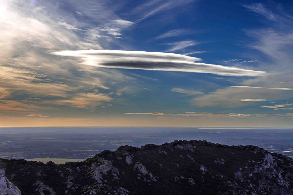 Der Mistral hat eine Ruhepause eingelegt, zumindest in Bodennähe, in der Höhe dagegen bilden sich immer noch große Lentis. Hoffentlich bricht der Wind nicht durch, den heute will ich die abgebrochene Wanderung zum 498 m hohen Les Opies neu versuchen. Der Weg zum Gipfel ist einfach, auch wenn er unter dem Ziel ziemlich steil ist. Wenn ich sonst meist der einzige Wanderer bin, versammeln sich auf diesen Aussichtsberg heute ein paar Gleichgesinnte. Der Weg zurück über den Grat ist etwas schwieriger. Ab und zu muss ich den Steig und die wenigen Markierungen suchen, zweigen doch viele Tierspuren ab.