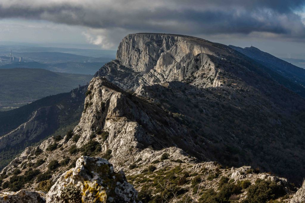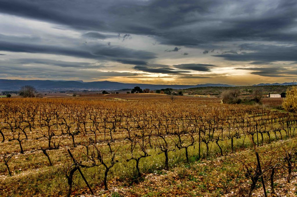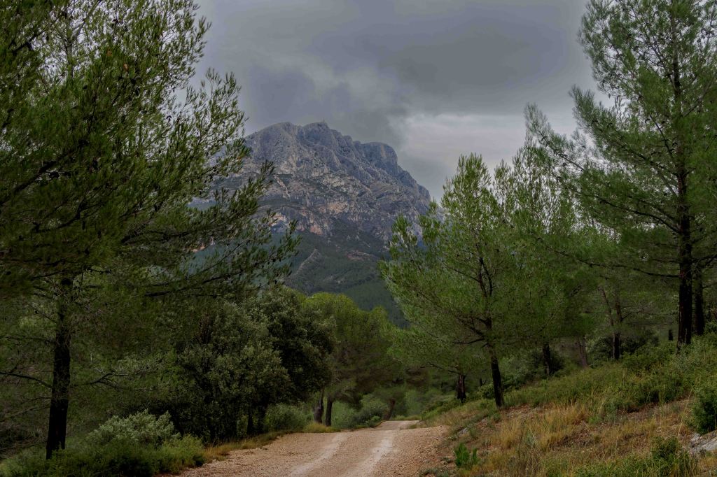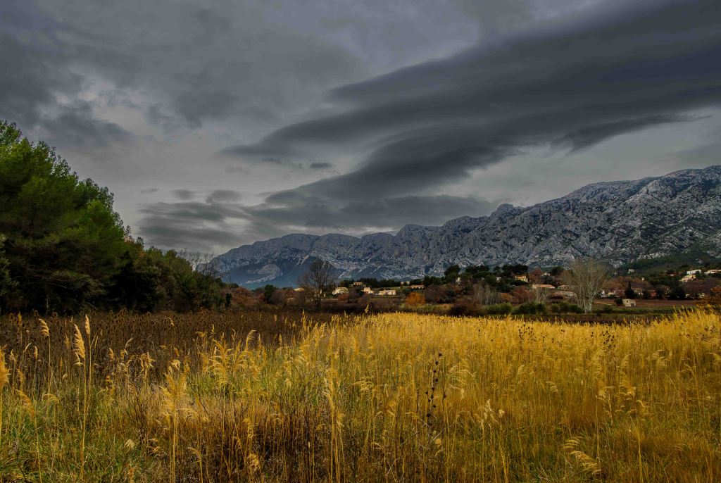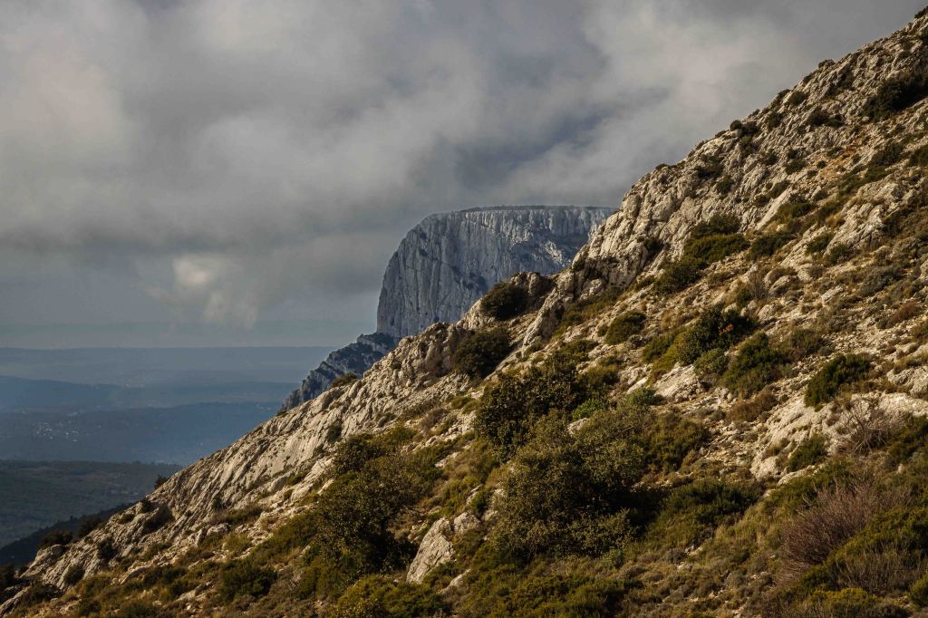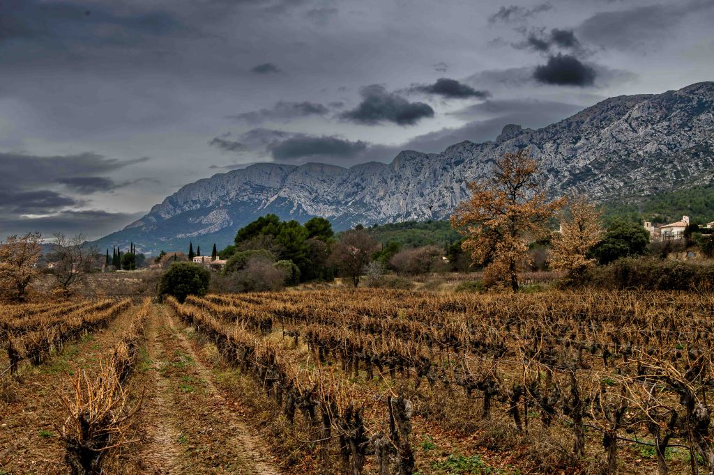Nachdem der Regen nicht aufhören will, umrunden wir die Sainte-Victoire und fahren nach Puyloubier an deren Südhang. Hier ist es zumindest ein wenig heller und bei regnerischen Wetter und heftigem Wind erhaschen wir bei einen Spaziergang durch die Weinfelder einen ersten Blick auf das 18 km lange Gebirge.
