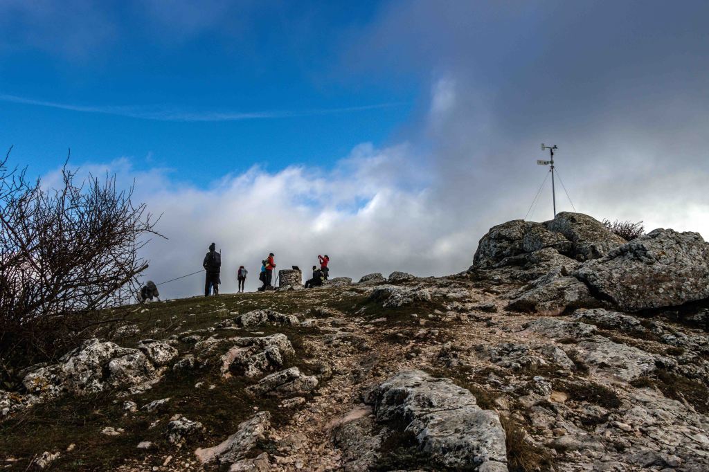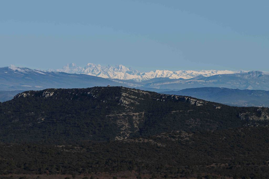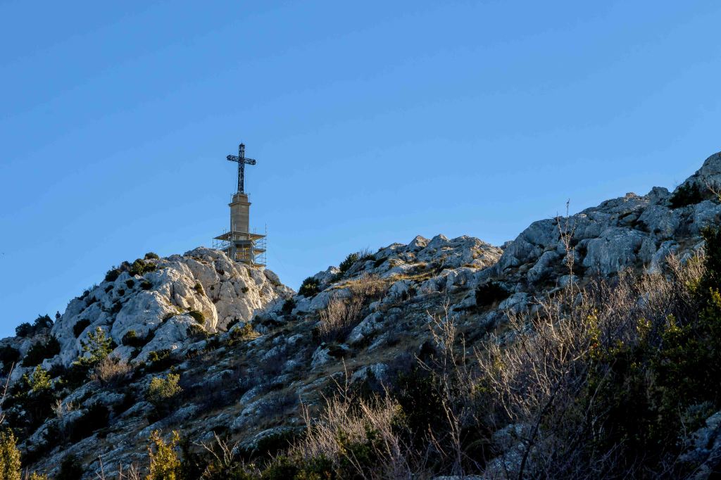 Endlich ist uns Petrus und Victoria wohl gesonnen. Wir sind wieder in Vauvernargues. In der Nacht hat es gefroren, der Himmel ist blitzblank und erstrahlt im leuchtenden Blau, in den Gräsern glitzert der Raureif. Mit jedem Höhenmeter erweitert sich das Panorama: der wieder mit einer weißen Haube bedeckte Mont Ventoux, die Alpen und auch die Alpilles sind zu sehen. Im ehemaligen Kloster rastet eine Schar Schulkinder. Von hier ist es nicht mehr weit bis zum Kreuz der Provence. Oben ist der Platz für die Gipfelstürmer sehr eng, so viele Wanderer habe ich in den letzten Wochen noch nie gesehen.