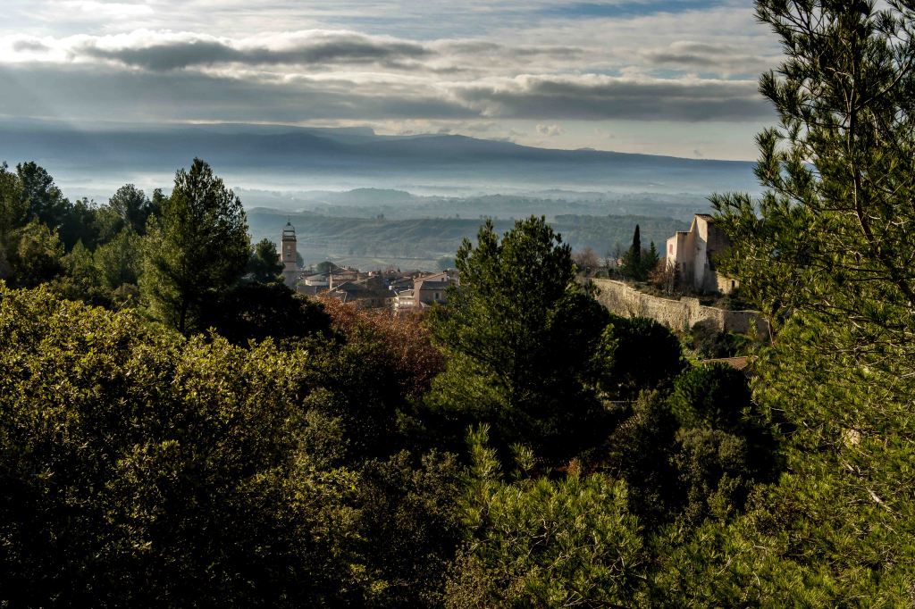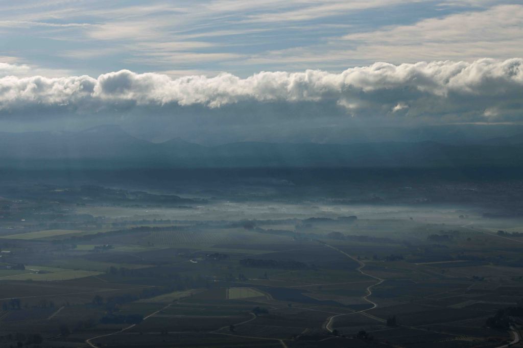 Noch einmal erklimme ich den Bergrücken, diesmal von Puyloubier aus. Das Wetter ist fast frühlingshaft, im Tal saugt die schon stark Sonne die Feuchtigkeit aus den Boden, Nebel schwebt über den Rebfeldern. Ab und zu bilden sich in der aufsteigenden Thermik Wolken über dem Pic des Mouches, mit 1011 m die höchste Erhebung. Zwei Gleitschirmfliegen ziehen ihre Kreise. Es sind stimmungsvolle Tage an der Sainte-Victoire und wir können Paul Cézanne verstehen, Peter hat bestimmt mehr als 80 Bilder geschossen. So ist auch dieser Artikel etwas länger und bildreicher geworden als die sonstigen.