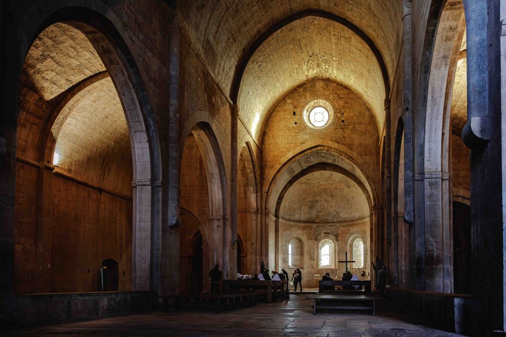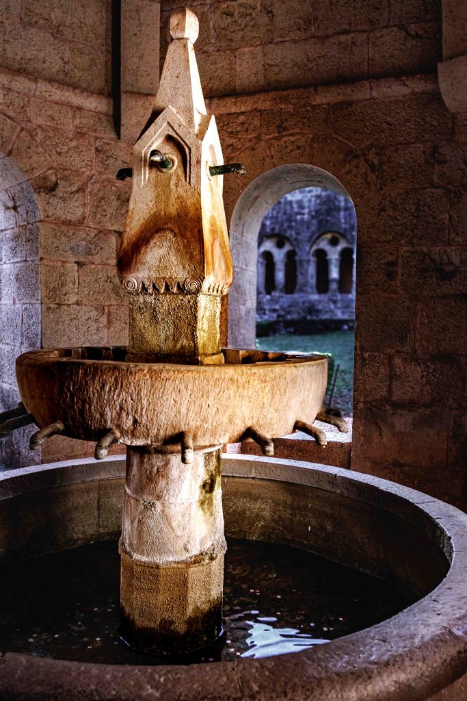 Das Kloster Thoronet ist das dritte der Zisterzienserklöster in der Provence, Sénanque und Silvacane besuchten wir ja schon. Es ist das älteste und gilt als das schönste der Klöster. Gemäß ihrer Regeln sind die Bauten schlicht und ohne Schmuck ausgeführt, doch zeugen sie von hoher Steinmetzkunst. Nur wenige Ornamente verzieren ein paar Säulen und den Brunnen. Als wir ankommen, proben Nonnen a capella für die sonntägliche Messe, die Akustik der Kirche ist faszinierend.