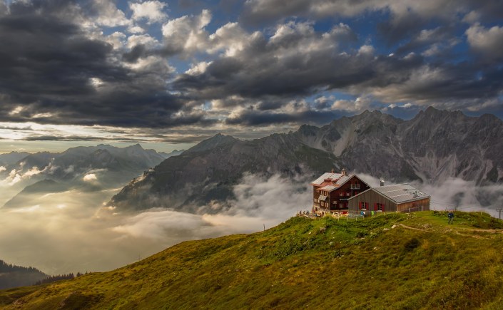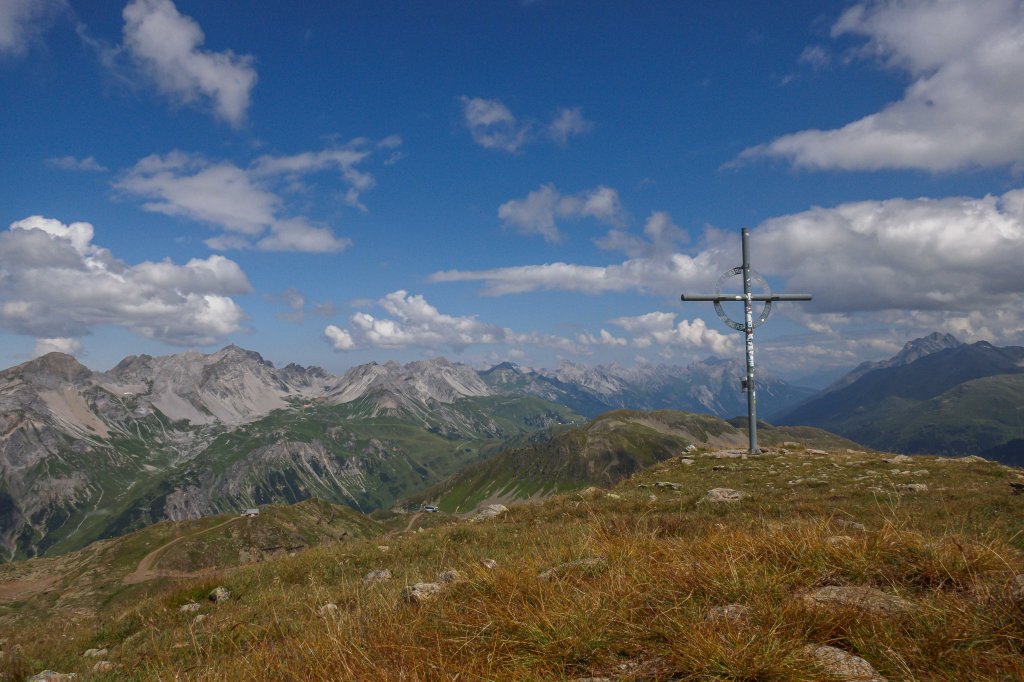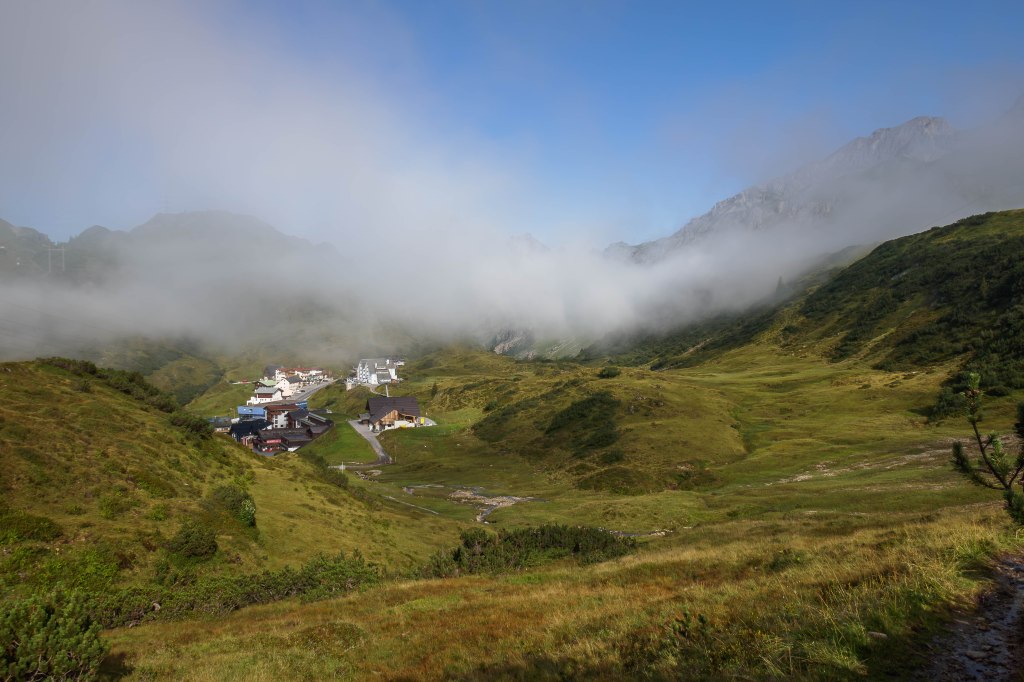 Über Sankt Anton hängt noch eine dicke zähe Wolkenschicht, als ich um 8:30 der erste Gast bei der Seilbahnstation hinauf zum Galzig bin. Doch Meter um Meter wird es in der Kabine heller und plötzlich schwebe ich über den Wolken. Oben angekommen setze ich mich erst einmal staunend in die taunasse Wiese und genieße den Weitblick über das strahlend weiße Wolkenmeer. Gegenüber liegt das Verwall, durch das ich die nächsten neun Tage wandern werde.