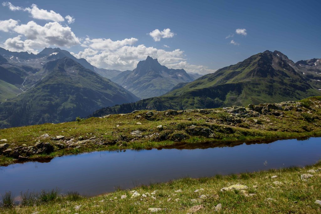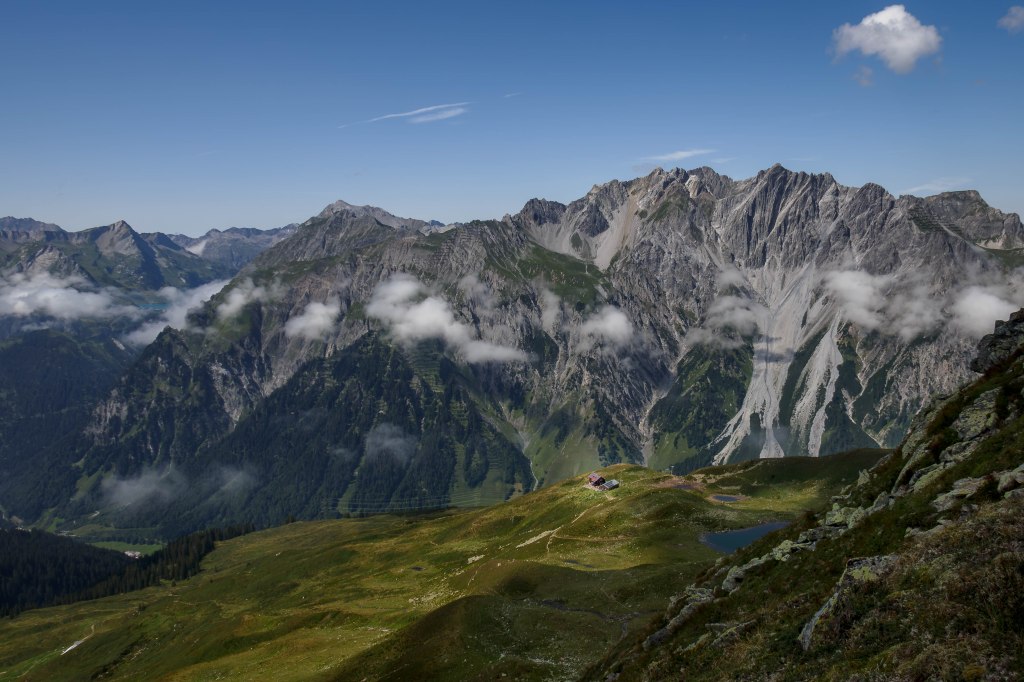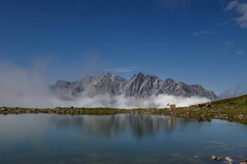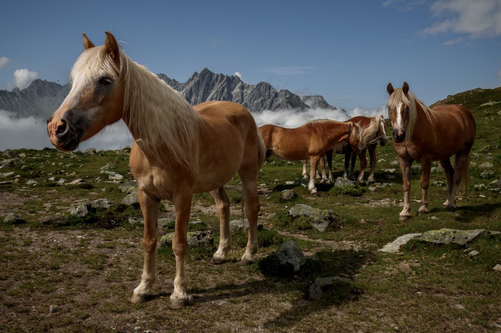 Immer wieder die Aussicht genießend schlendere ich gemütlich hinunter nach Sankt Christoph. Von hier führt der Berggeiststeig zu meinem ersten Tagesziel, der Kaltenberghütte. Am Wegesrand liegt der Wirt, 2339 m, der Hausberg der nahen Ortschaft. Querfeldein laufe ich über die Wiesenhänge zurück zum Steig. Spontan entscheide ich mich, bereits jetzt zu den beiden Maroiköpfen, 2529 m und 2522 m, aufzusteigen. So spare ich mir ein paar Höhen- und Streckenmeter. Die Aussicht von hier oben ist unbe-schreiblich. Nach ein paar Metern sehe ich die Kaltenberghütte, 2089 m, malerisch unter mir liegen. Ich freue mich schon auf das erfrischende Bad im nahen See. Ein paar Pferde grasen an dessen Rand und bilden mit den tiefen Wolken und der Bergkette ein malerisches Bild.