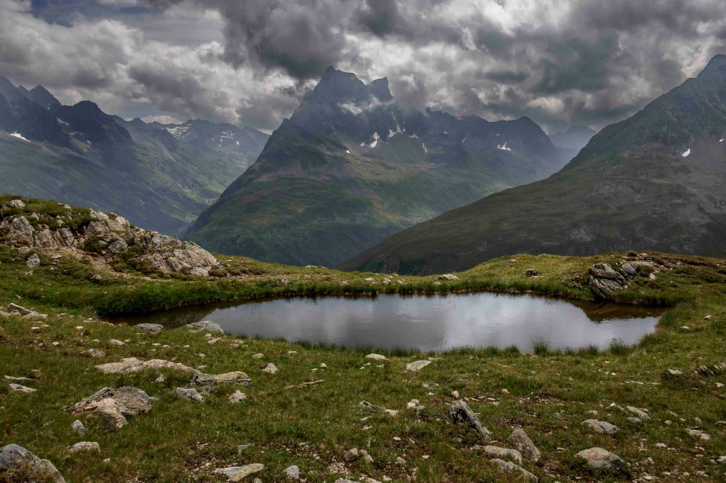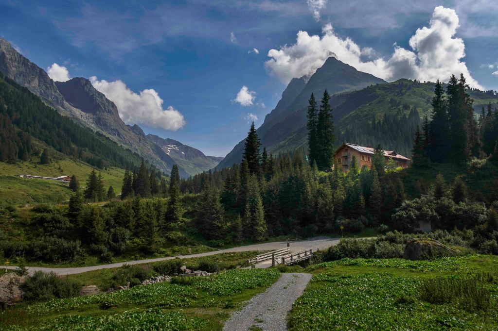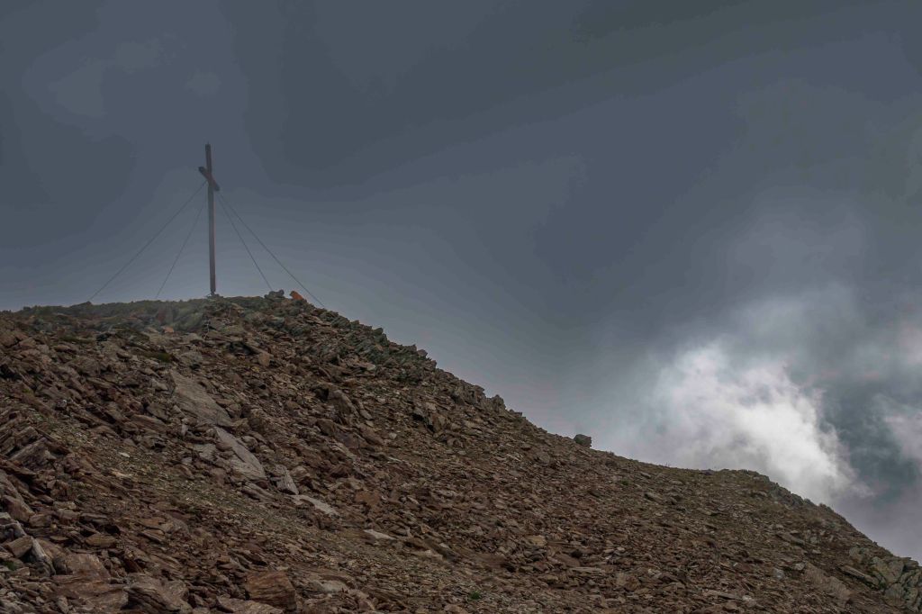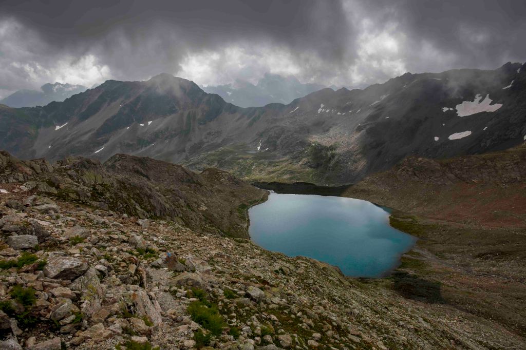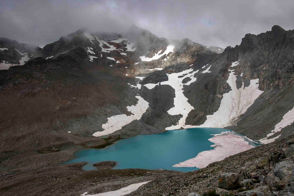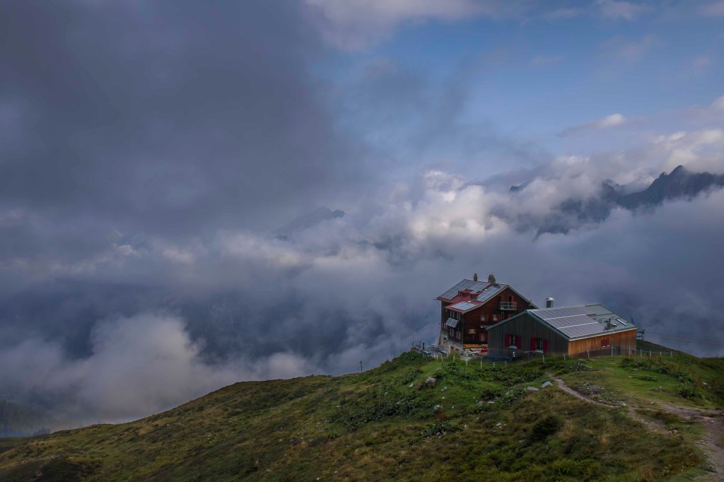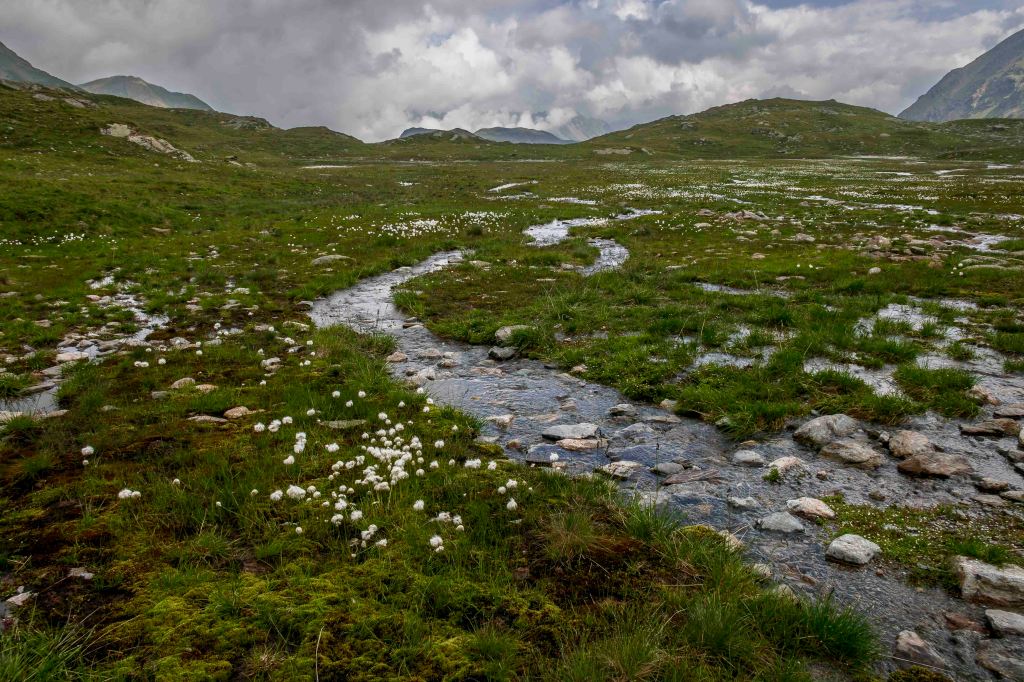Am Morgen ziehen durch das Tal und hänge über der Hütte graue Wolken. Aber ein paar blaue Lücken geben mir Hoffnung auf einen sonnigen Tag. Der Weg schlängelt sich anfangs gemütlich nach oben durch Im Krachel, bis es dann etwas steiler wird. Und dann kommt der Überraschungsmoment auf einer Scharte, die den Blick auf die Leeseite der Berge frei gibt: Unter mir funkeln die beiden türkisblauen Kaltenbergseen. Das Bild ist so überraschend schön, dass ich einen Jubelschrei loslasse – das geht nicht nur mir so, auch die anderen Wanderer sind begeistert. Immer wieder hüllen mich schnell ziehende Wolken ein, während ich zur Krachelspitze, 2686 m, aufsteige. Ich dachte, jetzt geht’s nur noch bergab. Froh Gemuht wandere ich den steilen ehemaligen Gletscherabbruch über den Reutlinger Weg hinunter und komme auf eine kleine Hochfläche, wo weißes Wollgras an den mäanderten Bächen blüht. Doch ganz so einfach ist es nicht: Der Steig wird nochmal richtig steil und führt mich hinauf zum Gstansjöchli auf 2573 m. Jetzt geht’s endlich wirklich bergab, über weite Wiesen ins breite Verwalltal, wo das Ziel für heute auf mich wartet: die Konstanzer Hütte auf 1688 m, die im Schatten des imposanten Patteriol steht.