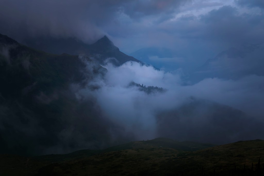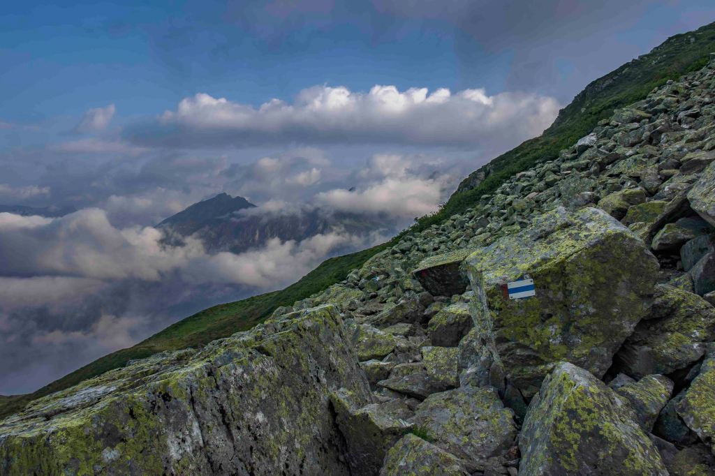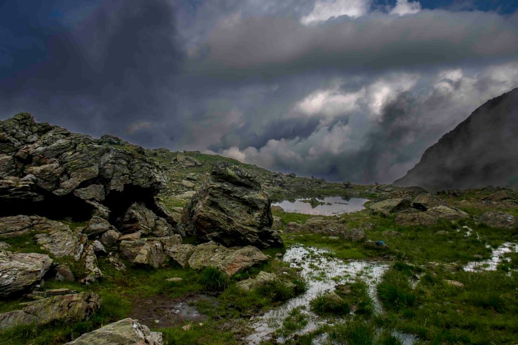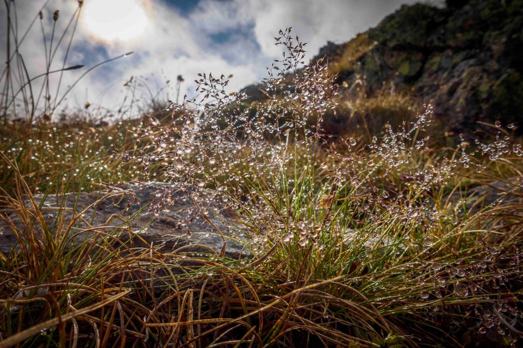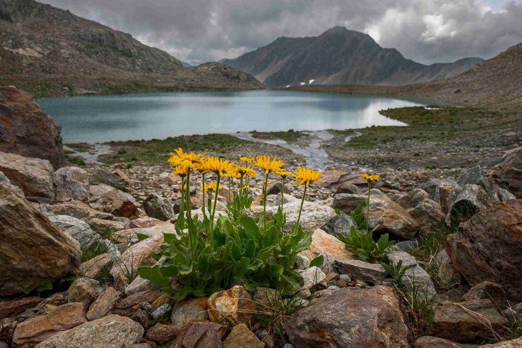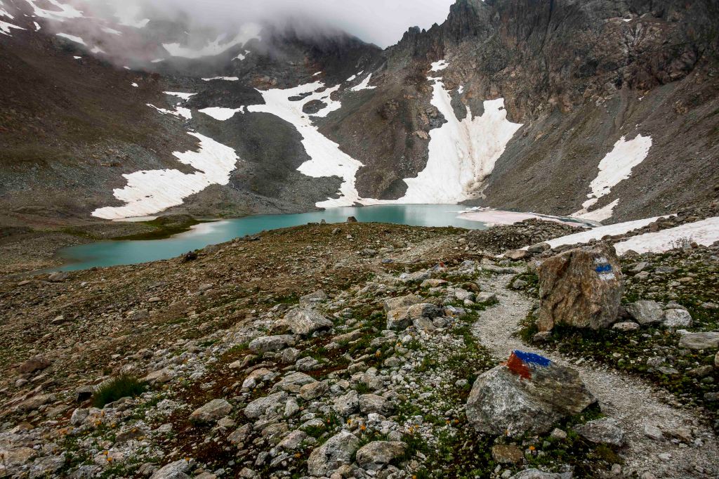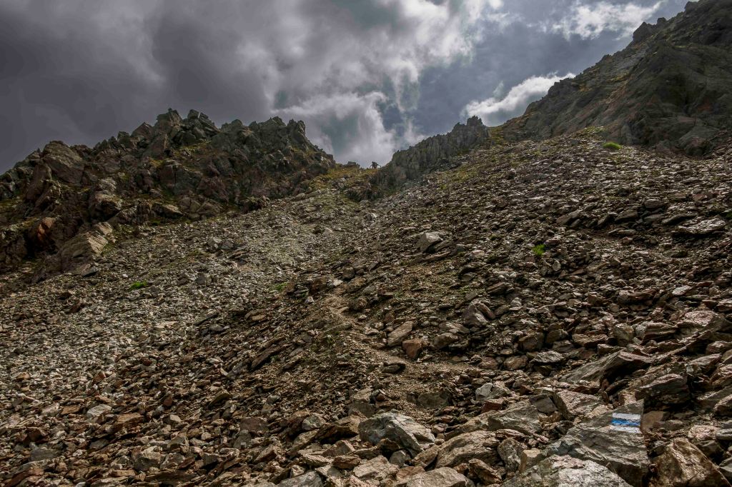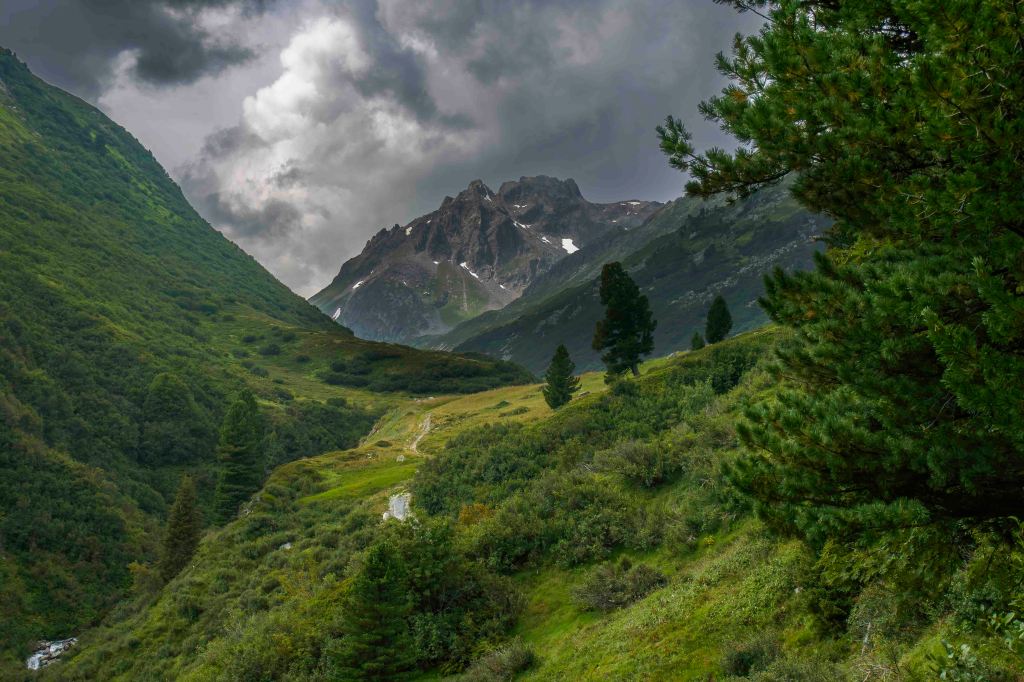 Am Morgen ziehen durch das Tal und hänge über der Hütte graue Wolken. Aber ein paar blaue Lücken geben mir Hoffnung auf einen sonnigen Tag. Der Weg schlängelt sich anfangs gemütlich nach oben durch Im Krachel, bis es dann etwas steiler wird. Und dann kommt der Überraschungsmoment auf einer Scharte, die den Blick auf die Leeseite der Berge frei gibt: Unter mir funkeln die beiden türkisblauen Kaltenbergseen. Das Bild ist so überraschend schön, dass ich einen Jubelschrei loslasse – das geht nicht nur mir so, auch die anderen Wanderer sind begeistert. Immer wieder hüllen mich schnell ziehende Wolken ein, während ich zur Krachelspitze, 2686 m, aufsteige. Ich dachte, jetzt geht’s nur noch bergab. Froh Gemuht wandere ich den steilen ehemaligen Gletscherabbruch über den Reutlinger Weg hinunter und komme auf eine kleine Hochfläche, wo weißes Wollgras an den mäanderten Bächen blüht. Doch ganz so einfach ist es nicht: Der Steig wird nochmal richtig steil und führt mich hinauf zum Gstansjöchli auf 2573 m. Jetzt geht’s endlich wirklich bergab, über weite Wiesen ins breite Verwalltal, wo das Ziel für heute auf mich wartet: die Konstanzer Hütte auf 1688 m, die im Schatten des imposanten Patteriol steht.