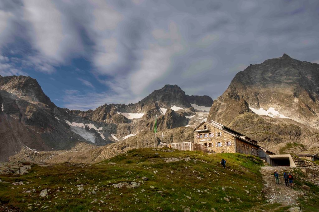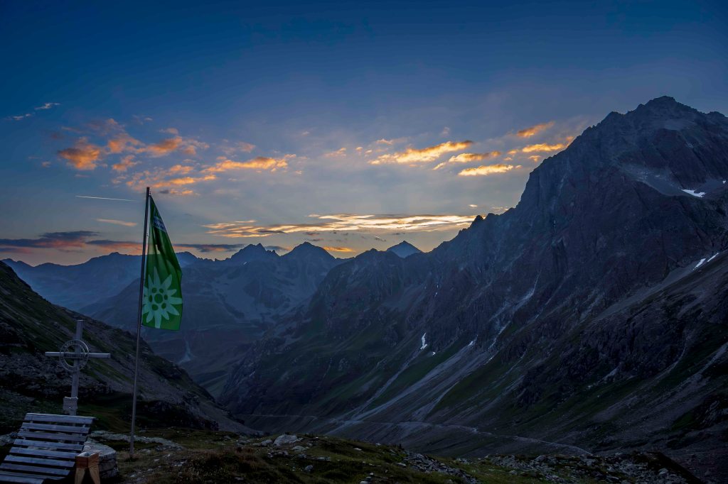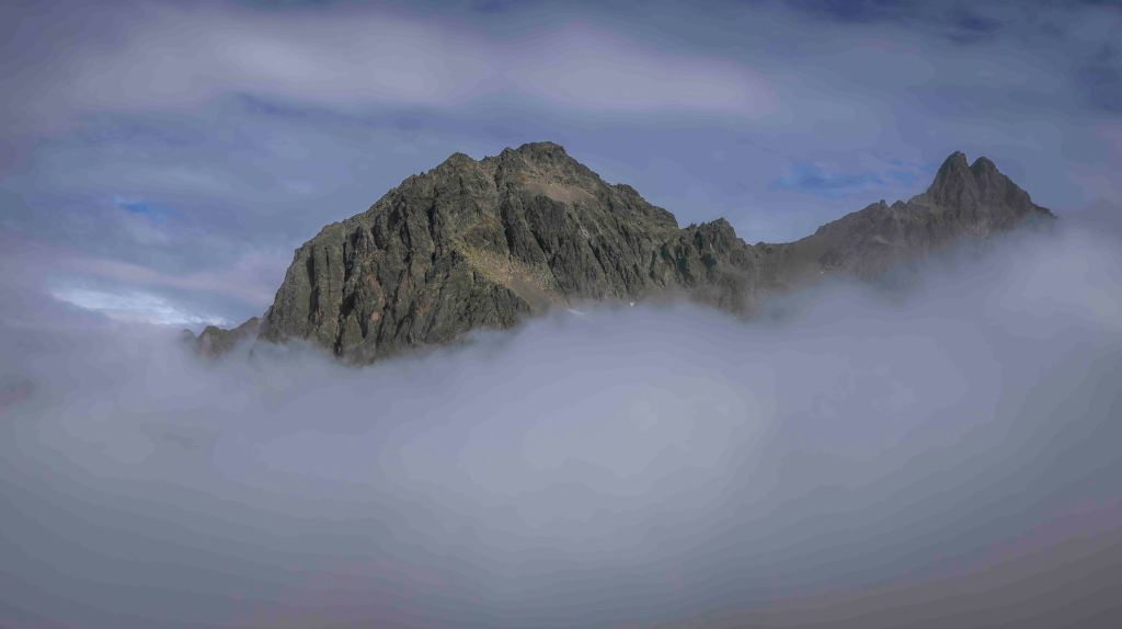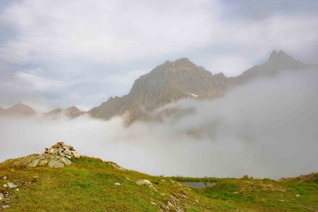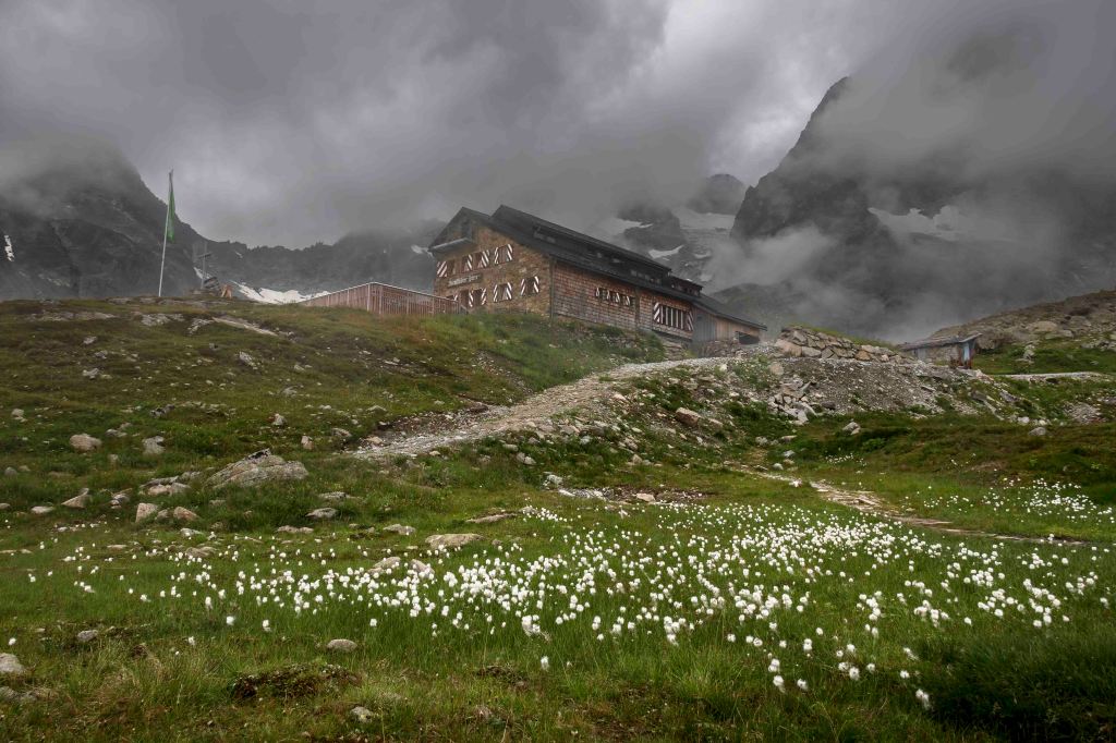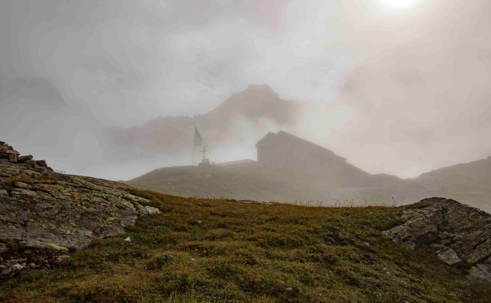 Ein wunderschöner Sonnenaufgang und ein blauer Himmel läuten den Tag ein. Doch schon bald ziehen die ersten Wolken das Tal herauf und hüllen die Hütte und die schroffen Berge in Nebel. Kurz darauf beginnt es auch zu regnen. So habe ich den Ruhetag perfekt ausgesucht. Die Darmstädter Hütte und sein Wirt, der Andi, strahlen noch die alte Welt in den Bergen aus. Die Hütte ist alt, ohne neuzeitliche Anbauten. Die Speisekarte, ich gönne mir zweimal Schweinebraten mit unterschiedlichsten Knödeln, entspricht auch eher den früheren Zeiten. Und der Andi ist die Seele hier oben und sehr bemüht, diesen „alten“ Hüttencharakter zu bewahren.