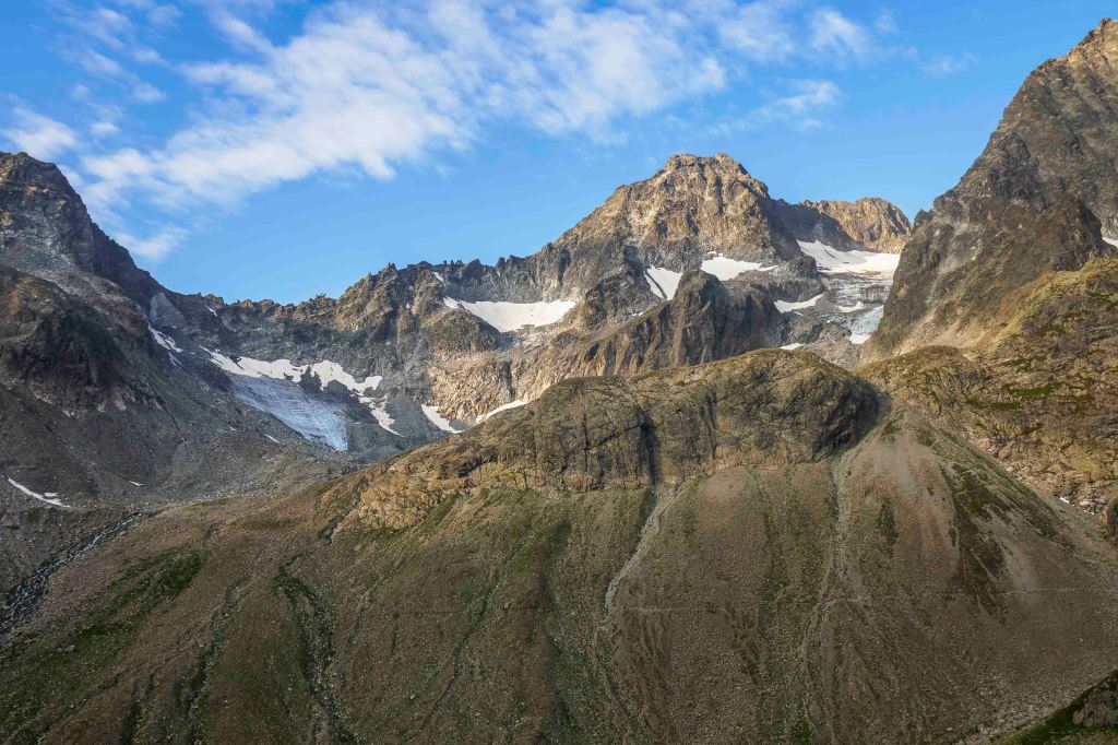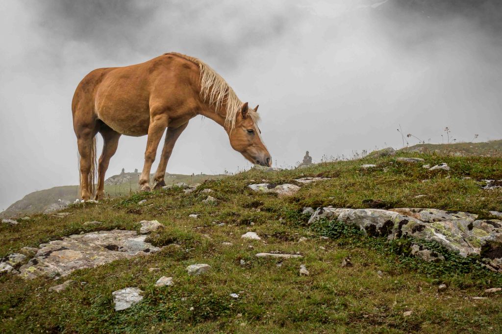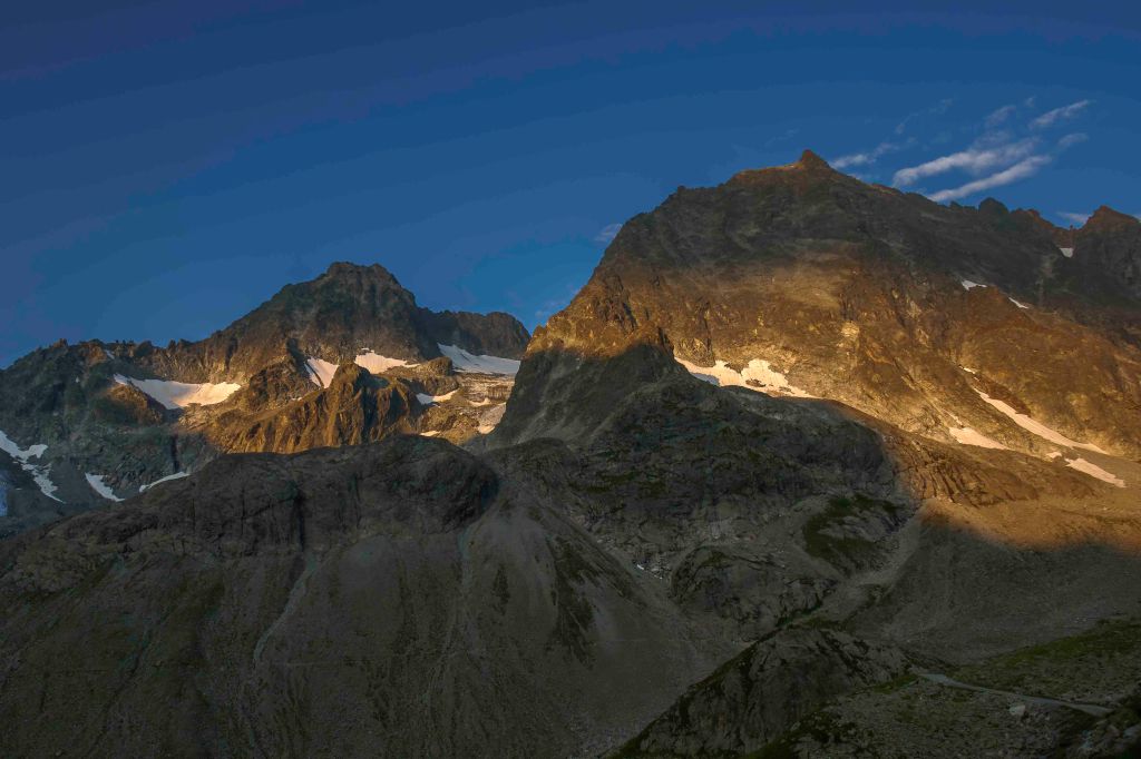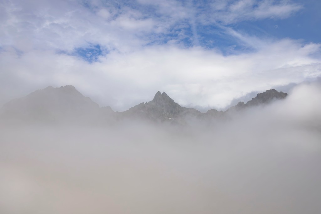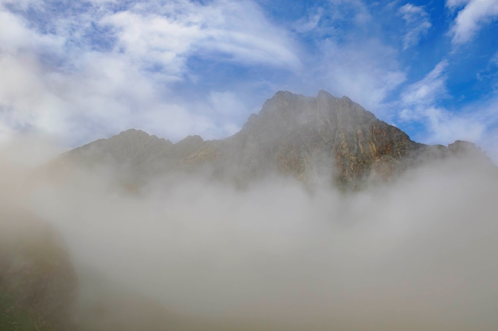 Ein wunderschöner Sonnenaufgang und ein blauer Himmel läuten den Tag ein. Doch schon bald ziehen die ersten Wolken das Tal herauf und hüllen die Hütte und die schroffen Berge in Nebel. Kurz darauf beginnt es auch zu regnen. So habe ich den Ruhetag perfekt ausgesucht. Die Darmstädter Hütte und sein Wirt, der Andi, strahlen noch die alte Welt in den Bergen aus. Die Hütte ist alt, ohne neuzeitliche Anbauten. Die Speisekarte, ich gönne mir zweimal Schweinebraten mit unterschiedlichsten Knödeln, entspricht auch eher den früheren Zeiten. Und der Andi ist die Seele hier oben und sehr bemüht, diesen „alten“ Hüttencharakter zu bewahren.