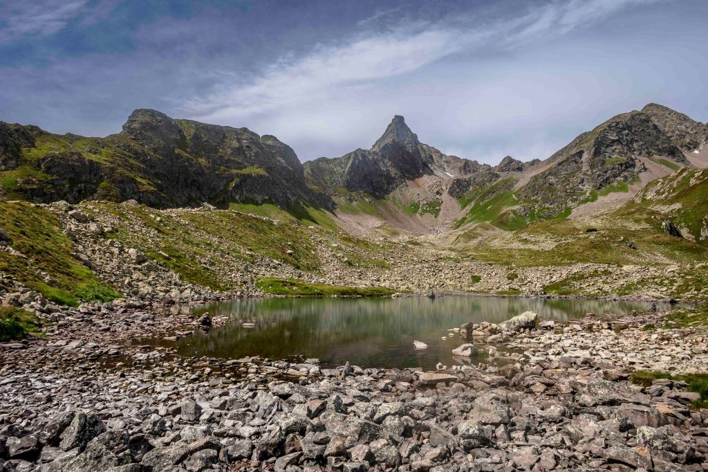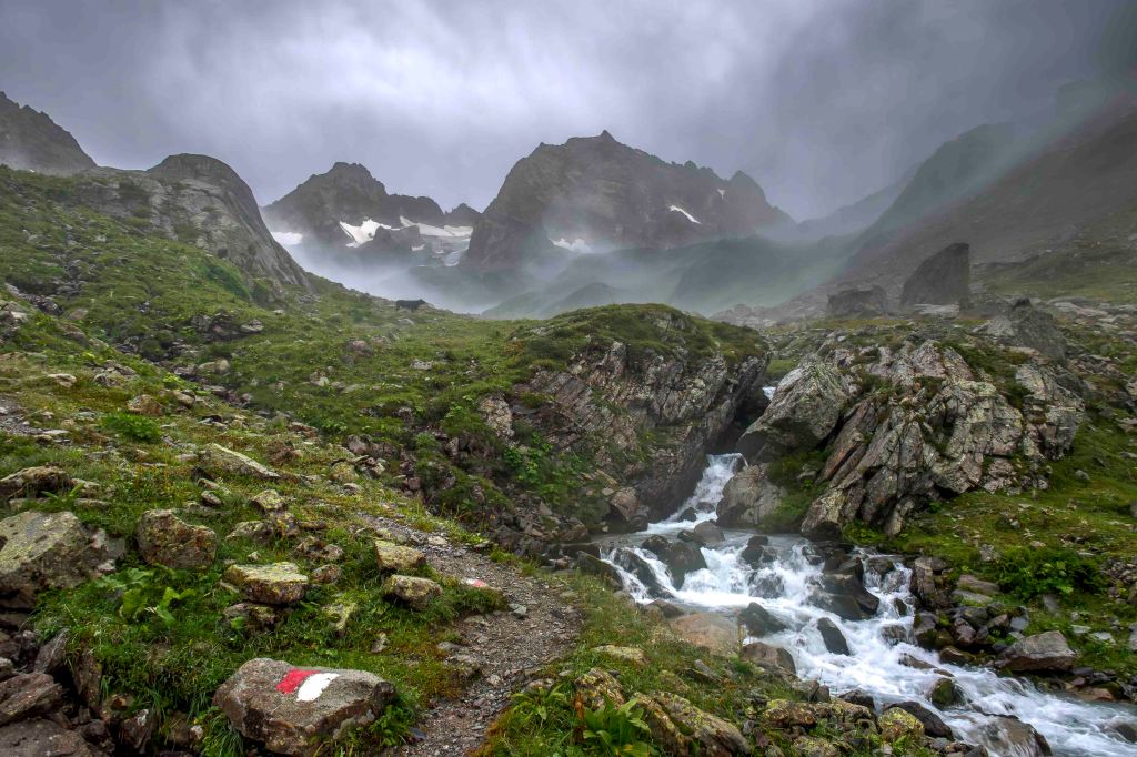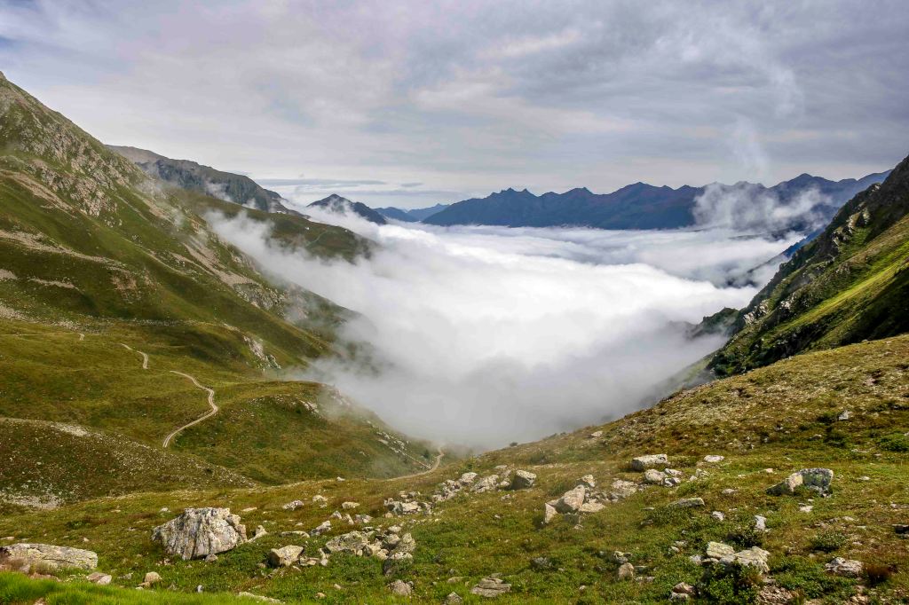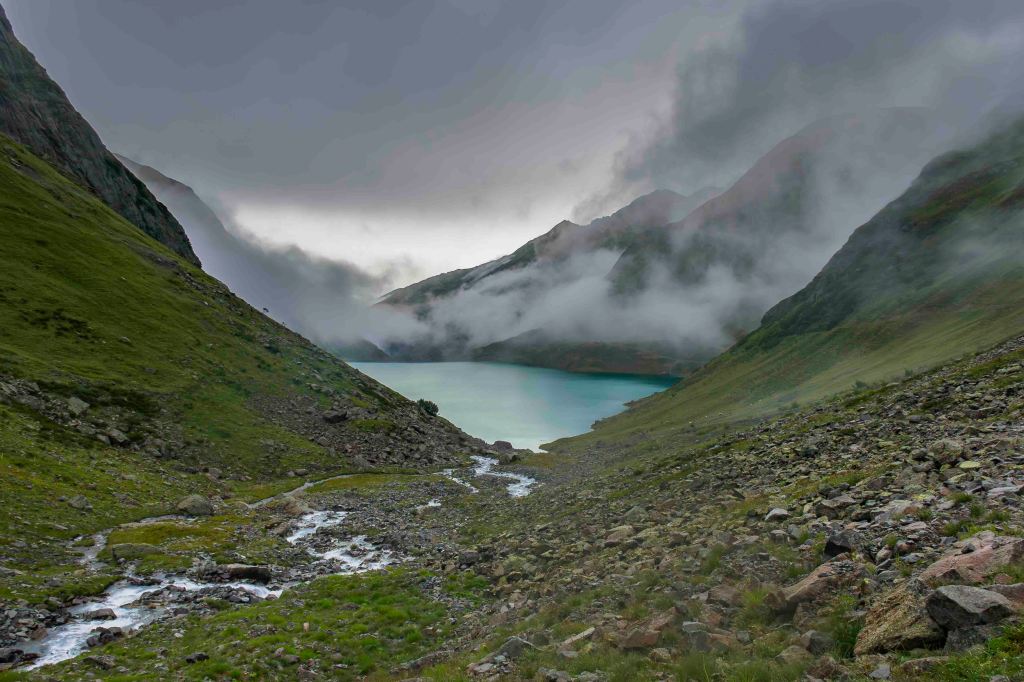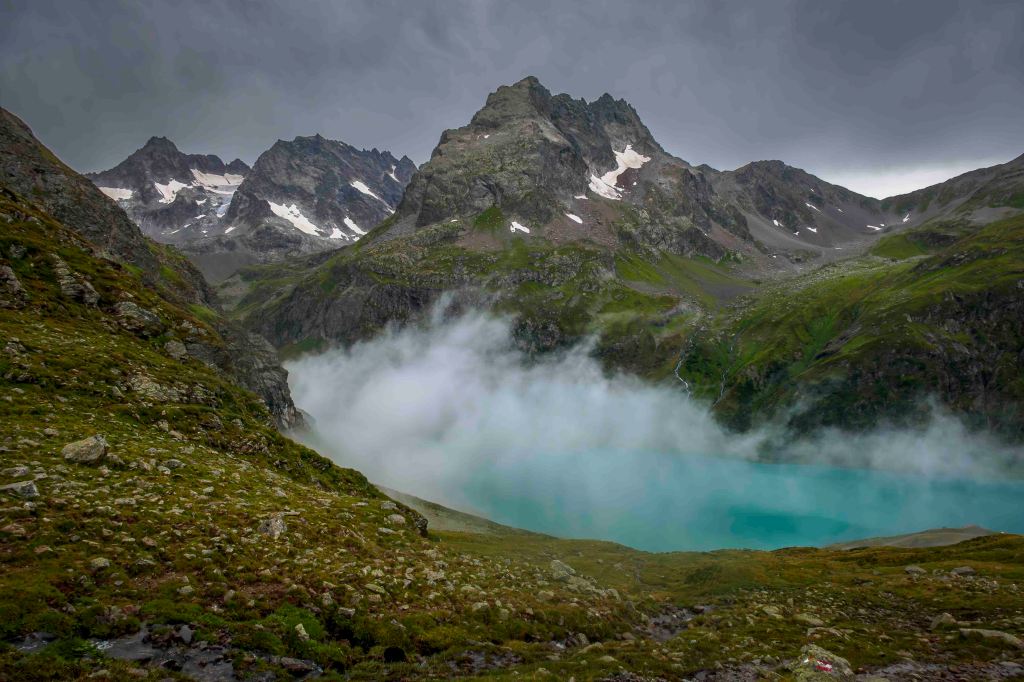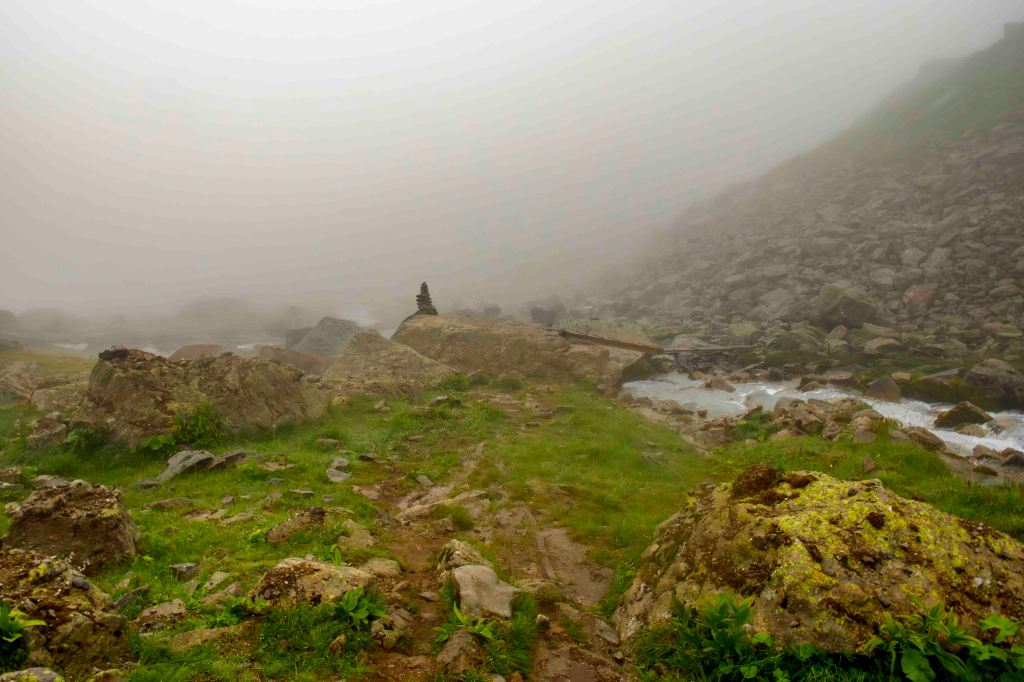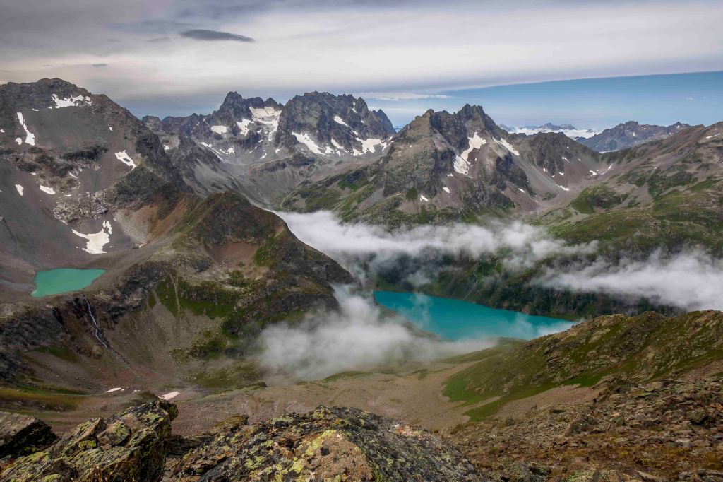 Nach einem ausgiebigen Frühstück verabschiede ich mich vom sympathischen Hüttenwirt Andi. Obwohl der Wetterbericht heute sonniges Wetter voraussagt, sind die Hütte und die umliegenden Berge in dichte Wolken gehüllt. Der Weg geht gemütlich dem jungen Moosbach entlang, einige neugierige Kühe tauchen im Nebel schemenhaft auf. Dann lässt sich der türkisblaue Kartellspeicher erahnen. Nun fallen auch ein paar Regentropfen. Nach einem kurzen Stück auf einem Fahrweg führt der Steig in vielen Schleifen 700 Höhenmeter hinauf zum Seßladjöchli auf 2749 m. Ich kraxle noch den halben Hang zur Seßladspitze hinauf, bis mir der Weg zu schwierig wird. Die Sicht ist einfach fantastisch. Immer wieder ziehen Wolken die Hänge herauf, der Wind reißt der Sonne ein paar Lücken. Unter dem Kartellferner liegt der Kartellsee. Nun geht es steil bergab zur Niederelbehütte, die vom Joch aus schon zu sehen ist.