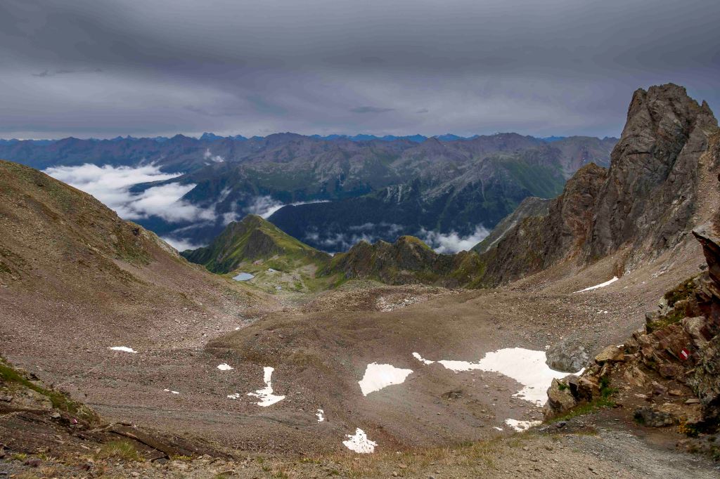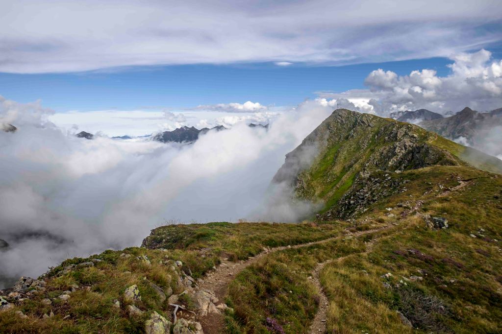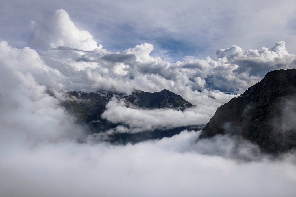 Es ist ein kleiner halbstündiger Spaziergang zum Hausberg der Hütte, dem Kappler Kopf, 2404 m. Auch jetzt noch steigen immer wieder Wolken aus dem Tal auf, über den Bergen sind sie arg zerrissen.