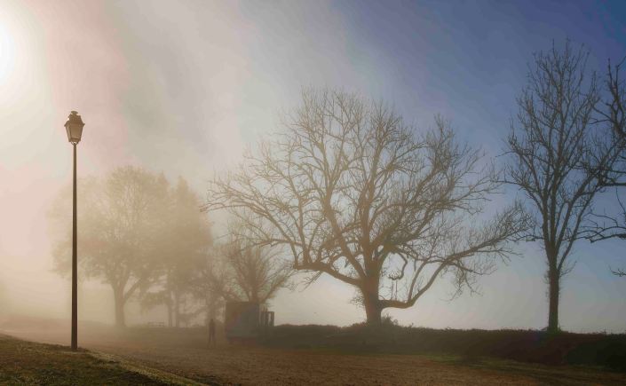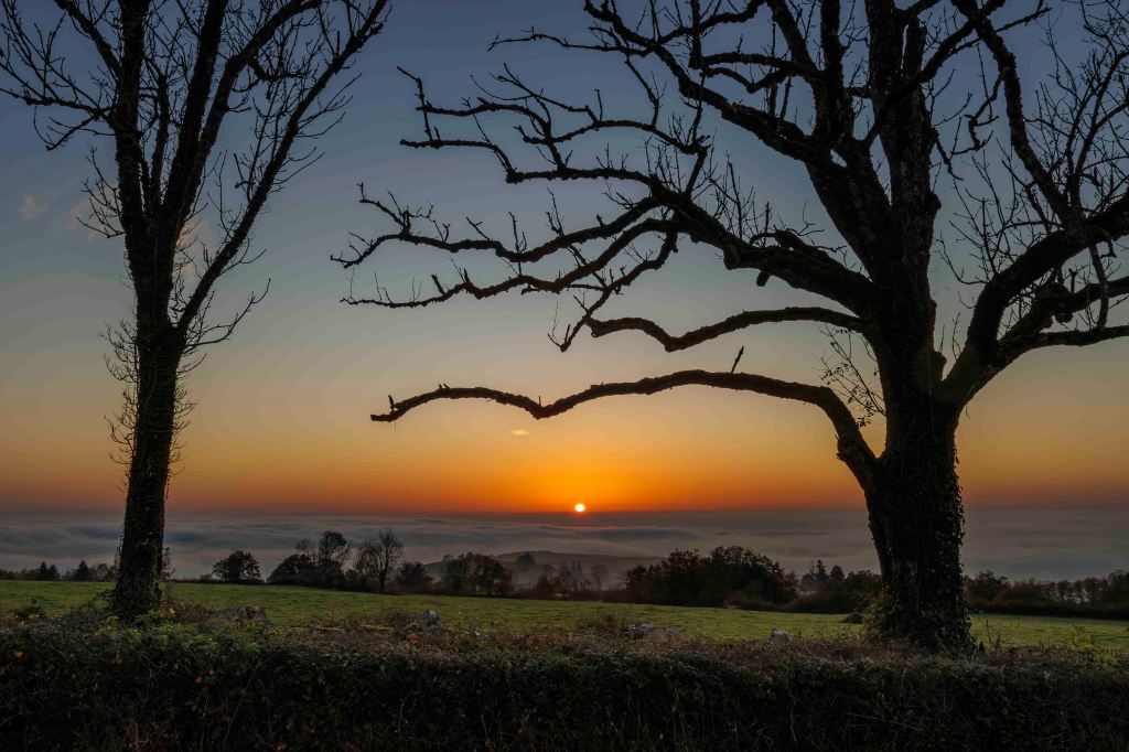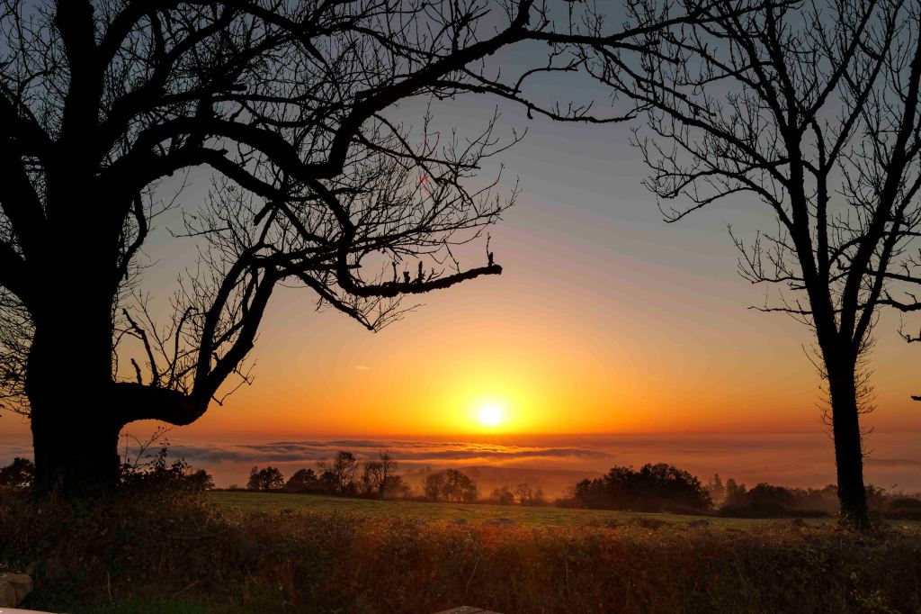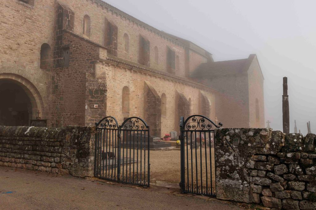Viel Wetterglück haben wir, als wir den Hügel zum Dorf Mont Saint-Vicent erklimmen. Auf etwa 600 m sind wir für ein paar Stunden über den Wolken. Wie gut die Sonne und die Wärme tun. Die Gräber sind mit frischen Blumen bunt geschmückt, es ist Allerheiligen, was sonst eher selten ist. Meist zieren nur Plastikblumen die Ruhestätten. Dann ein Sonnenuntergang wie aus dem Bilderbuch. Eigentlich wollten wir noch einen Tag bleiben, doch am Morgen sehen wir kaum fünfzig Meter weit.