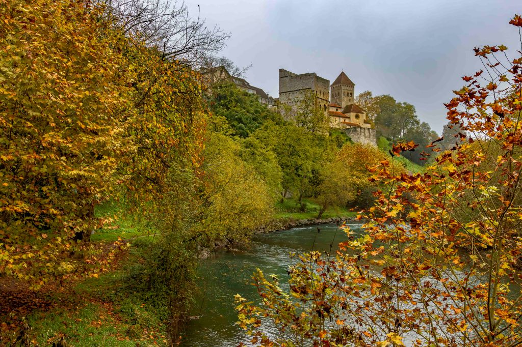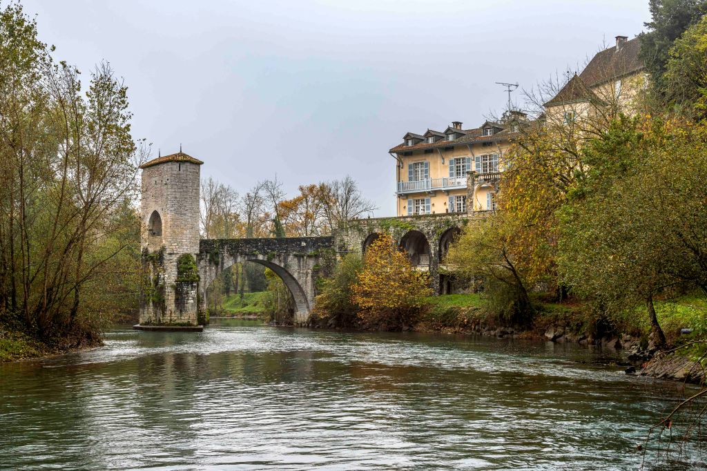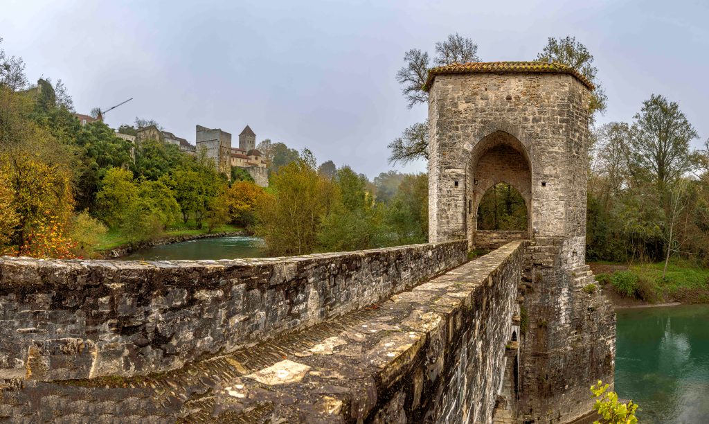 Es herrscht weiterhin typisches Novemberwetter, die Wolken reichen bis zum Boden. So reisen wir zügig weiter in den Süden. Das mittelalterlichen Sauveterre-de-Béarn bietet uns wieder einen ruhigen Übernachtungsplatz. Der Name des Ortes bedeutet „sicherer Ort“. So war er auch Zufluchtsort für die Pilger auf dem Jakobsweg. Von der mächtigen Befestigungsanlage zeugt heute noch der Tour Monréal. Über den Gave d’Oloron spannt sich die Pont de la Légende, um die sich einige Sagen spinnen. Ebenso mächtig ist die romanisch-gotische Kirche Saint-André. Und wie in vielen Orten ist das Rathaus sehr repräsentativ.
