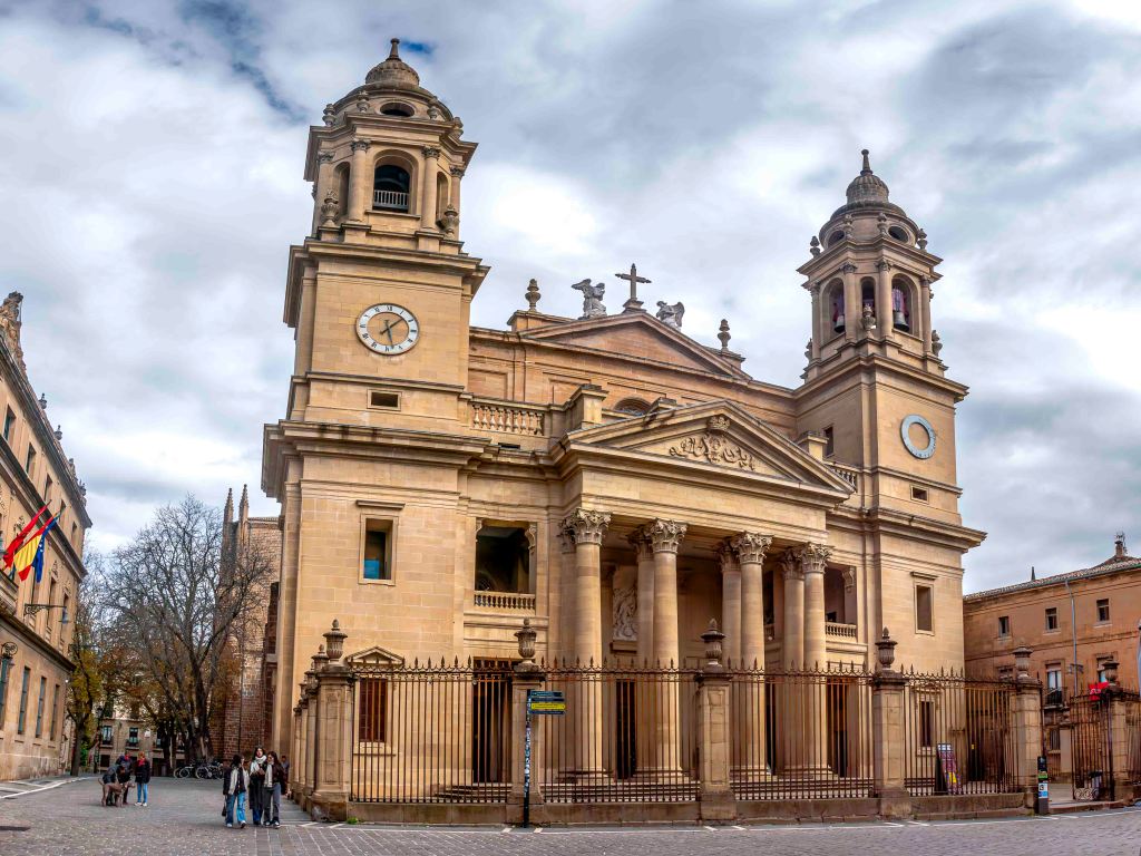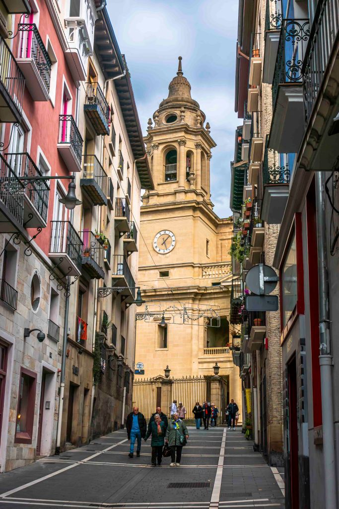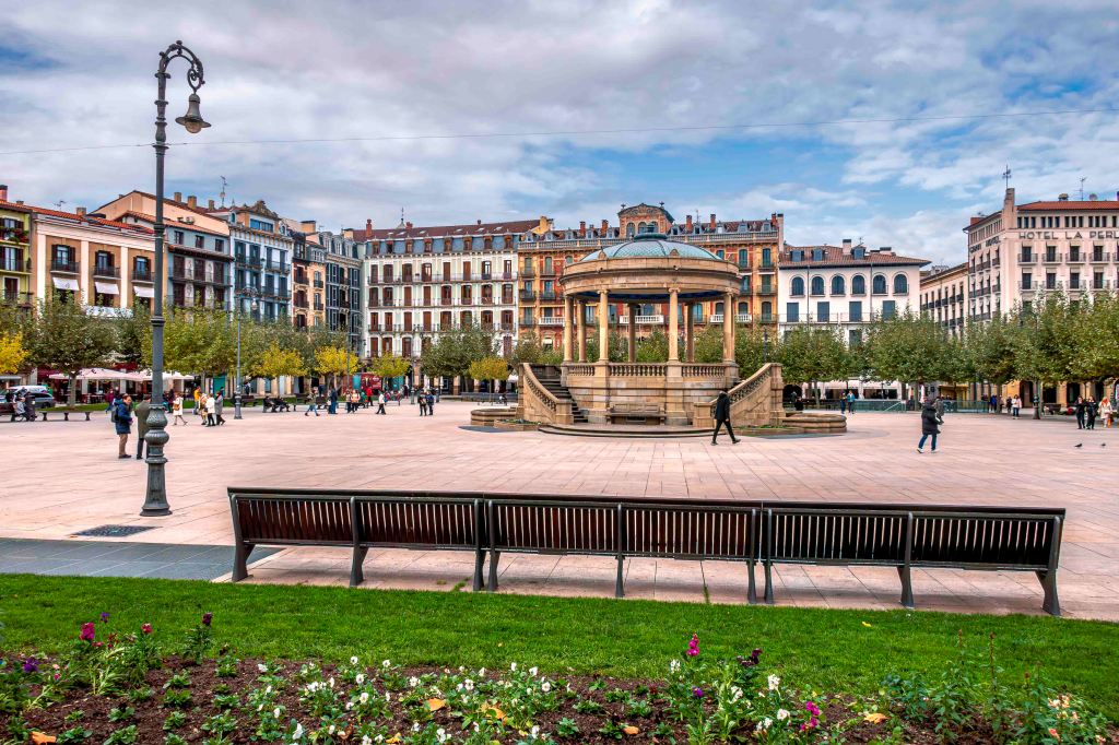 Unsere erste Übernachtungsstation ist Pamplona, Hauptstadt der autonomen Region Navarra. Dies ist so gar nicht typisch für uns, da wir gerne Großstädte meiden. Doch am Stadtrand liegt ein ruhiger offizieller Wohnmobilplatz mit Sicht auf die Stadt. Pompeius, von dem sich auch der Name ableitet, gründete die Stadt 74 v.u.Z. Da sie am strategisch wichtigen Pyrenäenübergang Roncesvalles liegt, den wir gerade überquerten, wurde sie mehrmals zerstört und immer wieder stark befestigt. Bekannt ist Pamplona auch wegen seiner der Encierro, bei dem totesmutige Menschenmassen in den engen Gassen vor einem Stier davon laufen. Wohnzimmer der Stadt ist die Plaza del Castillo mit einigen handtuchbreiten Häusern. Inmitten des Häusermeeres und den engen Gassen erhebt sich die gotische Kathedrale Santa Maria la Real. Etwa deplatziert wirkt die barocke Fassade des Rathauses.