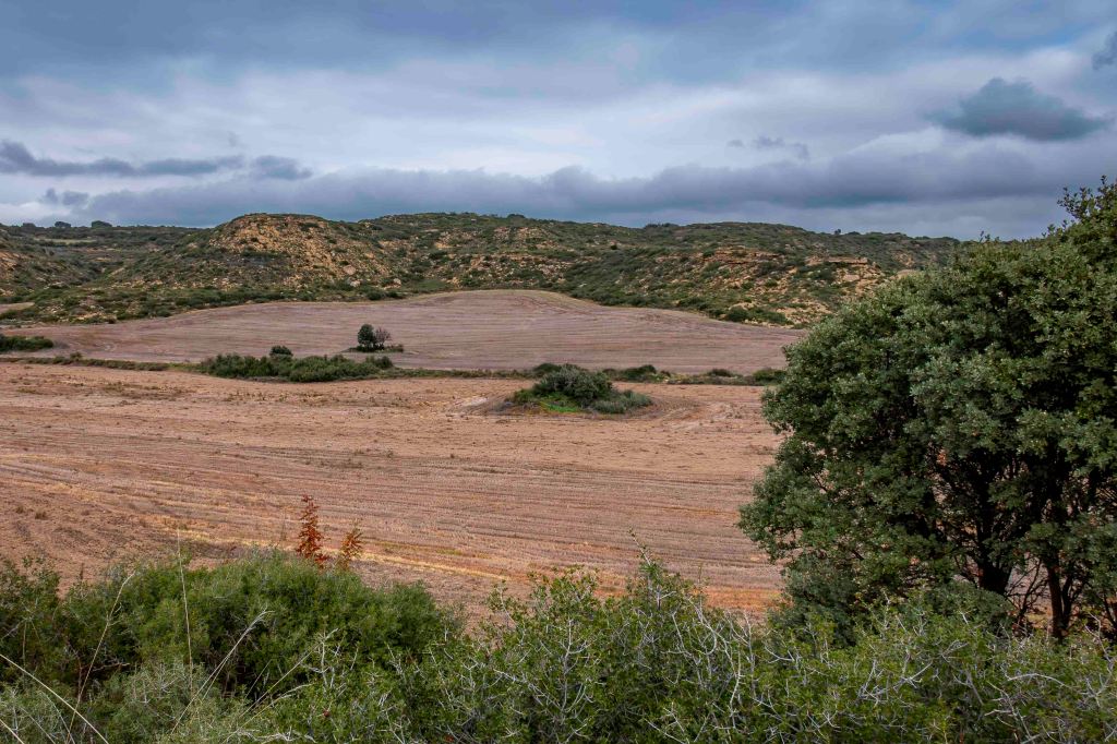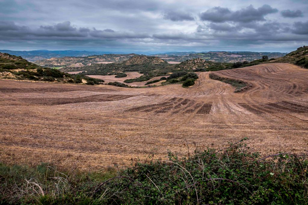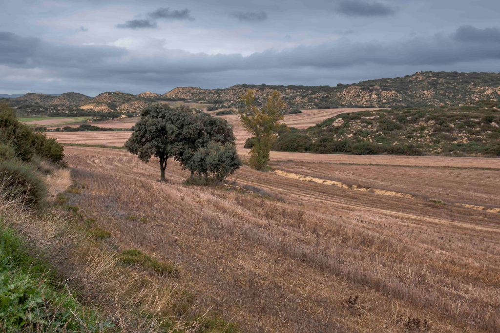 Es wird immer einsamer. Auf einer gut ausgebauten Straße, auf dem uns nur sehr wenige Autos begegnen, durchqueren wir eine weite, leicht hügelige Landschaft, in der riesige, jetzt natürlich abgeerntete Kornfelder, bis zum Horizont reichen. In einem kleinen Supermarkt in Sábada kauft Susanne ein, zur ihrer Freude recht gutes Weißbrot. Der kleine Ort Layana bietet uns wieder einen einfachen, aber aussichtsreichen Stellplatz für unser Wohnmobil. Kaum sind wir angekommen, zieht eine Schar Geier über uns hinweg. Trotz der Vorhersage für sonniges Wetter bleibt der Himmel meist grau – typisches Novemberwetter. Peter fährt eine Runde mit dem Rad durch die herbstliche Landschaft.