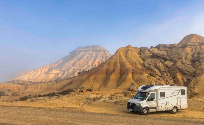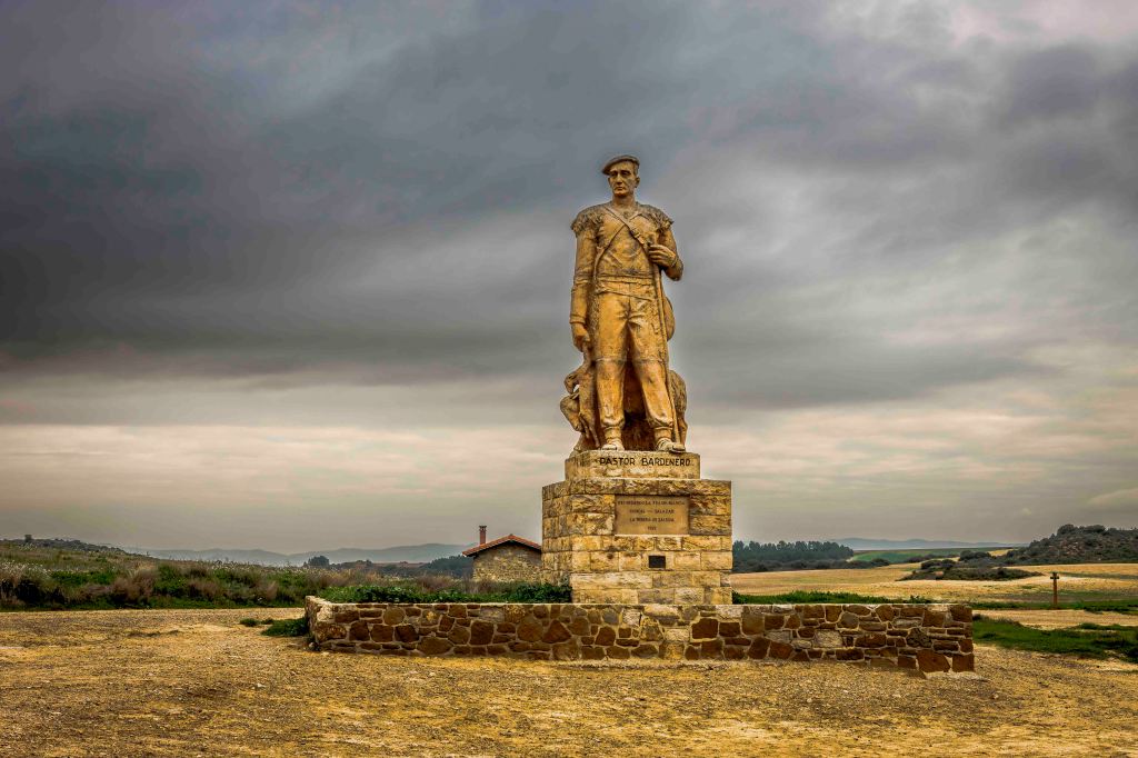 Heute fahren wir in die Halbwüste Bardenas Reales. Den Eingang zum Naturpark bewacht ein Hirte, als Denkmal. Staunend fahren wir durch diese einmalige und besondere Landschaft. Unser Bruno klappert zwar bedenklich auf der Schotterstraße, aber wir kommen im mäßigen Tempo bis nach Arguedas und parken dort auf dem offiziellen Wohnmobilplatz (das Übernachten im Naturpark ist verboten). Vor uns ist eine Klippe, mit Höhlenwohnungen, die bis 1960 bewohnt waren. Nachts werden sie mit allen Farben beleuchtet, es wirkt schon ein wenig gespenstisch.