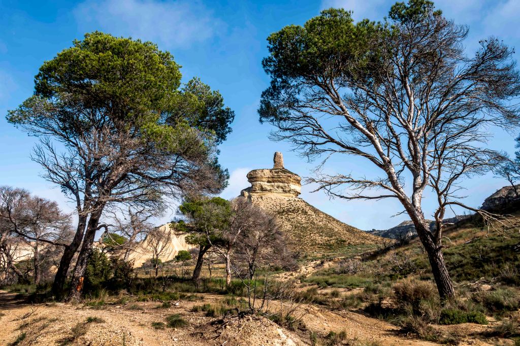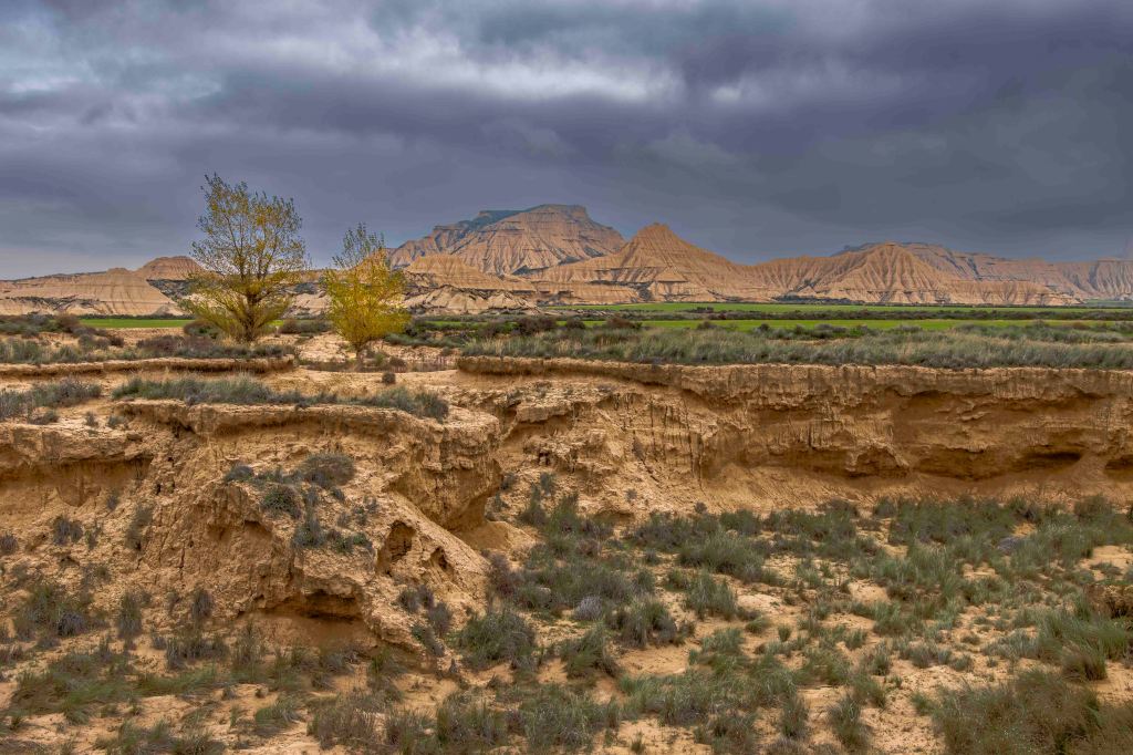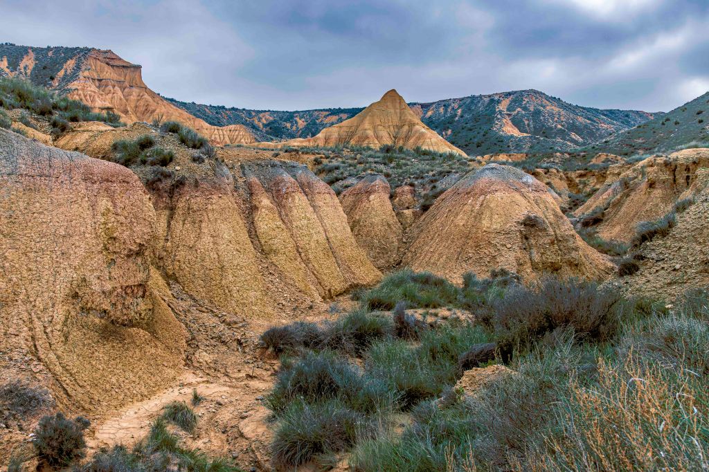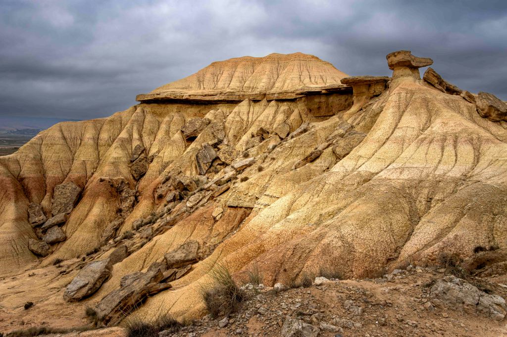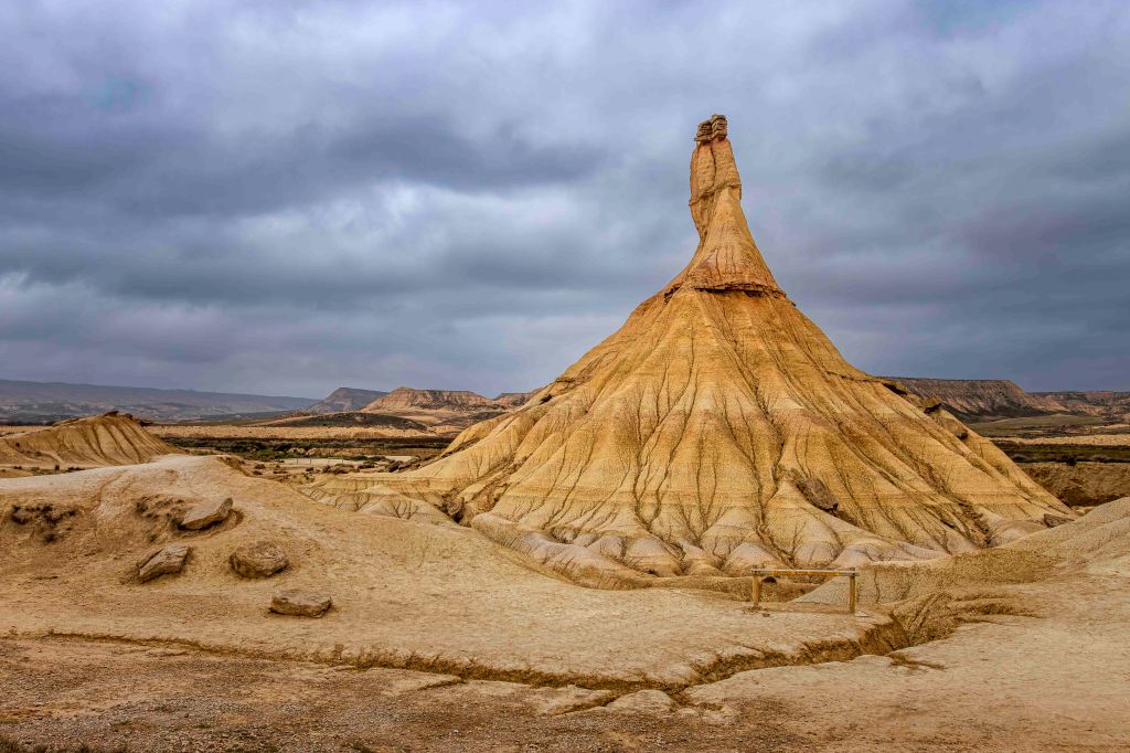 Die Bardenas Reales, bizzare Felsen aus ockerfarbenem Kreide- und Tongestein, hat sich durch Erosionsprozesse gebildet, die über Millionen von Jahren wirkten. Die Region besteht hauptsächlich aus sedimentären Gesteinen, die während der geologischen Aktivität im Tertiär und Quartär abgelagert wurden. Wasser, Wind und Temperaturunterschiede haben das Gelände geformt und die charakteristischen Hügel, Täler und Trockentäler (sogenannte „badlands“) geformt.