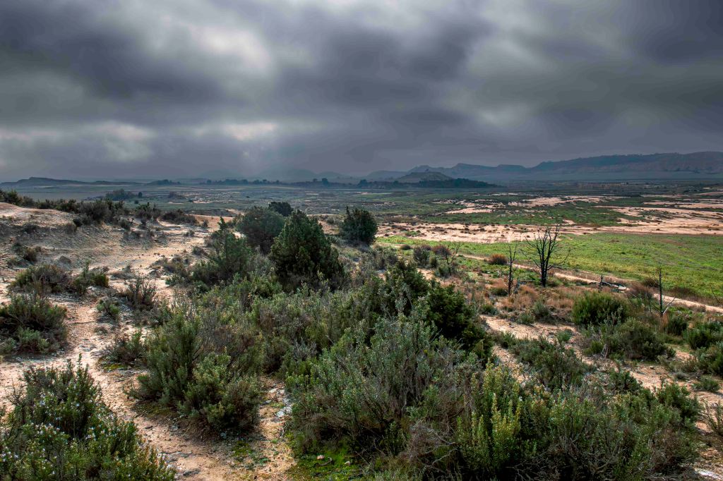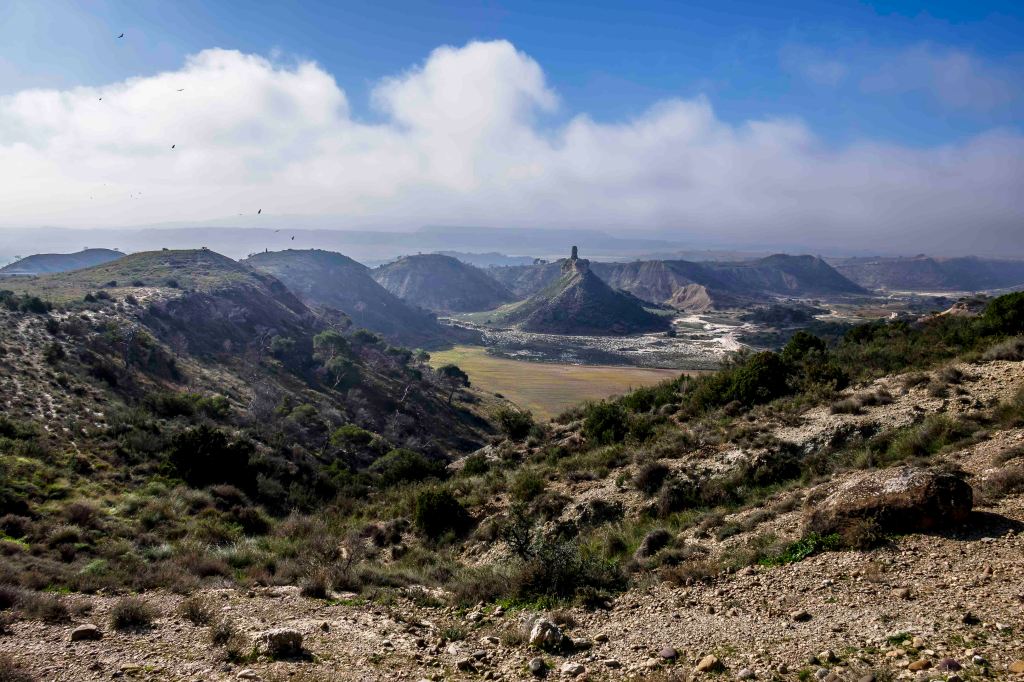 Am nächsten Morgen fahren wir im dichten Nebel bis zum Cabezo de las Cortinillas. Von hier fährt Peter eine weite Runde durch die landschaftlich abwechslungsreiche Bardenas Reales. Viermal muss ein neuer Weg gefunden werden, da jeweils Wasser den Pfad in den Trockentälern weggespült hat. Es scheint in letzter Zeit hier heftige geregnet zu haben.