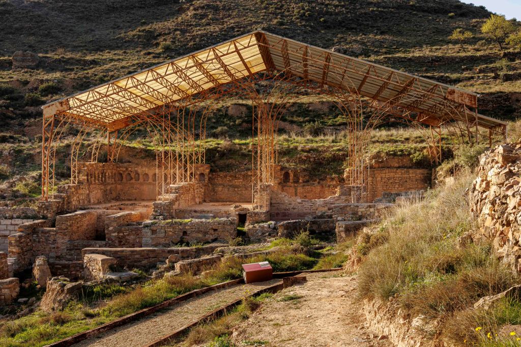 Viele Kilometer fahren wir durch eine weite und recht eintönige Ebene. So kommen wir bis nach Calatayud, das in einem Talkessel, eingerahmt von hohen Bergen liegt. Auf steiler und enger Straße erreichen wir den Besucherparkplatz der Römerstadt Bilbilis. Hier ist es ruhig und wir haben einen schönen Blick ins Tal des Rio Jalón. Die römische Siedlung nahm fast den ganzen Berg Cerro de Bámbola ein. Sie war in den ersten beiden Jahrhunderten n.u.Z. ein wichtiges militärisches und administratives Zentrum, in dem auch der Handel blühte. Auch wurden hier Waffen und Werkzeuge hergestellt. Mächtig ist die Plattform des Forums, auf dem auch ein Tempel stand. Das Rund des Theaters ist noch gut zu sehen. Auch gab es hier Thermen. Aber wie kam das viele Wasser hier auf den Berg?