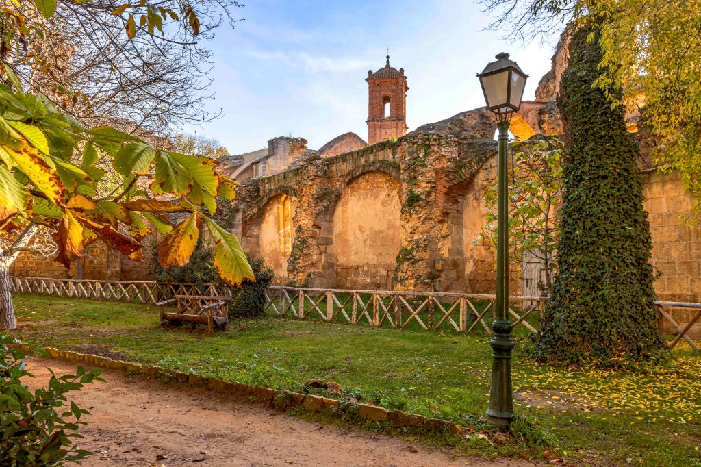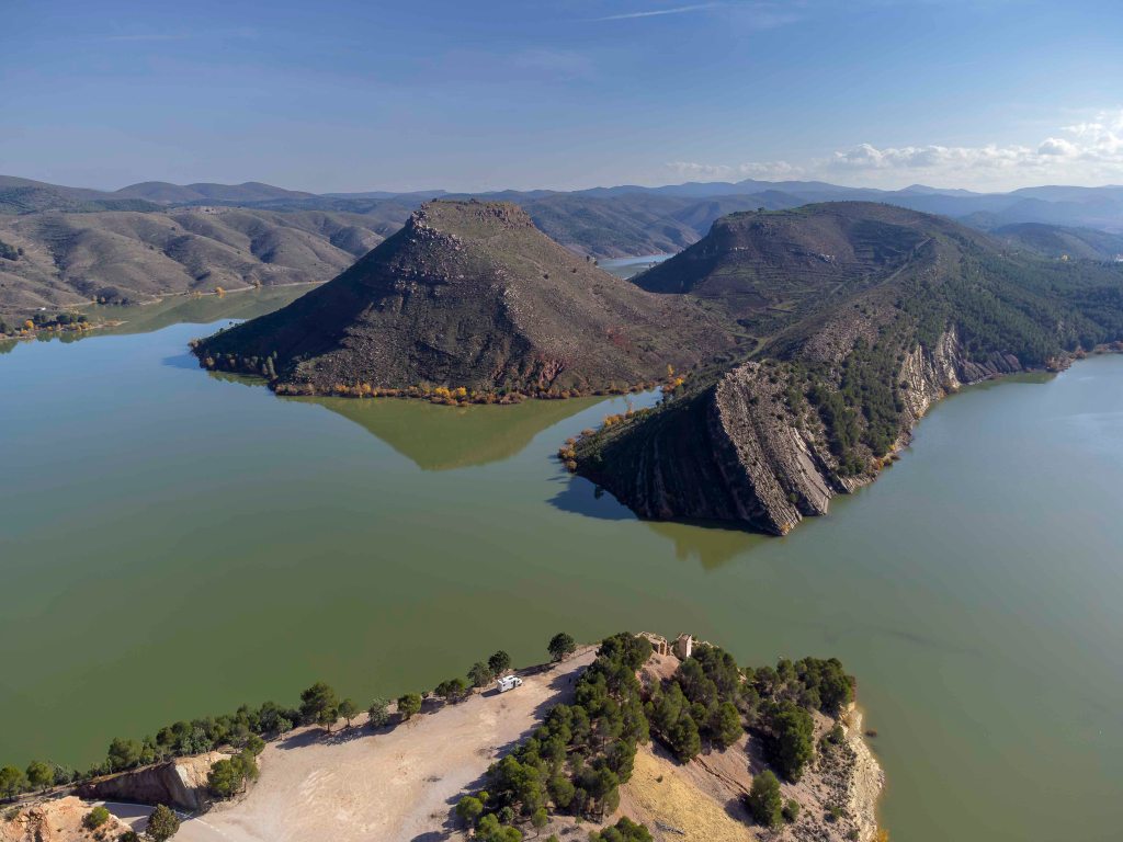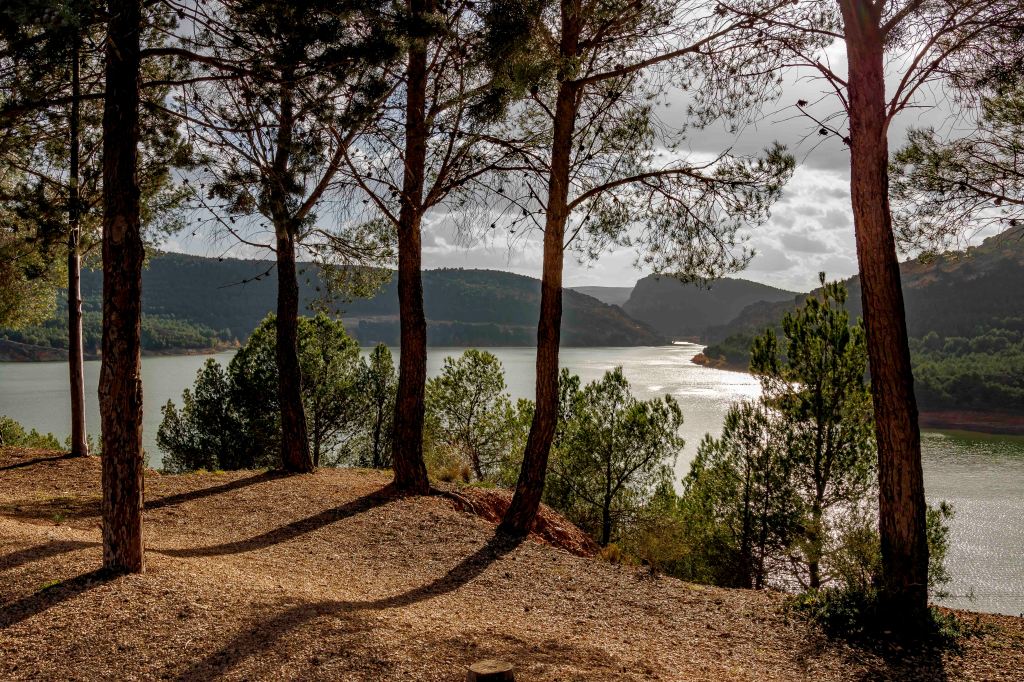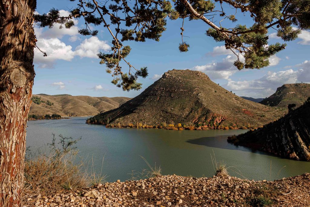 Wir verlassen Calatayud, erklimmen die Berge und lassen so den Nebel im Tal des Río Jalón hinter uns. Ziel ist das Monasterio de Piedra. Doch als wir auf dem weitläufigen Parkplatz ankommen, steht da kein einziges Auto. 1194 erhielten Mönche eine vormals arabische Burg geschenkt und errichteten darauf ein Kloster, um den Glauben in der Gegend zu festigen. Doch Mitte des 19. Jahrhunderts wurde es gebrandschatzt und geplündert. Ein Pablo Muntades Campeny übernahm die Gebäude und betrieb Landwirtschaft, sein Sohn gestaltete am Río Pedra einen Park und legte die erste Fischzucht in Spanien an. Leider ist der sehenswerte Park geschlossen. Vielleicht ist der Grund ein Unwetter am 5. September diesen Jahres, als der Fluss statt einen Kubikmeter pro Sekunde 31 Kubikmeter Wasser führte und die Anlage überschwemmte. So fahren wir etwas enttäuscht weiter an den einsamen Stausee Embalse de la Tranquera. Eigentlich müsste er nach dem trockenen Sommer fast leer sein, doch jetzt stehen die Bäume metertief im braunen Wasser.