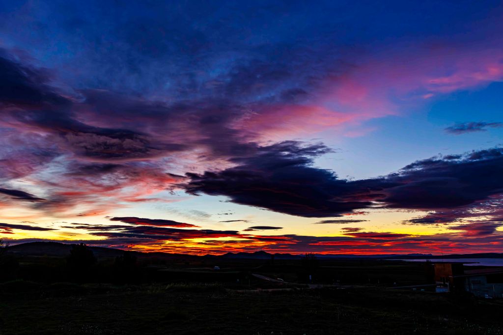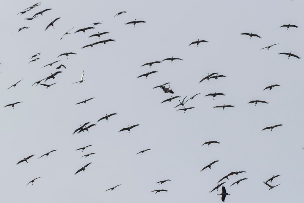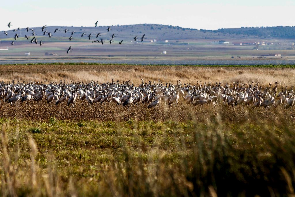 Bei der Weiterfahrt passieren wir nochmals das Monasterio de Piedra. Entlang der mächtigen Wehrmauer gelangen wir zum Río Piedra, der wild sprudelnd mit viel Wasser in den jetzt geschlossenen Park fließt. Später kommt uns ein Auto entgegen, dessen Fahrer uns signalisiert, dass die Straße gesperrt ist. Dennoch fahren wir weiter und stoßen schon nach kurzer Strecke auf eine Baustelle. Die Bauarbeiter winken uns durch. Dann sehen wir, dass der unscheinbare Bach auf vielen Kilometern das Tal meterhoch überschwemmte, Bäume und Leitplanken mitriss und die Teerdecke auf großer Strecke abtrug. Die Straße ist notdürftig repariert, so erreichen mit einigem Hoffen und Bangen unser Ziel: die Laguna de Gallocanta. Von unserem Übernachtungsplatz aus beobachten wir einen riesigen Schwarm Kraniche. Als Peter sich ihnen nähert, fliegt der gesamte Schwarm auf und zieht in die nächste Bucht. Am späten Nachmittag kehren sie wieder in unsere Nähe zurück, sind jedoch auch diesmal scheu und fliegen auf und davon. Wie im Kino bestaunen wir die farbenprächtigen Sonnenauf- und -untergänge.