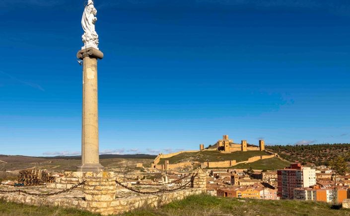 Auch in Molina de Aragón wacht eine imposante Burganlage über der Stadt. Die im 8. Jahrhundert bis weit in den Norden der Iberischen Halbinsel vorgedrungenen Mauren errichteten auf dem markanten Burgfelsen eine neue Festung, die um das Jahr 1129 im Zuge der Reconquista von Alfons I. (reg. 1104–1134) den Mauren abgenommen und kurz darauf in vergrößerter Form neuerrichtet wurde. Ort und Burg waren lange zwischen den Königreichen Kastilien und Aragón umstritten, ehe sie im ausgehenden 14. Jahrhundert als Mitgift Katharinas von Lancaster endgültig an Kastilien fielen.