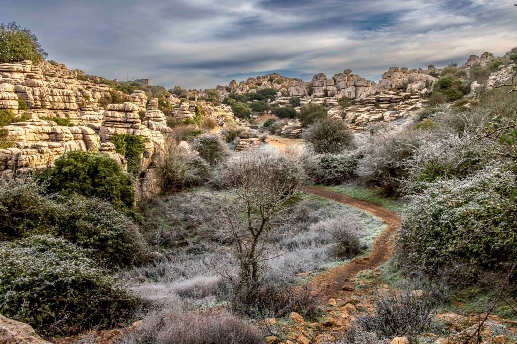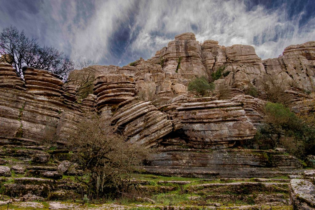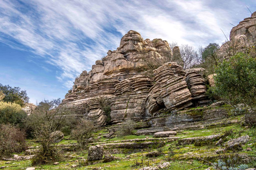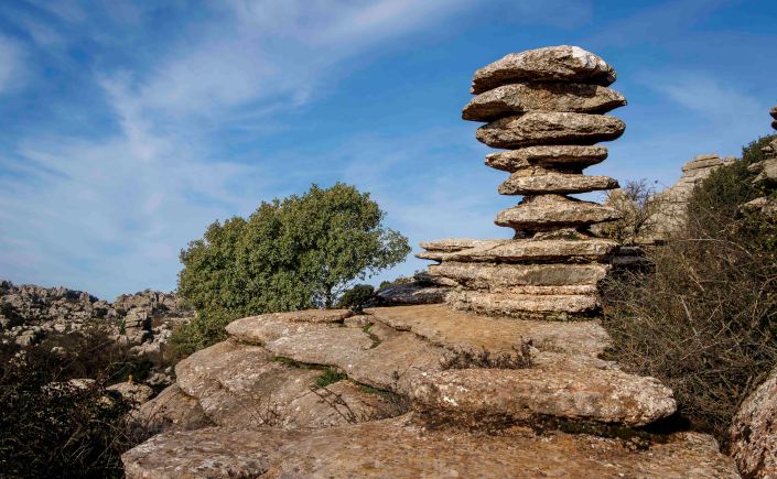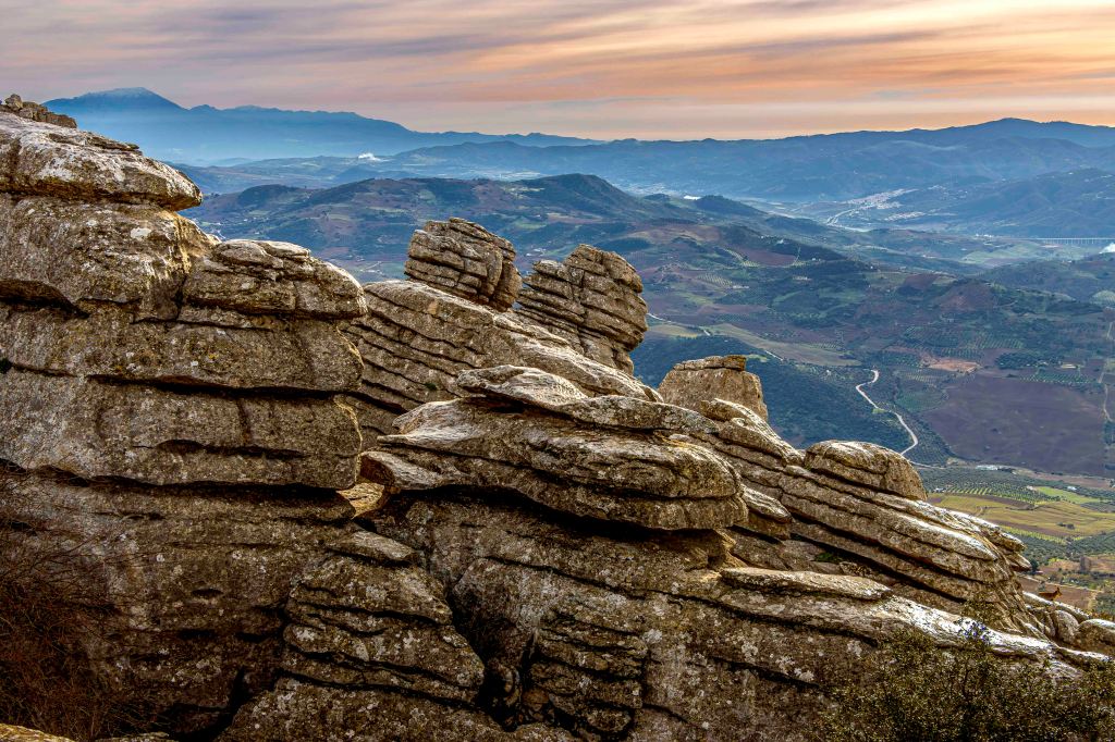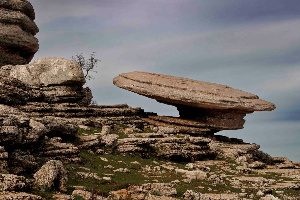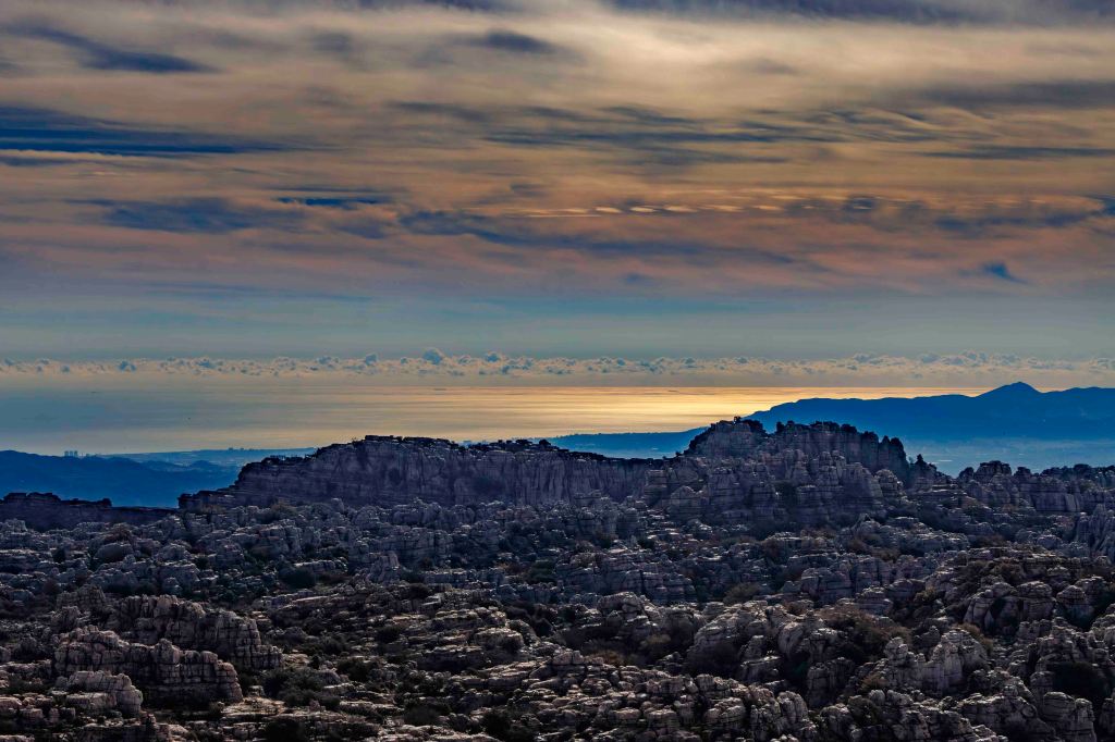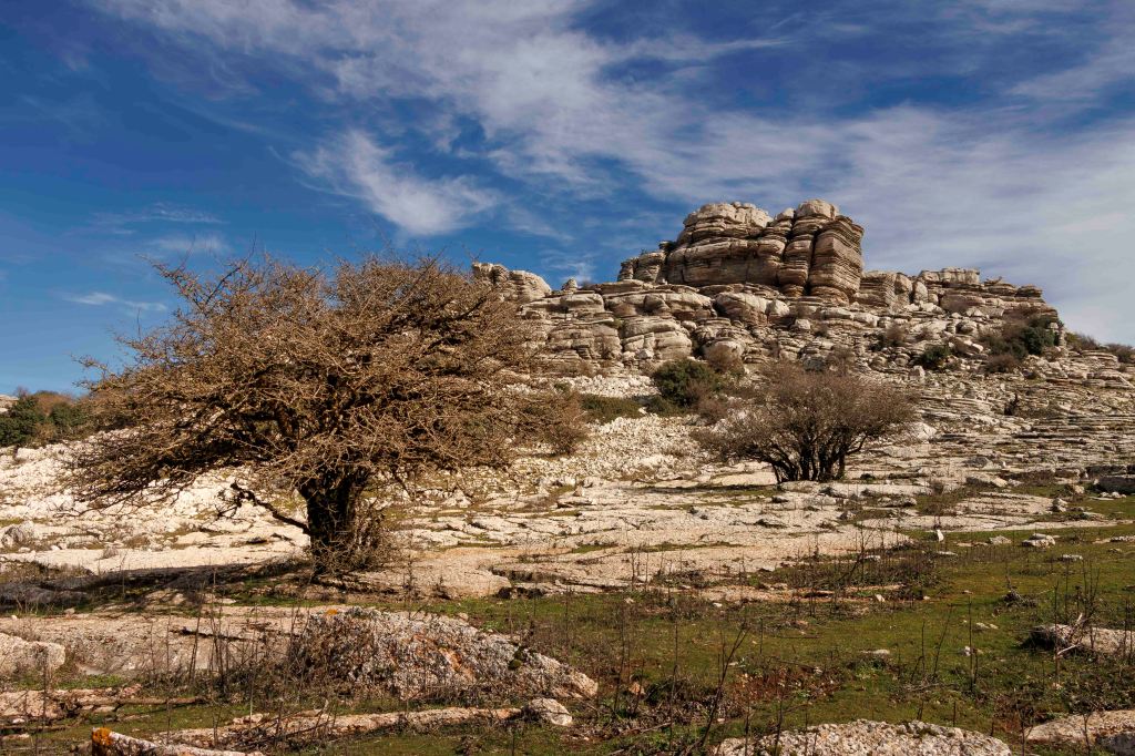Die Landschaft wird nach den weiten Kornfeldern sowie bis an den Horizont reichenden Mandel- und Olivenhainen wieder abwechslungsreicher. Ein paar Kilometer von unserem Standort in Antequera entfernt erhebt sich der Paraje Natural Torcal de Antequera auf bis zu 1400 m. Vor 100 Millionen Jahren war hier noch das Meer Tethys, von dem jetzt noch das Mittelmeer übrig geblieben ist. Die bizarren Formen des Karstgesteins entstanden durch Verwitterung der unterschiedlichen Schichten. Manche baut die Kohlensäure schneller ab, manche langsamer. So sehen einige Gebilde wie übereinander geschichtete Pfannkuchen aus. Dazwischen tummeln sich gar nicht scheue Iberische Steinböcke. Leider, oder glücklicherweise, ist das Übernachten in der Paraje Natural, einer so eingestuften Naturgegend, nicht mehr gestattet.