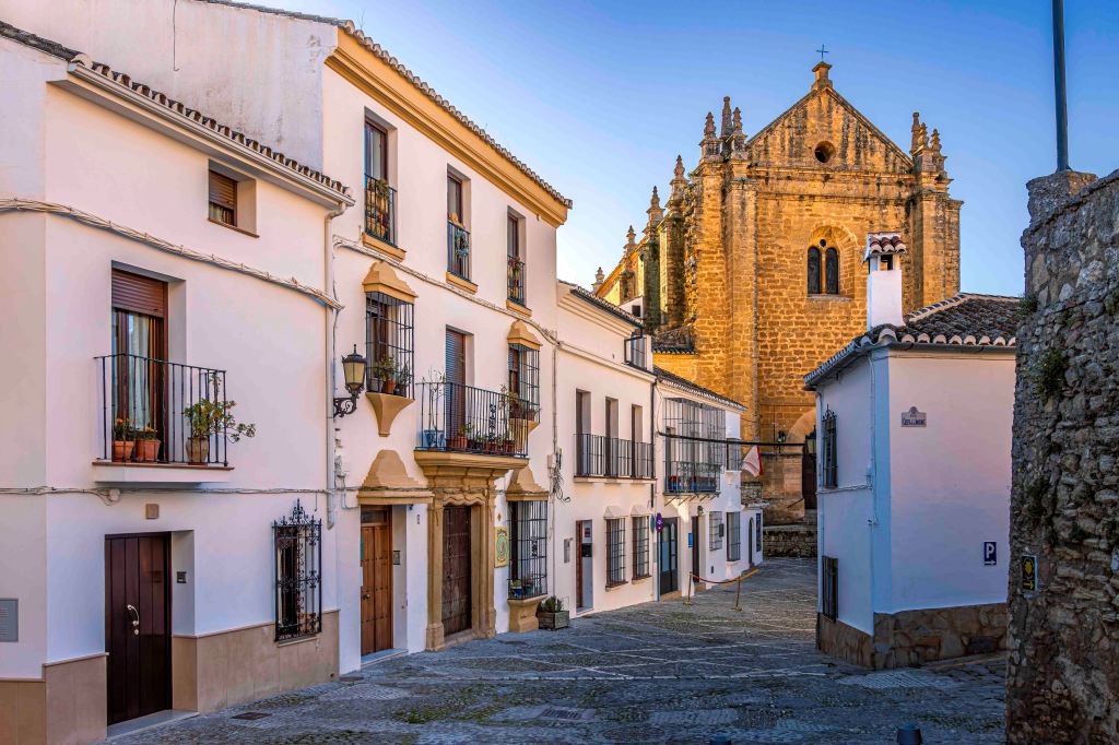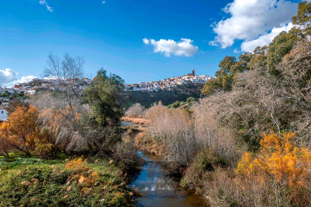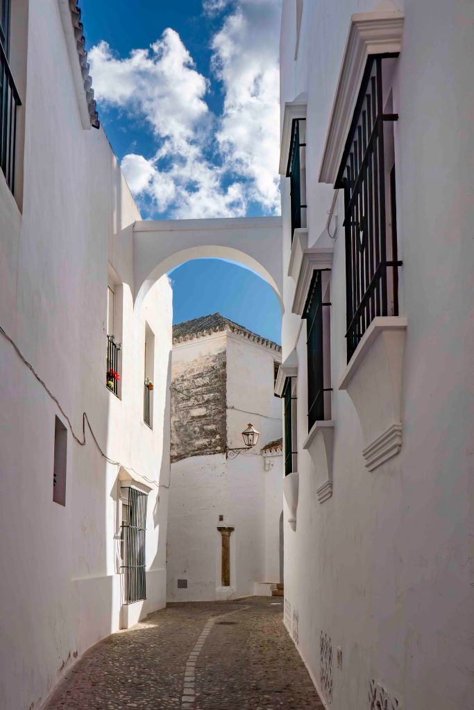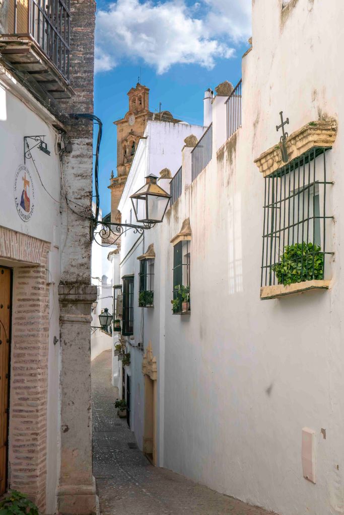 Nun fahren wir wieder nach Norden ins Landesinnere, zu den Pueblos Blancos, den Weißen Dörfern, die sich in ganz Andalusien verteilen. Die Orte sind meist arabischen Ursprungs, mit engen Gassen, weißgetünchten Häusern und auch jetzt im Winter mit manchen Blumen vor den Fenstern. Da die ganze Zeit über die Sonne von einem fast wolkenlosen Himmel scheint (gut für das leibliche Wohlbefinden, schlecht für den Fotografen), strahlen die pittoresken Dörfer im hellen Licht, überragt von mächtigen sandsteinfarbenen Kirchen und Burgen.