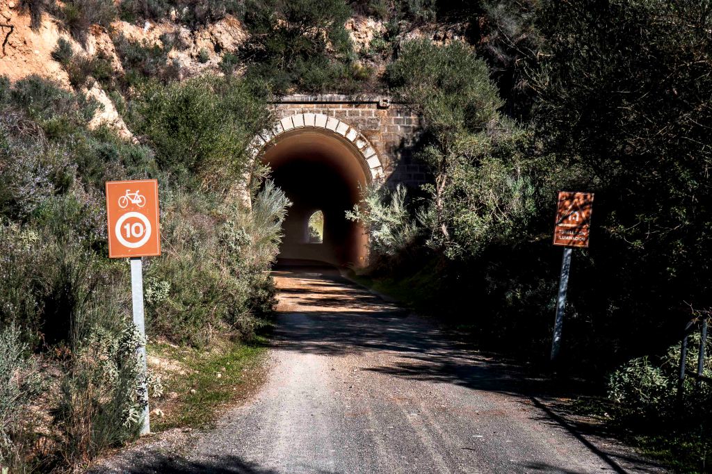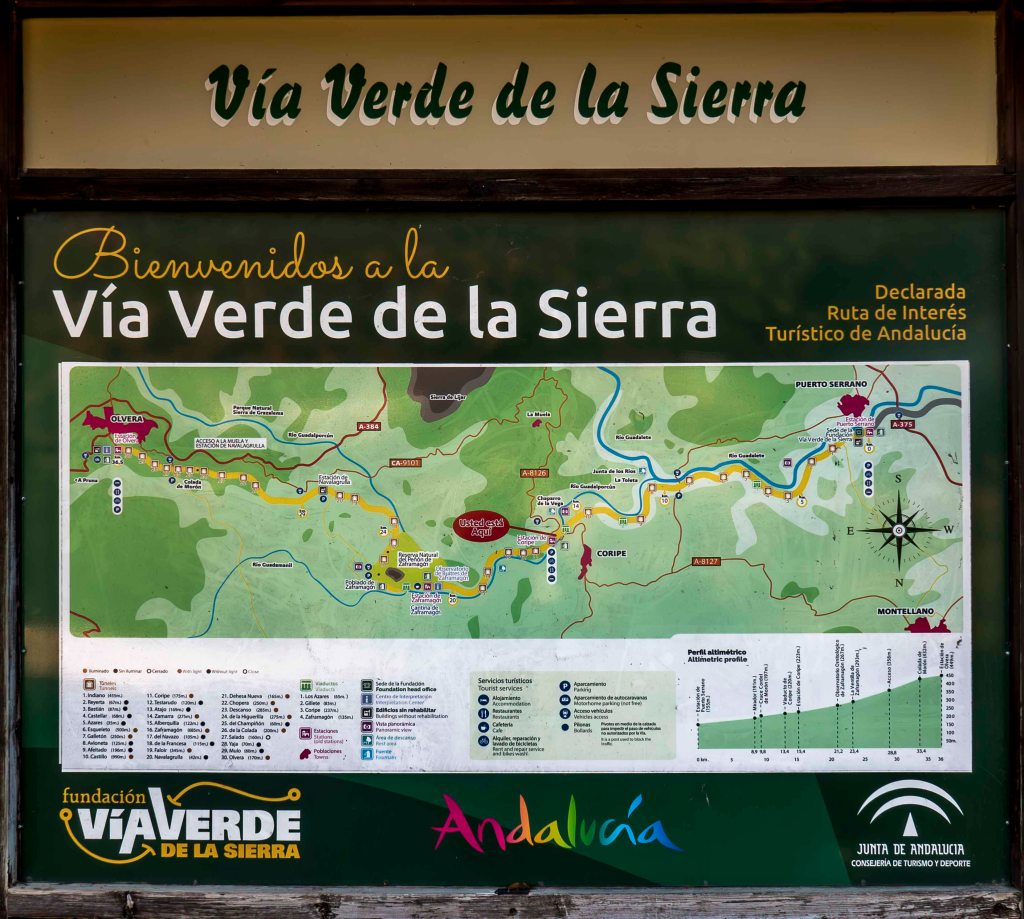 Etwas abseits der Hauptroute finden wir bei einem verfallenen Bahnhof einen stillen Platz. Hier führte einst die Eisenbahnstrecke von Porto Serano nach Olvera vorbei, Jetzt, als Via Verde de la Sierra, ist sie für Wanderer und Radfahrer gut ausgebaut. Der längste Tunnel ist 990 m lang und bei Durchfahrt beleuchtet. Bei den unbeleuchteten Tunnel gilt eine Höchstgeschwindigkeit von 10 km/h. Gemütlich lassen sich die 300 Höhenmeter hinunter, aber auch hinauf, fahren. Über den Felsgipfeln drehen bestimmt 50 Geier ihre ruhigen Runden in der Thermik. Es ist immer wieder faszinierend ihnen zuzuschauen. Wir fragen uns nur, von was diese großen Vögel leben, gibt es hier doch kaum Wild.