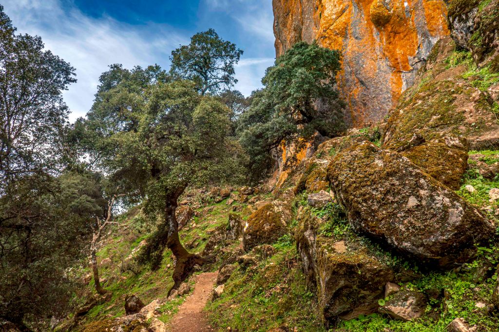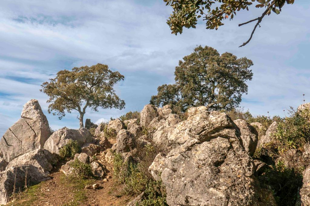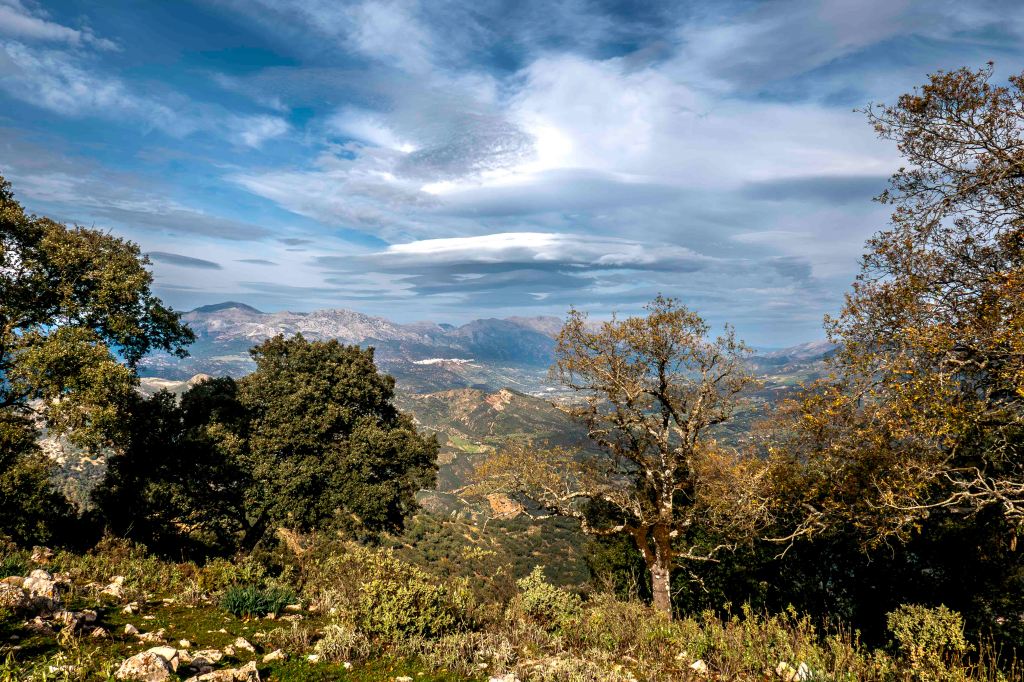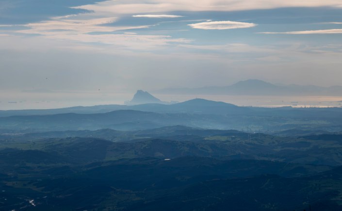 Nahe der Ortschaft Gaucín finden wir einen Platz mit einem ersten Blick auf das Meer, Gibraltar und Afrika. Über uns, am Hacho de Gaucín, schweben erneut Dutzende Geier. Ein gut ausgeschilderter Rundweg führt hinauf zu dem 1011 m hohen Felsplateau. Es ist fast wie eine Bergtour; der Pfad ist gut ausgebaut und verläuft steil durch ein Felsenlabyrinth und einen Korkeichenwald mit vielen alten, knorrigen Bäumen. Oben weht ein kalter Wind, der über der Sierra Ronda riesige Lenticularis-Wolken bildet. Der Blick vom Gipfel reicht in alle Richtungen, verstreut  liegen weiße Dörfer in der Gebirgslandschaft, die Geier gleiten ruhig im starken Aufwind. Vom Meer nähern sich Regenwolken, und in der Nacht regnet es zeitweise recht stark.