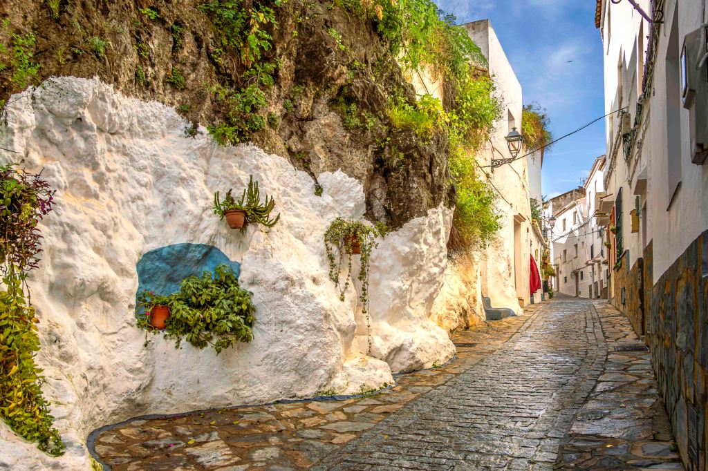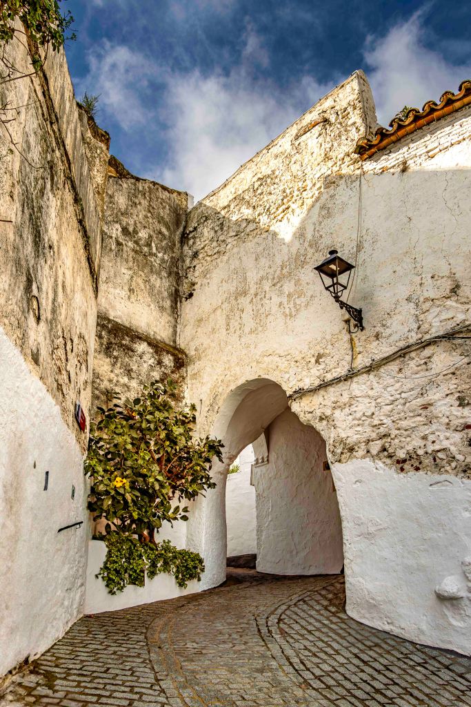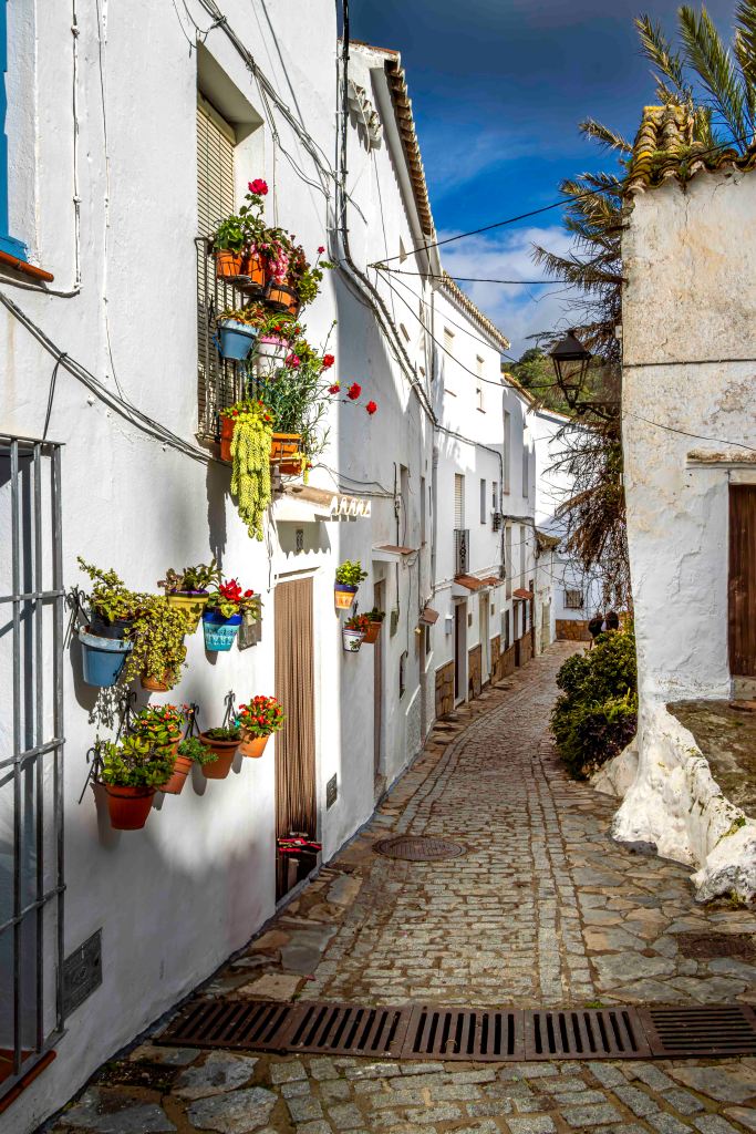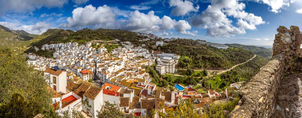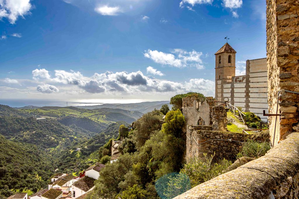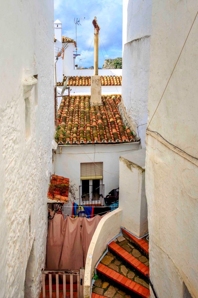 Im strömenden Regen verlassen wir Gaucín und fahren ins nächst weiße Dorf, nach Casares. Am Mittag reißt der stürmische Wind den Himmel auf und vertreibt die Wolken. Das Dorf liegt über einer steilen Felsenklippe und eingebettet in einer windgeschützten „Mulde“. Schön ist der Spaziergang durch die engen, blumengeschmückten Gassen hinauf zu den windumtosten Resten einer maurischen Burg.