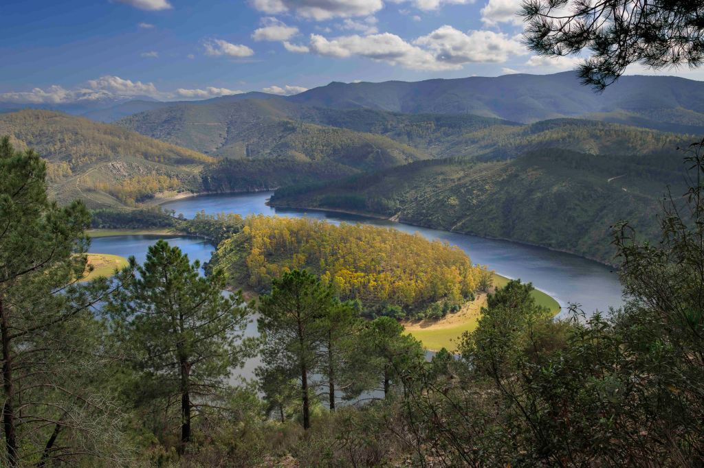 Wir erreichen den Weiler Riomalo de Abajo. Nachdem wir uns die kleine Straße nicht weiterfahren trauen, bleiben wir am Ortsrand am Río Ladrillar stehen. Im Sommer wird daraus vermutlich ein Flußbad, wie wir es häufig in Portugal sahen. Peter will sich das Naturschauspiel am Ende der Straße nicht entgehen lassen und wandert die drei Kilometer hinauf um Aussichtspunkt Mirador El Meandro del Melero. Der Río Alagón bildet hier eine perfekte Schleife, besser kann es die Mosel auch nicht. Am heutigen Sonntag sind viele spanische Ausflügler unterwegs, der obere Parkplatz deshalb natürlich belegt. So war es doch eine gute Entscheidung, im Ort zu bleiben.